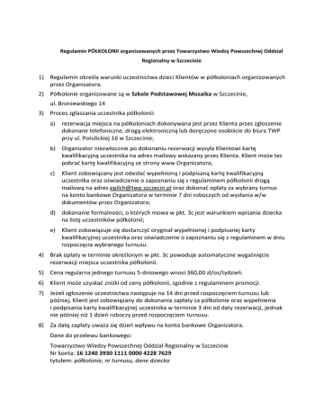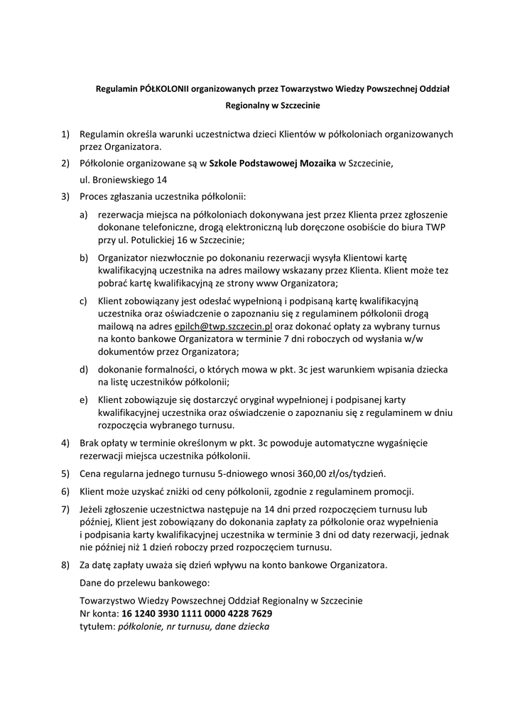 Regulamin PÓŁKOLONII organizowanych przez Towarzystwo Wiedzy Powszechnej Oddział Regionalny w Szczecinie 1) Regulamin określa warunki uczestnictwa dzieci Klientów w półkoloniach organizowanych przez Organizatora. 2) Półkolonie organizowane są w Szkole Podstawowej Mozaika w Szczecinie, ul. Broniewskiego 14 3) Proces zgłaszania uczestnika półkolonii: a) rezerwacja miejsca na półkoloniach dokonywana jest przez Klienta przez zgłoszenie dokonane telefoniczne, drogą elektroniczną lub doręczone osobiście do biura TWP przy ul. Potulickiej 16 w Szczecinie; b) Organizator niezwłocznie po dokonaniu rezerwacji wysyła Klientowi kartę kwalifikacyjną uczestnika na adres mailowy wskazany przez Klienta. Klient może tez pobrać kartę kwalifikacyjną ze strony www Organizatora; c) Klient zobowiązany jest odesłać wypełnioną i podpisaną kartę kwalifikacyjną uczestnika oraz oświadczenie o zapoznaniu się z regulaminem półkolonii drogą mailową na adres [email protected] oraz dokonać opłaty za wybrany turnus na konto bankowe Organizatora w terminie 7 dni roboczych od wysłania w/w dokumentów przez Organizatora; d) dokonanie formalności, o których mowa w pkt. 3c jest warunkiem wpisania dziecka na listę uczestników półkolonii; e) Klient zobowiązuje się dostarczyć oryginał wypełnionej i podpisanej karty kwalifikacyjnej uczestnika oraz oświadczenie o zapoznaniu się z regulaminem w dniu rozpoczęcia wybranego turnusu. 4) Brak opłaty w terminie określonym w pkt. 3c powoduje automatyczne wygaśnięcie rezerwacji miejsca uczestnika półkolonii. 5) Cena regularna jednego turnusu 5-dniowego wnosi 360,00 zł/os/tydzień. 6) Klient może uzyskać zniżki od ceny półkolonii, zgodnie z regulaminem promocji. 7) Jeżeli zgłoszenie uczestnictwa następuje na 14 dni przed rozpoczęciem turnusu lub później, Klient jest zobowiązany do dokonania zapłaty za półkolonie oraz wypełnienia i podpisania karty kwalifikacyjnej uczestnika w terminie 3 dni od daty rezerwacji, jednak nie później niż 1 dzień roboczy przed rozpoczęciem turnusu. 8) Za datę zapłaty uważa się dzień wpływu na konto bankowe Organizatora. Dane do przelewu bankowego: Towarzystwo Wiedzy Powszechnej Oddział Regionalny w Szczecinie Nr konta: 16 1240 3930 1111 0000 4228 7629 tytułem: półkolonie, nr turnusu, dane dziecka 9) Klient ma prawo do rezygnacji z udziału w półkoloniach. Za dzień rezygnacji uważa się dzień doręczenia Organizatorowi pisma zawierającego oświadczenie o rezygnacji z udziału w półkoloniach. 10) W przypadku rezygnacji z półkolonii do 7 dni przed datą ich rozpoczęcia, organizator dokonuje zwrotu wpłaconej kwoty, po potrąceniu kosztów manipulacyjnych w wysokości 25% wpłaty. 11) W przypadku rezygnacji w terminie krótszym niż 7 dni przed rozpoczęciem lub w czasie trwania półkolonii uczestnikowi nie przysługuje zwrot wpłaconej kwoty. 12) Niewykorzystanie części zajęć i rezygnacja z półkolonii w trakcie turnusu nie uprawnia do ubiegania się o zwrot części kosztów. 13) Organizator zastrzega sobie prawo do odwołania danego turnusu półkolonii w przypadku zaistnienia okoliczności niezależnych od Organizatora. 14) Organizator zastrzega sobie prawo odwołania turnusu półkolonii z powodu zbyt małej liczby uczestników (wymagane minimum to 12 osób na turnusie), o czym Klient zostanie niezwłocznie poinformowany drogą pisemną lub elektroniczną, jednak nie później niż 3 dni robocze przed rozpoczęciem turnusu. 15) W przypadku odwołania Półkolonii z przyczyn opisanych w pkt. 13 i 14 Klient ma prawo do: a) zwrotu całości wniesionych opłat (bez odsetek) lub prawo do skorzystania z innego turnusu na zasadach pierwszeństwa w przypadku odwołania półkolonii przed rozpoczęciem turnusu, b) zwrotu wniesionych opłat proporcjonalnie do niewykorzystanych dni turnusu. 16) Półkolonie organizowane są w turnusach tygodniowych od poniedziałku do piątku 17) Dzienny czas pobytu dziecka na półkolonii trwa od godziny 7:30 do godziny 16:30. W tym czasie Organizator sprawuje opiekę na uczestnikami półkolonii (wykwalifikowana kadra). 18) Podczas dziennego pobytu dziecka na półkolonii Organizator zobowiązuje się: a) przeprowadzić zajęcia zgodnie z programem półkolonii i harmonogramem dnia b) zapewnić 2 posiłki dziennie: ciepły posiłek oraz podwieczorek. 19) Półkolonie przewidziane są dla dzieci w wieku od 6 do 12 lat. Zajęcia będą odbywać się w grupach maksymalnie 15 - osobowych. Organizator nie ponosi odpowiedzialności za ewentualne szkody wynikające z udziału w zajęciach (np. zabrudzenia ubrań). 20) Organizator nie odpowiada za rzeczy zagubione przez uczestników półkolonii w czasie półkolonii oraz za zniszczenia rzeczy należących do uczestników, a dokonanych przez innych uczestników – odpowiedzialność rodziców . 21) Organizator nie zaleca przynosić na półkolonie cennych urządzeń i przedmiotów wartościowych (telefony, laptopy, tablety, odtwarzacze muzyki itp.) i nie bierze odpowiedzialności za tego typu przedmioty. 22) Organizator zapewnia uczestnikom ubezpieczenie NNW zgodnie z warunkami ubezpieczenia firmy ubezpieczającej. 23) Organizator zobowiązuje się do natychmiastowego powiadomienia Rodziców/Opiekunów o zaistniałych wypadkach, urazach i problemach wychowawczych. 24) Rodzice/Opiekunowie: a) Są zobowiązani do punktualnego przyprowadzania i odbierania dzieci zgodnie z planem zajęć. Dzieci na zajęcia zgłaszają się do godziny 9:00. Wskazane jest, aby przed przybyciem na półkolonie dzieci w domu zjadły śniadanie. Opiekun zobowiązany jest do odebrania dziecka z półkolonii do godziny 16:30. b) Są odpowiedzialni za bezpieczną drogę dziecka do/z miejsca organizowania półkolonii. c) W razie konieczności są zobowiązani napisać pisemne upoważnienie dla osób, które mogą odbierać dziecko z półkolonii i załączyć je do karty kwalifikacyjnej. 25) Uczestnicy półko
