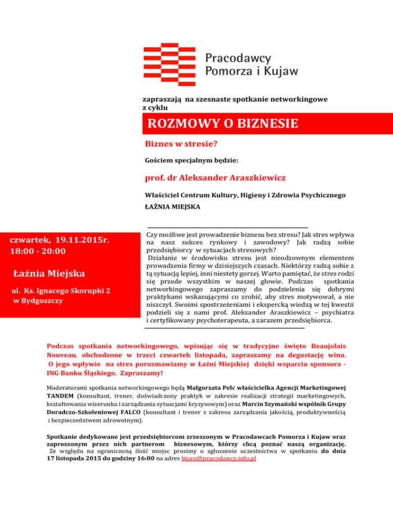 zapraszają na szesnaste spotkanie networkingowe z cyklu ROZMOWY O BIZNESIE Biznes w stresie? Gościem specjalnym będzie: prof. dr Aleksander Araszkiewicz Właściciel Centrum Kultury, Higieny i Zdrowia Psychicznego ŁAŹNIA MIEJSKA czwartek, 19.11.2015r. 18:00 - 20:00 Łaźnia Miejska ul. Ks. Ignacego Skorupki 2 w Bydgoszczy Czy możliwe jest prowadzenie biznesu bez stresu? Jak stres wpływa na nasz sukces rynkowy i zawodowy? Jak radzą sobie przedsiębiorcy w sytuacjach stresowych? Działanie w środowisku stresu jest nieodzownym elementem prowadzenia firmy w dzisiejszych czasach. Niektórzy radzą sobie z tą sytuacją lepiej, inni niestety gorzej. Warto pamiętać, że stres rodzi się przede wszystkim w naszej głowie. Podczas spotkania networkingowego zapraszamy do podzielenia się dobrymi praktykami wskazującymi co zrobić, aby stres motywował, a nie niszczył. Swoimi spostrzeżeniami i ekspercką wiedzą w tej kwestii podzieli się z nami prof. Aleksander Araszkiewicz – psychiatra i certyfikowany psychoterapeuta, a zarazem przedsiębiorca. Podczas spotkania networkingowego, wpisując się w tradycyjne święto Beaujolais Nouveau, obchodzone w trzeci czwartek listopada, zapraszamy na degustację wina. O jego wpływie na stres porozmawiamy w Łaźni Miejskiej dzięki wsparciu sponsora ING Banku Śląskiego. Zapraszamy! Moderatorami spotkania networkingowego będą Małgorzata Pelc właścicielka Agencji Marketingowej TANDEM (konsultant, trener, doświadczony praktyk w zakresie realizacji strategii marketingowych, kształtowania wizerunku i zarządzania sytuacjami kryzysowym) oraz Marcin Szymański wspólnik Grupy Doradczo-Szkoleniowej FALCO (konsultant i trener z zakresu zarządzania jakością, produktywnością i bezpieczeństwem zdrowotnym). Spotkanie dedykowane jest przedsiębiorcom zrzeszonym w Pracodawcach Pomorza i Kujaw oraz zaproszonym przez nich partnerom biznesowym, którzy chcą poznać naszą organizację. Ze względu na ograniczoną ilość miejsc prosimy o zgłoszenie uczestnictwa w spotkaniu do dnia 17 listopada 2015 do godziny 16:00 na adres [email protected]