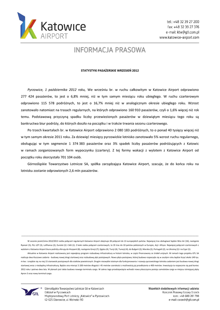 STATYSTYKI PASAŻERSKIE WRZESIEŃ 2012 Pyrzowice, 1 października 2012 roku, We wrześniu br. w ruchu całkowitym w Katowice Airport odprawiono 277 424 pasażerów, to jest o 6,8% mniej, niż w tym samym miesiącu roku ubiegłego. W ruchu czarterowym odprawiono 115 578 podróżnych, to jest o 16,7% mniej niż w analogicznym okresie ubiegłego roku. Wzrost zanotowało natomiast na trasach regularnych, na których odprawiono 160 910 pasażerów, czyli o 1,6% więcej niż rok temu. Podstawową przyczyną spadku liczby przewiezionych pasażerów w dziewiątym miesiącu tego roku są bankructwa biur podróży, do których doszło na początku i w trakcie trwania sezonu czarterowego. Po trzech kwartałach br. w Katowice Airport odprawiono 2 080 183 podróżnych, to o ponad 40 tysięcy więcej niż w tym samym okresie 2011 roku. Za dziewięć miesięcy pyrzowickie lotnisko zanotowało 5% wzrost ruchu regularnego, obsługując w tym segmencie 1 374 383 pasażerów oraz 3% spadek liczby pasażerów podróżujących z Katowic w ramach zorganizowanych form wypoczynku (czartery). Z tej formy wakacji z wylotem z Katowice Airport od początku roku skorzystało 701 104 osób. Górnośląskie Towarzystwo Lotnicze SA, spółka zarządzająca Katowice Airport, szacuje, że do końca roku na lotnisku zostanie odprawionych 2,6 mln pasażerów. -----------------------------------------------------------------------------------------------------------------------------------------------------------------------------W sezonie jesień/zima 2012/2013 siatka połączeń regularnych Katowice Airport obejmuje 28 połączeń do 13 europejskich państw. Najwięcej tras obsługiwać będzie Wizz Air (16), następnie Ryanair (5), PLL LOT (3), Lufthansa (2), Eurolot (1) i SAS (1). Z kolei siatka połączeń czarterowych, to 35 tras do 10 państw położonych w Europie, Azji i Afryce. Najwięcej połączeń czarterowych z wylotem z Katowice Airport biura podróży oferują do Hiszpanii (8), następnie Grecji (7), Egiptu (4), Turcji (4), Tunezji (4), do Bułgarii (2), Maroka (2), Portugalii (2), na Ukrainę (1) i na Cypr (1). Aktualnie w Katowice Airport realizowany jest największy program rozbudowy infrastruktury w historii lotniska, w części finansowany ze źródeł unijnych. W ramach tego projektu GTL SA realizuje dwa kluczowe zadania - budowę nowej drogi startowej oraz rozbudowę płyt postojowych. Nowa płyta postojowa, której budowa rozpoczęła się w zeszłym roku będzie liczyć około 149 tys. m kw. i znajdzie się na niej 15 stanowisk postojowych dla statków powietrznych. Drugim niezwykle istotnym dla funkcjonowania i rozwoju pyrzowickiego lotniska zadaniem jest budowa nowej drogi startowej wraz z niezbędną infrastrukturą. Będzie ona mierzyć 3 200 metrów długości i 45 metrów szerokości z możliwością jej przedłużenia o 400 metrów. Inwestycja ta rozpocznie się pod koniec 2012 roku i potrwa dwa lata. W planach jest także budowa nowego terminalu cargo. W zakres tego przedsięwzięcia wchodzi nowa płaszczyzna postoju samolotów cargo w miejscu istniejącej płyty Apron 3 oraz nowy terminal cargo.