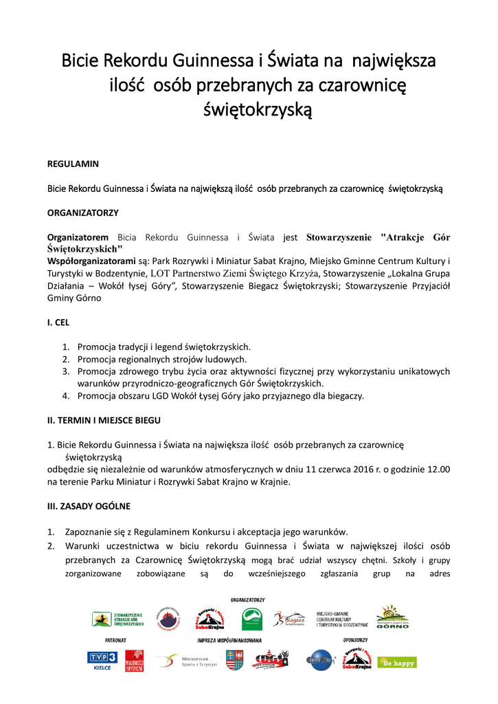 Bicie Rekordu Guinnessa i Świata na największa ilość osób przebranych za czarownicę świętokrzyską REGULAMIN Bicie Rekordu Guinnessa i Świata na największą ilość osób przebranych za czarownicę świętokrzyską ORGANIZATORZY Organizatorem Bicia Rekordu Guinnessa i Świata jest Stowarzyszenie "Atrakcje Gór Świętokrzyskich" Współorganizatorami są: Park Rozrywki i Miniatur Sabat Krajno, Miejsko Gminne Centrum Kultury i Turystyki w Bodzentynie, LOT Partnerstwo Ziemi Świętego Krzyża, Stowarzyszenie „Lokalna Grupa Działania – Wokół łysej Góry”, Stowarzyszenie Biegacz Świętokrzyski; Stowarzyszenie Przyjaciół Gminy Górno I. CEL 1. Promocja tradycji i legend świętokrzyskich. 2. Promocja regionalnych strojów ludowych. 3. Promocja zdrowego trybu życia oraz aktywności fizycznej przy wykorzystaniu unikatowych warunków przyrodniczo-geograficznych Gór Świętokrzyskich. 4. Promocja obszaru LGD Wokół Łysej Góry jako przyjaznego dla biegaczy. II. TERMIN I MIEJSCE BIEGU 1. Bicie Rekordu Guinnessa i Świata na największa ilość osób przebranych za czarownicę świętokrzyską odbędzie się niezależnie od warunków atmosferycznych w dniu 11 czerwca 2016 r. o godzinie 12.00 na terenie Parku Miniatur i Rozrywki Sabat Krajno w Krajnie. III. ZASADY OGÓLNE 1. 2. Zapoznanie się z Regulaminem Konkursu i akceptacja jego warunków. Warunki uczestnictwa w biciu rekordu Guinnessa i Świata w największej ilości osób przebranych za Czarownicę Świętokrzyską mogą brać udział wszyscy chętni. Szkoły i grupy zorganizowane zobowiązane są do wcześniejszego zgłaszania grup na adres [email protected]. 3. Warunkiem sklasyfikowania uczestnika jest posiadanie stroju czarownicy składającego się z: czarnego sięgającego ziemi kostiumu (czarna peleryna) czarnego szpiczastego kapelusza z szerokim rondem, lub regionalnej chustki na głowę miotły dopuszcza się dodatki w kolorze czerwonym Wygląd i wykonanie stroju zależy od wyobraźni i kreatywności uczestników, ważne aby spełniał tylko powyższe warunki! IV. ZGŁOSZENIA 1. Biuro Bicia Rekordu Guinnessa i Świata na największa ilość osób przebranych za czarownicę świętokrzyską mieścić się będzie na terenie Parku Miniatur i Rozrywki Sabat Krajno Otwarte: a) 11.06.2016 r. (sobota) w godzinach 12.00 - 14.00 2. Zgłoszenia uczestnictwa w Biciu Rekordu Guinnessa i Świata na największa ilość osób przebranych za czarownicę świętokrzyską można dokonać poprzez: - wysłanie do dnia 6.06.2016 r. do godziny 12.00 prawidłowo wypełnionego formularza zgłoszeniowego on-line na adres [email protected] – informacja o dostępie do formularza znaleźć można na stronie www.sabatkrajno.pl oraz www.wokollysejgory.pl w odpowiedniej zakładce 3. Każda zgłoszona grupa zobowiązana jest w Biurze Bicia Rekordu potwierdzić przybycie na teren Parku Rozrywki i Miniatur Sabat Krajno. 4. Wszystkie informacje dotyczące Uczestników, uzyskane z Formularza Zgłoszenia, które pozwolą zidentyfikować poszczególnych Uczestników, zostaną zapisane w sposób elektroniczny i w każdym wypadku będą używane zgodnie z „Ustawą o ochronie danych osobowych” z dnia 29 sierpnia 1997 roku (Dz. U. Nr 133, poz. 883 ze zmianami). Stowarzyszenie „Lokalna Grupa Działania – Wokół Łysej Góry” oraz współorganizatorzy nie będą ujawniać takich informacji osobom trzecim. 5. Organizator zastrzega sobie, a także podmiotom z nim powiązanym, prawo do przeprowadzenia z każdym z Uczestników wywiadów, robienia zdjęć i/lub filmowania, używania imion i nazwisk, wizerunku, głosu oraz innych materiałów pochodzących lub związanych z uczestnictwem z Biciem Rekordu Guinnessa i Świata na potrzeby reklamowe, promocyjne, a także możliwość ich wykorzystania w Internecie lub transmisjach radiowo-telewizyjnych oraz na wszelkie inne potrzeby komercyjne z prawem do ich modyfikowania. Organizator zastrzega sobie, a także podmiotom powiązanym prawo do nieodpłatnego wykorzystania wszelkich zdjęć, materiałów filmowych, wywiadów i nagrań przedstawiających Uczestników, które mogą być bezpłatnie umieszczane na wybranych nośnikach elektronicznych, katalogach oraz mediach: telewizja, radio, gazety, magazyny, strony internetowe na potrzeby reklamowe i promocyjne. Uczestnik oświadcza, że Organizator nie jest i nie będzie zobligowany do uiszczenia jakichkolwiek opłat związanych z działaniami opisanymi w niniejszym punkcie, udzielając tym samym nieograniczonej licencji na używanie wypowiedzi, swojego wizerunku, informacji bez powiadomienia w celu reklamy i promocji wydarzenia oraz innych wydarzeń organizowanych przez Stowarzyszenie „Lokalna Grupa Działania – Wokół Łysej Góry”. 6. Organizator zastrzega sobie prawo do odwołania Bicia Rekordu Guinnessa i Świata na największą ilość osób przebranych za czarownicę świętokrzyską lub jego przerwania bez podania przyczyn. V. POSTANOWIENIA KOŃCOWE 1. Ze względów bezpieczeństwa w Biciu Rekordu Guinnessa i Świata na największa ilość osób przebranych za czarownicę świętokrzyską zabroniony jest udział osób poruszających się na rowerach, wrotkach, rolkach, deskorolkach. Zabrania się wnoszenia na trasę biegu przedmiotów, które mogą być niebezpieczne dla innych Uczestników. Uczestnik zobowiązany jest do przestrzegania wszelkich zasad i przepisów, które mają zastosowanie do uczestnictwa w Biciu Rekordu Guinnessa na największa ilość osób przebranych za czarownicę świętokrzyską, w szczególności zasad fair play oraz niniejszego regulaminu. 2. W czasie trwania Bicia Rekordu Guinnessa i Świata na największą ilość osób przebranych za czarownicę świętokrzyską uczestnicy powinni stosować się do poleceń osób odpowiedzialnych za bezpieczeństwo, służb porządkowych i osób działających w imieniu organizatora 3. Zabrania się uczestnictwa osób w Biciu Rekordu Guinnessa i Świata na największa il