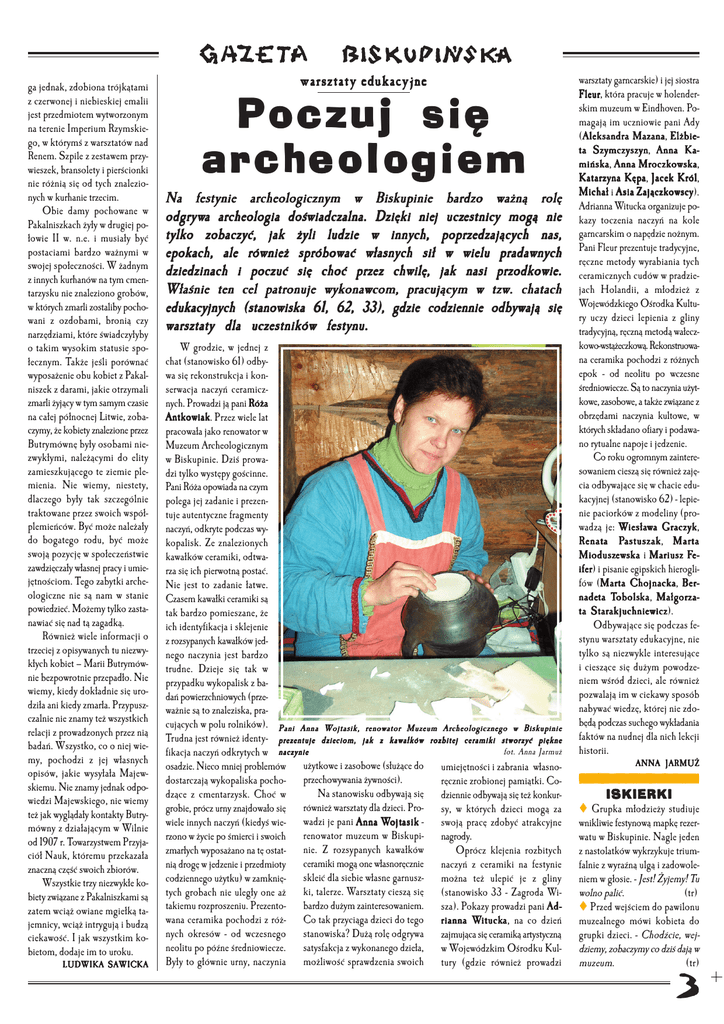 ga jednak, zdobiona trójkątami z czerwonej i niebieskiej emalii jest przedmiotem wytworzonym na terenie Imperium Rzymskiego, w którymś z warsztatów nad Renem. Szpile z zestawem przywieszek, bransolety i pierścionki nie różnią się od tych znalezionych w kurhanie trzecim. Obie damy pochowane w Pakalniszkach żyły w drugiej połowie II w. n.e. i musiały być postaciami bardzo ważnymi w swojej społeczności. W żadnym z innych kurhanów na tym cmentarzysku nie znaleziono grobów, w których zmarli zostaliby pochowani z ozdobami, bronią czy narzędziami, które świadczyłyby o takim wysokim statusie społecznym. Także jeśli porównać wyposażenie obu kobiet z Pakalniszek z darami, jakie otrzymali zmarli żyjący w tym samym czasie na całej północnej Litwie, zobaczymy, że kobiety znalezione przez Butrymównę były osobami niezwykłymi, należącymi do elity zamieszkującego te ziemie plemienia. Nie wiemy, niestety, dlaczego były tak szczególnie traktowane przez swoich współplemieńców. Być może należały do bogatego rodu, być może swoją pozycję w społeczeństwie zawdzięczały własnej pracy i umiejętnościom. Tego zabytki archeologiczne nie są nam w stanie powiedzieć. Możemy tylko zastanawiać się nad tą zagadką. Również wiele informacji o trzeciej z opisywanych tu niezwykłych kobiet – Marii Butrymównie bezpowrotnie przepadło. Nie wiemy, kiedy dokładnie się urodziła ani kiedy zmarła. Przypuszczalnie nie znamy też wszystkich relacji z prowadzonych przez nią badań. Wszystko, co o niej wiemy, pochodzi z jej własnych opisów, jakie wysyłała Majewskiemu. Nie znamy jednak odpowiedzi Majewskiego, nie wiemy też jak wyglądały kontakty Butrymówny z działającym w Wilnie od 1907 r. Towarzystwem Przyjaciół Nauk, któremu przekazała znaczną część swoich zbiorów. Wszystkie trzy niezwykłe kobiety związane z Pakalniszkami są zatem wciąż owiane mgiełką tajemnicy, wciąż intrygują i budzą ciekawość. I jak wszystkim kobietom, dodaje im to uroku. LUDWIKA SAWICKA warsztaty edukacyjne Poczuj się archeologiem Na festynie archeologicznym w Biskupinie bardzo ważną rolę odgryw ywaa archeologia doś doświadczalna. niejj ucz uczestnicy odgr yw wiadczalna. Dzięki nie estnicy mogą nie tylko zobaczyć, jak żyli ludzie w innych, poprzedzających nas, epokach, ale również spróbować własnych sił w wielu pradawnych dziedzinach i poczuć się choć przez chwilę, jak nasi przodkowie. Właśnie ten cel patronuje wykonawcom, pracującym w tzw. chatach edukacyjnych (stanowiska 61, 62, 33), gdzie codziennie odbywają się warsztaty dla uczestników festynu. W grodzie, w jednej z chat (stanowisko 61) odbywa się rekonstrukcja i konserwacja naczyń ceramicznych. Prowadzi ją pani Róża Antkowiak Antkowiak. Przez wiele lat pracowała jako renowator w Muzeum Archeologicznym w Biskupinie. Dziś prowadzi tylko występy gościnne. Pani Róża opowiada na czym polega jej zadanie i prezentuje autentyczne fragmenty naczyń, odkryte podczas wykopalisk. Ze znalezionych kawałków ceramiki, odtwarza się ich pierwotną postać. Nie jest to zadanie łatwe. Czasem kawałki ceramiki są tak bardzo pomieszane, że ich identyfikacja i sklejenie z rozsypanych kawałków jednego naczynia jest bardzo trudne. Dzieje się tak w przypadku wykopalisk z badań powierzchniowych (przeważnie są to znaleziska, pracujących w polu rolników). Pani Anna Wojtasik, renowator Muzeum Archeologicznego w Biskupinie Trudna jest również identy- prezentuje dzieciom, jak z kawałków rozbitej ceramiki stworzyć piękne fot. Anna Jarmuż fikacja naczyń odkrytych w naczynie osadzie. Nieco mniej problemów użytkowe i zasobowe (służące do umiejętności i zabrania własnodostarczają wykopaliska pocho- przechowywania żywności). ręcznie zrobionej pamiątki. CoNa stanowisku odbywają się dziennie odbywają się też konkurdzące z cmentarzysk. Choć w grobie, prócz urny znajdowało się również warsztaty dla dzieci. Pro- sy, w których dzieci mogą za asik - swoją pracę zdobyć atrakcyjne Woojt jtasik wiele innych naczyń (kiedyś wie- wadzi je pani Anna W rzono w życie po śmierci i swoich renowator muzeum w Biskupi- nagrody. zmarłych wyposażano na tę ostat- nie. Z rozsypanych kawałków Oprócz klejenia rozbitych nią drogę w jedzenie i przedmioty ceramiki mogą one własnoręcznie naczyń z ceramiki na festynie codziennego użytku) w zamknię- skleić dla siebie własne garnusz- można też ulepić je z gliny tych grobach nie uległy one aż ki, talerze. Warsztaty cieszą się (stanowisko 33 - Zagroda Witakiemu rozproszeniu. Prezento- bardzo dużym zainteresowaniem. sza). Pokazy prowadzi pani A dwana ceramika pochodzi z róż- Co tak przyciąga dzieci do tego rianna W ituck Wituck ituckaa , na co dzień nych okresów - od wczesnego stanowiska? Dużą rolę odgrywa zajmująca się ceramiką artystyczną neolitu po późne średniowiecze. satysfakcja z wykonanego dzieła, w Wojewódzkim Ośrodku KulByły to głównie urny, naczynia możliwość sprawdzenia swoich tury (gdzie również prowadzi warsztaty garncarskie) i jej siostra Fleur, która pracuje w holenderFleur skim muzeum w Eindhoven. Pomagają im uczniowie pani Ady Aleksandra Mazana (Aleksandra Mazana, Elżbieta Szymczyszyn Szymczyszyn, Anna Kamińska mińska, Anna Mroczkowska Mroczkowska, Katarzyna Kępa Kępa, Jacek Król Król, Michał i Asia Zajączkowscy Zajączkowscy). Adrianna Witucka organizuje pokazy toczenia naczyń na kole garncarskim o napędzie nożnym. Pani Fleur prezentuje tradycyjne, ręczne metody wyrabiania tych ceramicznych cudów w pradziejach Holandii, a młodzież z Wojewódzkiego Ośrodka Kultury uczy dzieci lepienia z gliny tradycyjną, ręczną metodą wałeczkowo-wstążeczkową. Rekonstruowana ceramika pochodzi z różnych epok - od neolitu po wczesne średniowiecze. Są to naczynia użytkowe, zasobowe, a także związane z obrzędami naczynia kultowe, w których składan