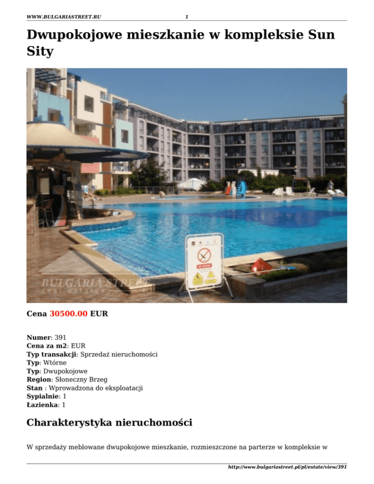 WWW.BULGARIASTREET.RU 1 Dwupokojowe mieszkanie w kompleksie Sun Sity Cena 30500.00 EUR Numer: 391 Cena za m2: EUR Typ transakcji: Sprzedaż nieruchomości Typ: Wtórne Typ: Dwupokojowe Region: Słoneczny Brzeg Stan : Wprowadzona do eksploatacji Sypialnie: 1 Łazienka: 1 Charakterystyka nieruchomości W sprzedaży meblowane dwupokojowe mieszkanie, rozmieszczone na parterze w kompleksie w http://www.bulgariastreet.pl/pl/estate/view/391 WWW.BULGARIASTREET.RU 2 komunikatywnym rejonie południowej części Słonecznego Brzegu w bezpośredniej bliskości od bardziej szerokiego w kurorcie plaży "Kakao Beach" 300 m od morza. Charakterystyka kompleksu: Kompleks ma w rozporządzeniu swój prywatny teren, co ochrania się, recepcję, jest bar, duży basen dla dorosłych i oddzielny dla dzieci, niewielki sklep. Niedaleko od domu znajduje się najpopularniejsze w rejonie miasto - muzeum Nesebr. Charakterystyka mieszkania: Mieszkanie składa się z; przedpokoju, sypialni, gościnnego pokoju, kąpielowego pokoju z węzłem sanitarnym i tarasu. Kompleks jest zdany do eksploatacji - jest akt 16 Infrastruktura ● ● ● ● ● ● ● ● ● ● ● ● Ochrona Sklep Internet Telewizja kablowa Basen odkryty Bar Recepcja Elektrczność Woda Okna PVC Meble Przypilnowane terytorium Informacje o regionie Największy kurort bułgarskiego czarnomorskiego nadbrzeża - Słoneczny Brzeg, rozmieszczony w zatoce między prastarym miastem Несебром i Świętym Własem. Międzynarodowy port lotniczy m. Burgas znajduje się na odległości 35 km, a port lotniczy Варны - do 95 km Klimat Słoneczny brzeg różni się sprzyjającym śródziemnomorskim klimatem. Lato jest słoneczne i gorące, średnia temperatura w lipcu składa 22-23 stopniów Celsjusza. Średnia temperatura morskiej wody 20-26 stopniów Celsjusza. W okres z maja miesiąca po października włącznie ilość słonecznych godzin istnieje więcej 1700. Słonecznemu brzegowi jest nadany Błękitny sztandar - międzynarodowa nagroda, która potwierdza, że woda i plaże odpowiadają najwyższym standardom i przydatne dla bezpiecznej kąpieli i odpoczynku. Plaże Słoneczny Brzeg ma w rozporządzeniu naprawdę zbytkowną plażę z drobnym złocistym piaskiem i bezpiecznym pochyłym zachodem w morze. Czysty, współcześnie wyposażony i taki, że ochrania się plaża jest prawdziwą chlubą kurortu. Na plaży są możliwości dla serfingu, przejażdżka na http://www.bulgariastreet.pl/pl/estate/view/391 WWW.BULGARIASTREET.RU 3 ślizgaczach i wodnych rowerach. Tu są zbudowane współczesne tenisowe korty. Skoki z spadochronem i wierzchowa jazda - dla Waszego zadowolenia! Infrastruktura Słoneczny brzeg ma doskonale opracowaną infrastrukturę. W tym kurorcie są wszystkie warunki dla rodzinnego, dziecięcego i młodzieżowego odpoczynku. Duża ilość parkowych terytoriów, co zadrzewia, ze strefami odpoczynku i dziecięcymi placykami jest bezsprzeczną przewagą kurortu. W kompleksie są trenażery sale, sauny, pływalnie dla dorosłych i dzieci, masażowe gabinety, salony piękności i medyczne centra. Duża ilość rozmaitych restauracji i kawiarń, co proponuje internacjonalną i bułgarską kuchnię, poza wątpliwością, ucieszy smakoszy. Młodzież we właściwy sposób oceni nocne kluby, modne dyskoteki, varietesy i bary z żywą muzyką. Dla amatorów aktywnego odpoczynek i sportu są stworzone liczne warunki. http://www.bulgariastreet.pl/pl/estate/view/391 WWW.BULGARIASTREET.RU 4 Kontakty Agencja "Ulica Bułgarska" (Bulgaria Street Ltd) Bułgaria m. Burgas, 8000 ul. Mitropolit Simeon 3 Strona: www.bulgariastreet.ru Tel: + 359 894 51 50 51 Tel: + 48 223 906 334 Mail: [email protected] Mail: [email protected] Skype: bulstreet http://www.bulgariastreet.pl/pl/estate/view/391