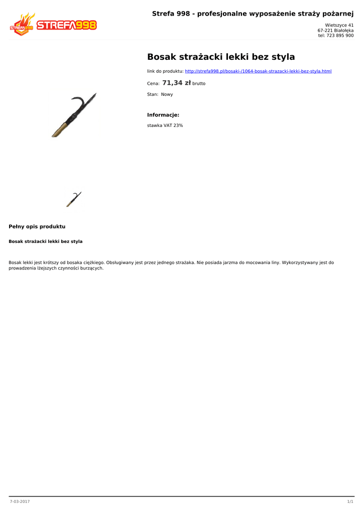 Strefa 998 - profesjonalne wyposażenie straży pożarnej Wietszyce 41 67-221 Białołęka tel: 723 895 900 Bosak strażacki lekki bez styla link do produktu: http://strefa998.pl/bosaki-/1064-bosak-strazacki-lekki-bez-styla.html Cena: 71,34 zł brutto Stan: Nowy Informacje: stawka VAT 23% Pełny opis produktu Bosak strażacki lekki bez styla Bosak lekki jest krótszy od bosaka ciężkiego. Obsługiwany jest przez jednego strażaka. Nie posiada jarzma do mocowania liny. Wykorzystywany jest do prowadzenia lżejszych czynności burzących. 7-03-2017 1/1