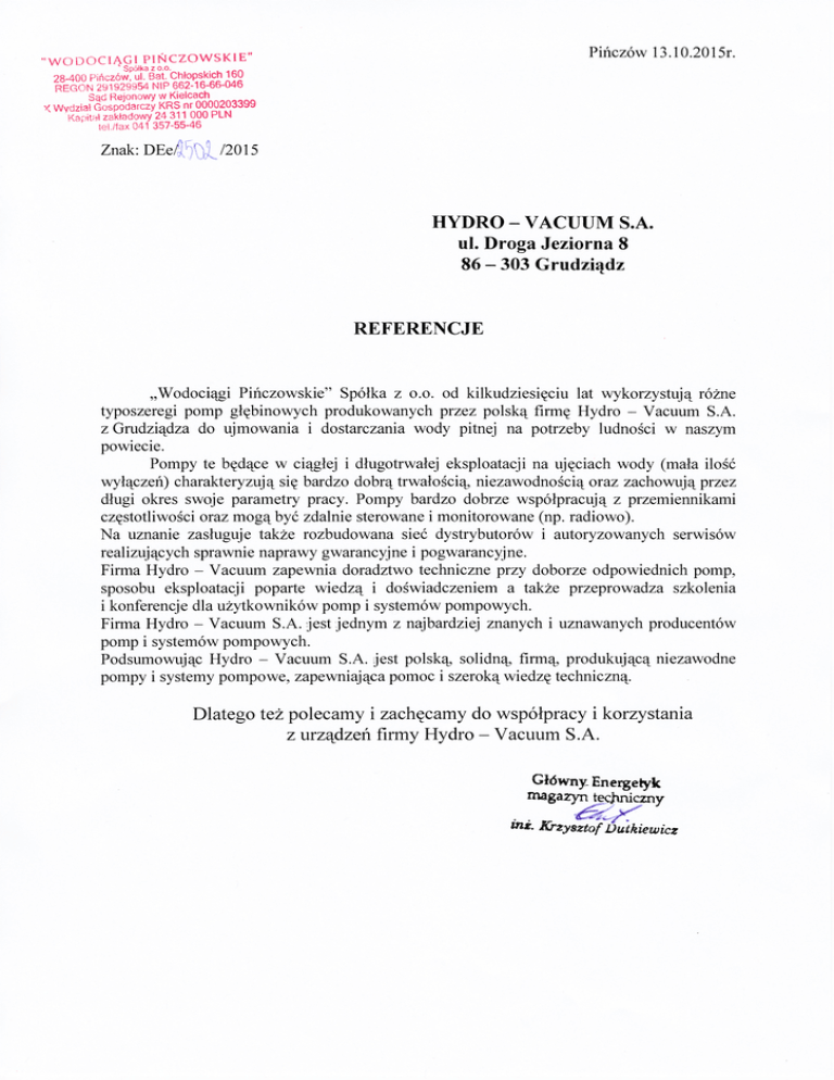 Pińczów 13.10.2015r. "WODOCIĄGI PIŃCZOWSK1E" Spółka z o.o. . L 28-400 Pińczów, ul. Bat. Chłopskich 160 REGON 291929954 NIP 662-16-66-046 Sąd Rejonowy w Kielcach _ _ X Wydział Gospodarczy KRS nr 0000203399 Kapitał zakładowy 24 311 000 PLN te!./fax 041 357-55-46 Znak: DEe /2015 HYDRO - VACUUM S.A. ul. Droga Jeziorna 8 86 - 303 Grudziądz REFERENCJE „Wodociągi Pińczowskie" Spółka z o.o. od kilkudziesięciu lat wykorzystują różne typoszeregi pomp głębinowych produkowanych przez polską firmę Hydro - Vacuum S.A. z Grudziądza do ujmowania i dostarczania wody pitnej na potrzeby ludności w naszym powiecie. Pompy te będące w ciągłej i długotrwałej eksploatacji na ujęciach wody (mała ilość wyłączeń) charakteryzują się bardzo dobrą trwałością, niezawodnością oraz zachowują przez długi okres swoje parametry pracy. Pompy bardzo dobrze współpracują z przemiennikami częstotliwości oraz mogą być zdalnie sterowane i monitorowane (np. radiowo). Na uznanie zasługuje także rozbudowana sieć dystrybutorów i autoryzowanych serwisów realizujących sprawnie naprawy gwarancyjne i pogwarancyjne. Firma Hydro - Vacuum zapewnia doradztwo techniczne przy doborze odpowiednich pomp, sposobu eksploatacji poparte wiedzą i doświadczeniem a także przeprowadza szkolenia i konferencje dla użytkowników pomp i systemów pompowych. Firma Hydro - Vacuum S.A. jest jednym z najbardziej znanych i uznawanych producentów pomp i systemów pompowych. Podsumowując Hydro - Vacuum S.A. jest polską, solidną, firmą, produkującą niezawodne pompy i systemy pompowe, zapewniająca pomoc i szeroką wiedzę techniczną. Dlatego też polecamy i zachęcamy do współpracy i korzystania z urządzeń firmy Hydro - Vacuum S.A. Główny. Energetyk magazyn techniczny mir. Krzysztof Dutkiewicz