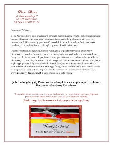 D ecoR isus ul. Wieniawskiego 7 58-316 Wałbrzych tel./fax 0-74 840 01 47 Szanowni Państwo, BoŜe Narodzenie to czas magiczny i zarazem najpiękniejsze święta , te które najbardziej lubimy. Wieńczą rok, wprawiają w zadumę i zachęcają do podsumowań i nowych postanowień. Warto wtedy pozdrowić swoich klientów, kontrahentów i partnerów handlowych wysyłając im ręcznie wykonywane kartki świąteczne. Kartki świąteczne odgrywają bardzo waŜną rolę w podtrzymywaniu stosunków biznesowych między firmami , czy teŜ w utrzymaniu dobrych relacji z pracownikami firmy. Kartki świąteczne z logo firmy budują podstawy oparte juŜ nie tylko na relacjach biznesowych i wspólnych interesach, ale na przyjaźni i wzajemnym zrozumieniu. Coraz większą popularnością w odniesieniu kartek świątecznych rozsyłanych przez firmy stanowi motyw umieszczenia na nich logo firmy, dzięki czemu kaŜda taka kartka stanie się niepowtarzalna i jedyna. Zapraszamy do odwiedzenia naszej strony internetowej www.prezenty.decorisus.pl i zapoznania się z całą ofertą. JeŜeli zdecydują się Państwo na zakup kartek świątecznych do końca listopada, oferujemy 5% rabatu. Wszystkie nasze kartki świąteczne są drukowane na najwyŜszym jakością papierze perłowym drukiem woskowym oraz są wykonywane ręcznie. Kartki mogą być dopasowane kolorystycznie do logo firmy. PoniŜej przykładowa oferta kartek świątecznych. Aby zapoznać się z pełną ofertą, zapraszamy na stronę www.prezenty.decorisus.pl. Kartki Świąteczne -> smile (cena 2,80 zł brutto) (moŜliwa jest równieŜ opcja bez wstąŜek w cenie 2 zł brutto) Kartki Świąteczne -> loop oraz retro (cena 3,20 zł brutto) Kartki Świąteczne -> ribbons (cena 3 zł brutto) Kartki Świąteczne -> laserowe(cena 3,60 zł brutto) wycięcie loga gratis!