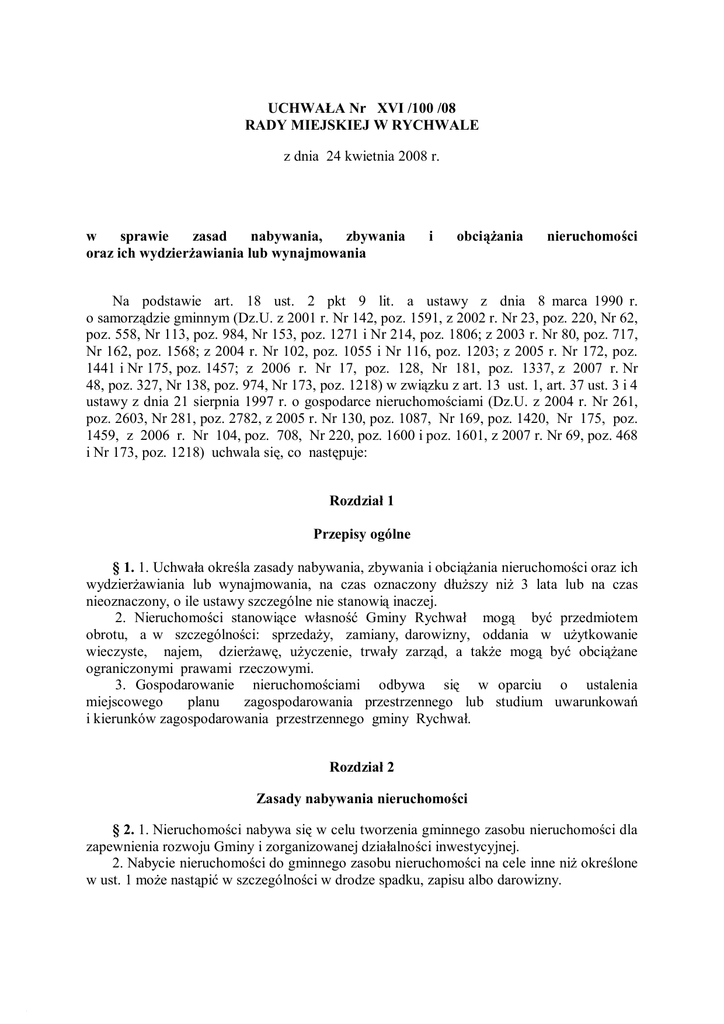 UCHWAŁA Nr XVI /100 /08 RADY MIEJSKIEJ W RYCHWALE z dnia 24 kwietnia 2008 r. w sprawie zasad nabywania, zbywania oraz ich wydzierżawiania lub wynajmowania i obciążania nieruchomości Na podstawie art. 18 ust. 2 pkt 9 lit. a ustawy z dnia 8 marca 1990 r. o samorządzie gminnym (Dz.U. z 2001 r. Nr 142, poz. 1591, z 2002 r. Nr 23, poz. 220, Nr 62, poz. 558, Nr 113, poz. 984, Nr 153, poz. 1271 i Nr 214, poz. 1806; z 2003 r. Nr 80, poz. 717, Nr 162, poz. 1568; z 2004 r. Nr 102, poz. 1055 i Nr 116, poz. 1203; z 2005 r. Nr 172, poz. 1441 i Nr 175, poz. 1457; z 2006 r. Nr 17, poz. 128, Nr 181, poz. 1337, z 2007 r. Nr 48, poz. 327, Nr 138, poz. 974, Nr 173, poz. 1218) w związku z art. 13 ust. 1, art. 37 ust. 3 i 4 ustawy z dnia 21 sierpnia 1997 r. o gospodarce nieruchomościami (Dz.U. z 2004 r. Nr 261, poz. 2603, Nr 281, poz. 2782, z 2005 r. Nr 130, poz. 1087, Nr 169, poz. 1420, Nr 175, poz. 1459, z 2006 r. Nr 104, poz. 708, Nr 220, poz. 1600 i poz. 1601, z 2007 r. Nr 69, poz. 468 i Nr 173, poz. 1218) uchwala się, co następuje: Rozdział 1 Przepisy ogólne § 1. 1. Uchwała określa zasady nabywania, zbywania i obciążania nieruchomości oraz ich wydzierżawiania lub wynajmowania, na czas oznaczony dłuższy niż 3 lata lub na czas nieoznaczony, o ile ustawy szczególne nie stanowią inaczej. 2. Nieruchomości stanowiące własność Gminy Rychwał mogą być przedmiotem obrotu, a w szczególności: sprzedaży, zamiany, darowizny, oddania w użytkowanie wieczyste, najem, dzierżawę, użyczenie, trwały zarząd, a także mogą być obciążane ograniczonymi prawami rzeczowymi. 3. Gospodarowanie nieruchomościami odbywa się w oparciu o ustalenia miejscowego planu zagospodarowania przestrzennego lub studium uwarunkowań i kierunków zagospodarowania przestrzennego gminy Rychwał. Rozdział 2 Zasady nabywania nieruchomości § 2. 1. Nieruchomości nabywa się w celu tworzenia gminnego zasobu nieruchomości dla zapewnienia rozwoju Gminy i zorganizowanej działalności inwestycyjnej. 2. Nabycie nieruchomości do gminnego zasobu nieruchomości na cele inne niż określone w ust. 1 może nastąpić w szczególności w drodze spadku, zapisu albo darowizny. § 3. Koszty związane z nabywaniem nieruchomości nie mogą przekroczyć kwoty określonej na ten cel w budżecie. § 4. Nabycie nieruchomości wymaga uprzedniej zgody Rady Miejskiej w Rychwale. Zgoda Rady wymagana jest także w przypadku, gdy na podstawie umowy Gmina staje się dzierżawcą lub najemcą nieruchomości na czas oznaczony dłuższy niż 3 miesiące. Rozdział 3 Zasady zbywania nieruchomości § 5. Nieruchomości są zbywane w drodze przetargu, chyba że ustawa, niniejsza uchwała lub inne przepisy prawa powszechnie obowiązującego stanowią inaczej. § 6. Do sprzedaży przeznacza się nieruchomości znajdujące się w gminnym zasobie nieruchomości zbędne dla rozwoju i prawidłowego funkcjonowania Gminy Rychwał. § 7. Na zbycie lub zamianę nieruchomości wymagana jest odrębna zgoda Rady Miejskiej w Rychwale, z zastrzeżeniem § 8. § 8. Zasady zbywania własności lokali mieszkalnych wchodzących w skład gminnego zasobu nieruchomości określają odrębne uchwały Rady Miejskiej w Rychwale. Rozdział 4 Zasady wydzierżawiania, wynajmowania oraz użyczania nieruchomości § 9. 1. Nieruchomości znajdujące się w gminnym zasobie nieruchomości wynajmuje, wydzierżawia i użycza Burmistrz Rychwała, z zastrzeżeniem ust. 2-3. 2. Umowa najmu, dzierżawy albo użyczenia zawarta na czas oznaczony dłuższy niż 3 lata lub na czas nieoznaczony wymaga zgody Rady Miejskiej w Rychwale, z zastrzeżeniem ust. 3. 3. Zgoda Rady Miejskiej w Rychwale wymagana jest również w przypadku, gdy po umowie zawartej na czas oznaczony do 3 lat strony zawierają kolejne umowy, których przedmiotem jest ta sama nieruchomość. § 10. 1. Wyraża się zgodę na odstąpienie od przetargowego trybu zawarcia umowy najmu lub dzierżawy nieruchomości na czas oznaczony dłuższy niż 3 lata: 1) z osobą, która korzystała, jako ostatnia, z nieruchomości na podstawie umów przez okres co najmniej 3 lat; 2) jeżeli nieruchomość przeznacza się na cel publiczny; 3) jeżeli umowę zawiera się w celu poprawienia warunków zagospodarowania nieruchomości przyległej lub jej części, stanowiącej własność, oddanej w użytkowanie wieczyste, dzierżawę, najem albo użytkowanie wnioskodawcy; 4) jeżeli nieruchomość przeznacza się na cele prowadzenia działalności niezarobkowej, a w szczególności charytatywnej, kulturalnej i oświatowej albo na cele działalności o charakterze użyteczności publicznej; 5) z inną jednostką samorządu terytorialnego albo ze Skarbem Państwa; 6) gdy w wyniku dwóch kolejnych przetargów nie wyłoniono dzierżawcy lub najemcy. 2. Wyraża się zgodę na odstąpienie od obowiązku przetargowego trybu zawarcia umowy dzierżawy na czas oznaczony dłuższy niż 3 lata lub na czas nieoznaczony, w przypadku gdy dotyczą one nieruchomości wykorzystywanych na cele rolne lub ogródków przydomowych – po uzyskaniu pozytywnej opinii Komisji Rady Miejskiej w Rychwale. § 11. 1. Przy ustalaniu czynszu z tytułu dzierżawy lub najmu nieruchomości gruntowych, w tym lokali użytkowych, należy rozważyć rodzaj, położenie, przeznaczenie oraz różne formy korzystania z nieruchomości, a także informacje o stawkach czynszu na obszarze gmin sąsiednich, a w przypadku gruntów przeznaczonych lub wykorzystywanych na cele rolne – klasę gruntów. 2. Burmistrz Rychwała może określić, w drodze zarządzenia, minimalne stawki czynszu lub innych należności za korzystanie z przedmiotu umowy. Rozdział 5 Zasady obciążania nieruchomości § 12. 1. Nieruchomości mogą być obciążane prawami rzeczowymi ograniczonymi. 2. Nieruchomości mogą być obciążane hipoteką do wysokości zobowiązań finansowych wynikających z uchwał Rady Miejskiej w Rychwale, a także z zawartych umów nabycia nieruchomości. 3. Obciążenie nieru