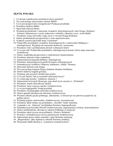 JĘZYK POLSKI: 1. 2. 3. 4. 5. 6. Co poezja współczesna zawdzięcza liryce greckiej? Na czym polega uniwersalna wartość Biblii? Co to jest przypowieść ewangeliczna? Podaj jej przykłady. Przedstaw budowę Biblii. Opowiedz historię Hioba. Wyjaśnij pochodzenie i znaczenie związków frazeologicznych: arka Noego, Sodoma i Gomora, Salomonowy wyrok, judaszowe srebrniki, zakazany owoc, wieża Babel. 7. Przedstaw wizję człowieka i jego życie w świetle Księgi Koheleta. 8. Omów problematykę przypowieści o synu marnotrawnym. 9. O jakich czasach opowiada Stary Testament? 10. Podaj kilka przykładów związków frazeologicznych o rodowodzie biblijnym i mitologicznym. Wyjaśnij ich znaczenie dosłowne i przenośne. 11. Przedstaw treść i problematykę dwóch wybranych mitów. 12. Co to jest mit? Podaj kilka przykładów mitologicznych postaci, które maja znaczenie symboliczne. 13. Omów symbolikę przypowieści o miłosiernym Samarytaninie. 14. Przedstaw historię wojny trojańskiej. 15. Zaprezentuj kosmogonię biblijną i mitologiczną. 16. Przedstaw najważniejszych greckich bogów mitologicznych. 17. Scharakteryzuj Achillesa i Hektora, bohaterów „Iliady” Homera. 18. Opowiedz historię rodu Edypa. 19. Na czym polega tragizm Edypa, bohatera dramatu Sofoklesa. 20. Omów budowę tragedii greckiej. 21. Wyjaśnij, jak powstał i działał teatr grecki. 22. Co to jest fatum? Jak je rozumieli starożytni Grecy? 23. Co oznaczają terminy : katharsis, mimesis ? 24. Zaprezentuj twórczość Horacego, jego ideał życia zawarty w „Pieśniach”. 25. Przedstaw szkoły filozoficzne antyku. 26. Przedstaw ramy czasowe antyku i średniowiecza. 27. Co to jest hagiografia? Podaj przykład . 28. Przedstaw światopogląd człowieka średniowiecza. 29. Omów gatunki dramatyczne literatury średniowiecza. 30. Wymień zabytki języka polskiego, dokumenty, w których po raz pierwszy pojawiły się polskie słowa. 31. Wyjaśnij pojęcia; uniwersalny, średniowieczny, teocentryczny. 32. Przedstaw ideał władcy na przykładzie „ Kroniki” Galla Anonima. 33. „Legenda o św. Aleksym” przykładem literatury hagiograficznej. 34. Scharakteryzuj kierunki filozofii średniowiecznej: augustianizm, tomizm, franciszkanizm. 35. Omów problematykę „Rozmowy mistrza Polikarpa ze śmiercią” 36. Przedstaw ideał rycerza na przykładzie „Pieśni o Roladzie”. 37. Wymień i scharakteryzuj wzorce parenetyczne średniowiecza. 38. Zaprezentuj motyw dance macabre i jego literacką realizację. 39. „Bogurodzica” jako najstarszy zabytek literatury polskiej. 40. Wizerunek Matki Boskiej w „Lamencie świętokrzyskim”.