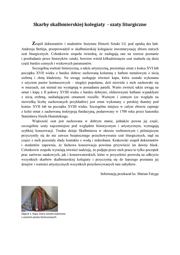 Skarby skalbmierskiej kolegiaty - szaty liturgiczne Zespół doktorantów i studentów Instytutu Historii Sztuki UJ, pod opieką dra hab. Andrzeja Betleja, przeprowadził w skalbmierskiej kolegiacie inwentaryzację zbioru starych szat liturgicznych. Członkowie zespołu twierdzą, Ŝe zasługują one na szersze poznanie i przebadanie przez historyków sztuki, bowiem wśród kilkudziesięciu szat znalazła się duŜa część bardzo cennych i wiekowych paramentów. Szczególną wartość historyczną, a takŜe artystyczną, prezentuje ornat z końca XVI lub początku XVII wieku z bardzo dobrze zachowaną kolumną z haftem metalowym z nicią srebrną i złotą kładziony. Na uwagę zasługuje równieŜ kapa, która została wykonana z uŜyciem pasów kontuszowych – niegdyś popularne, dziś niewiele z nich zachowało się w muzeach, zaś niemal nie występują w posiadaniu parafii. Warto zwrócić takŜe uwagę na ornat i kapę z II połowy XVIII wieku z bardzo dobrymi, efektownymi haftami wypukłymi z nicią srebrną, naśladującymi ornament rocaille. WaŜnym i cennym (ze względu na niewielką liczbę zachowanych przykładów) jest ornat wykonany z perskiej tkaniny pod koniec XVII lub na początku XVIII wieku. Szczególne miejsce w całym zbiorze zajmuje z kolei ornat z zachowaną inskrypcją fundacyjną, podarowany w 1700 roku przez kanonika Stanisława Józefa Humińskiego. Większość szat jest zachowana w dobrym stanie, jednakŜe pewna jej część, szczególnie szaty najcenniejsze pod względem historycznym i artystycznym, wymagają szybkiej konserwacji. Trudne dzieje Skalbmierza w okresie rozbiorowym i późniejszym przyczyniły się do nie zawsze bezpiecznego przechowywania szat liturgicznych, stąd na części z nich pozostały ślady kontaktu z wodą i mikrobami. Krakowski zespół doktorantów i studentów zapewnia, Ŝe fachowa konserwacja powinna przywrócić im dawny blask. Członkowie zespołu wyraŜają równieŜ nadzieję, Ŝe podjęta przez nich praca to tylko początek prac zarówno naukowych, jak i konserwatorskich, które w przyszłości pozwolą na odkrycie wszystkich skarbów skalbmierskiej kolegiaty i przyczynią się do lepszego poznania jej dziejów i wartości artystycznych wszystkich przechowywanych tam zabytków. Informację przekazał ks. Marian Fatyga Zdjęcie 1. Kapa, która została wykonana z użyciem pasów kontuszowych. Zdjęcie 2-3. Ornat i kapa z II połowy XVIII wieku z efektownymi haftami wypukłymi z nicią srebrną , naśladującymi ornament rocaille. Zdjęcie 4-5. Szczególne miejsce w całym zbiorze zajmuje ornat z zachowaną inskrypcją fundacyjną, darowany do kolegiaty w 1700 roku przez kanonika Stanisława Józefa Humińskiego. Zdjęcie 6. Ornat z I połowa XX wieku. Zdjęcie 7. Ornat czerwony – połowa XVIII wieku.