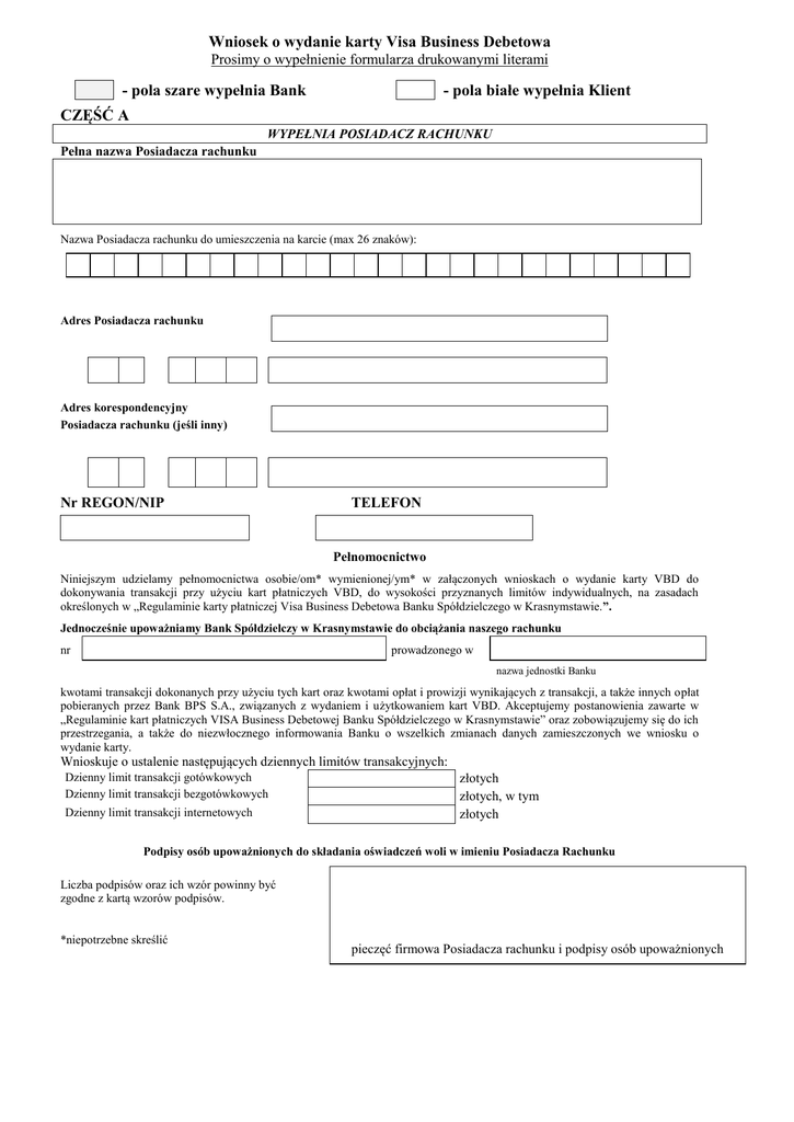 Wniosek o wydanie karty Visa Business Debetowa Prosimy o wypełnienie formularza drukowanymi literami - pola szare wypełnia Bank - pola białe wypełnia Klient CZĘŚĆ A WYPEŁNIA POSIADACZ RACHUNKU Pełna nazwa Posiadacza rachunku Nazwa Posiadacza rachunku do umieszczenia na karcie (max 26 znaków): Adres Posiadacza rachunku Adres korespondencyjny Posiadacza rachunku (jeśli inny) Nr REGON/NIP TELEFON Pełnomocnictwo Niniejszym udzielamy pełnomocnictwa osobie/om* wymienionej/ym* w załączonych wnioskach o wydanie karty VBD do dokonywania transakcji przy użyciu kart płatniczych VBD, do wysokości przyznanych limitów indywidualnych, na zasadach określonych w „Regulaminie karty płatniczej Visa Business Debetowa Banku Spółdzielczego w Krasnymstawie.”. Jednocześnie upoważniamy Bank Spółdzielczy w Krasnymstawie do obciążania naszego rachunku nr prowadzonego w nazwa jednostki Banku kwotami transakcji dokonanych przy użyciu tych kart oraz kwotami opłat i prowizji wynikających z transakcji, a także innych opłat pobieranych przez Bank BPS S.A., związanych z wydaniem i użytkowaniem kart VBD. Akceptujemy postanowienia zawarte w „Regulaminie kart płatniczych VISA Business Debetowej Banku Spółdzielczego w Krasnymstawie” oraz zobowiązujemy się do ich przestrzegania, a także do niezwłocznego informowania Banku o wszelkich zmianach danych zamieszczonych we wniosku o wydanie karty. Wnioskuje o ustalenie następujących dziennych limitów transakcyjnych: Dzienny limit transakcji gotówkowych Dzienny limit transakcji bezgotówkowych Dzienny limit transakcji internetowych złotych złotych, w tym złotych Podpisy osób upoważnionych do składania oświadczeń woli w imieniu Posiadacza Rachunku Liczba podpisów oraz ich wzór powinny być zgodne z kartą wzorów podpisów. *niepotrzebne skreślić pieczęć firmowa Posiadacza rachunku i podpisy osób upoważnionych CZĘŚĆ B Numer ewidencyjny PESEL/data urodzenia*: Obywatelstwo: Dokument tożsamości: dowód osobisty paszport karta stałego pobytu Seria i numer dokumentu tożsamości: Płeć: K M Nazwisko: Imię/Imiona: Nazwisko rodowe matki Data urodzenia: Miejsce urodzenia: dzień miesiąc rok Imię i nazwisko do umieszczenia na karcie (max 26 znaków): UWAGA!!! Na karcie może być umieszczonych 26 znaków licząc z odstępem pomiędzy imieniem i nazwiskiem. Prosimy nie wpisywać tytułów i pseudonimów. Adres zameldowania: nazwa ulicy, numer domu, mieszkania miejscowość kod pocztowy Adres do korespondencji:** nazwa ulicy, numer domu, mieszkania miejscowość kod pocztowy Telefon służbowy / kontaktowy Telefon domowy * W przypadku nie posiadania nr PESEL ** Prosimy wypełnić, jeśli jest różny od adresu zameldowania. Oświadczam, że znam i akceptuję postanowienia zawarte w „Regulaminie otwierania i prowadzenia rachunków bankowych dla Klientów Instytucjonalnych w Banku Spółdzielczym w Krasnymstawie”, „Regulamin karty płatniczej Visa Classic Debetowa Banku Spółdzielczego w Krasnymstawie” oraz zobowiązuję się do ich ścisłego przestrzegania. Wyrażam zgodę na: a. przechowywanie i przetwarzanie moich danych osobowych przez Bank BPS SA, IT Card S.A. oraz na udostępnienie moich danych bankom i instytucjom upoważnionym do ochrony bezpieczeństwa obrotu kartowego, b. to, aby miesięczne zestawienie transakcji, korespondencja z Bankiem oraz informacje o zmianach w „Regulaminie otwierania i prowadzenia rachunków bankowych dla klientów instytucjonalnych” były mi przekazywane z pozostałą dokumentacją rachunku, do którego została wydana karta, c. to, aby Bank kontaktował się ze mną w pozostałych sprawach związanych z obsługą kart: telefonicznie lub pisemnie (listem zwykłym). * niepotrzebne skreślić miejscowość i data podpis Użytkownika karty CZĘŚĆ C Przyjmuję do wiadomości, że złożenie przeze mnie wniosku o wydanie karty dla innej osoby fizycznej oznacza udzielenie wskazanej osobie pełnomocnictwa szczególnego, zgodnie z zakresem uprawnień określonych w „Regulaminie otwierania i prowadzenia rachunków bankowych dla Klientów Instytucjonalnych w Banku Spółdzielczym w Krasnymstawie” do dokonywania rozliczeń transakcji przy użyciu karty płatniczej w ciężar rachunku bankowego. miejscowość i data pieczęć firmowa Posiadacza rachunku i podpisy osób upoważnionych WYPEŁNIA JEDNOSTKA BANKU Data przyjęcia wniosku stempel kasowo-memoriałowy i podpis pracownika przyjmującego wniosek Karta wydana do rachunku (pełny numer rachunku) Decyzja banku ...................................................................................................................................................................... ...................................................................................................................................................................... ...................................................................................................................................................................... ...................................................................................................................................................................... ..................................................................................................................................................................... miejscowość i data podpis i stempel/pieczątka imienna upoważnionego pracownika Adnotacje ...................................................................................................................................................................... ...................................................................................................................................................................... ...................................................................................................................................................................... .........