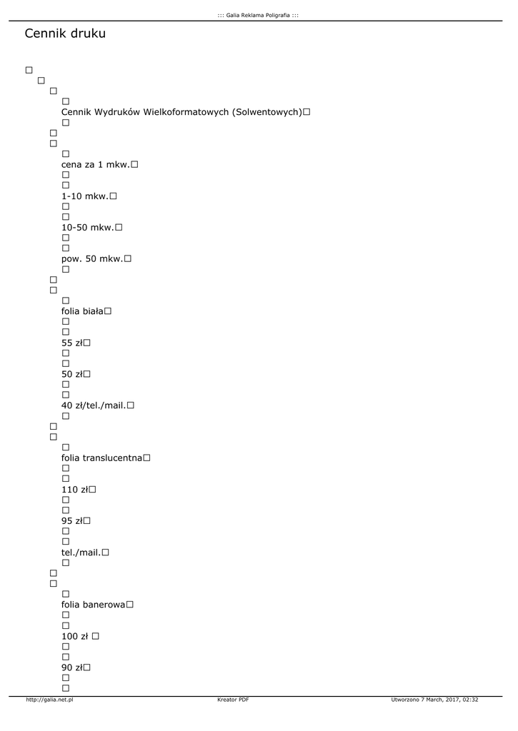 ::: Galia Reklama Poligrafia ::: Cennik druku Cennik Wydruków Wielkoformatowych (Solwentowych) cena za 1 mkw. 1-10 mkw. 10-50 mkw. pow. 50 mkw. folia biała 55 zł 50 zł 40 zł/tel./mail. folia translucentna 110 zł 95 zł tel./mail. folia banerowa 100 zł 90 zł http://galia.net.pl Kreator PDF Utworzono 7 March, 2017, 02:32 ::: Galia Reklama Poligrafia ::: tel./mail folia one way vision 120 zł 100 zł tel./mail baner frontlit 450 g. 60 zł 55 zł 45 zł/tel./mail baner frontlit 500 g. 70 zł 60 zł 50 zł/tel./mail baner backlight 500 g. 75 zł 65 zł 55 zł/tel./mail baner backlight 500 g. http://galia.net.pl Kreator PDF Utworzono 7 March, 2017, 02:32 ::: Galia Reklama Poligrafia ::: z poddrukiem 80 zł 75 zł tel./mail baner blackout 700 g. 80 zł 75 zł tel./mail siatka mesh 350 g. ---- 60 zł tel./mail papier blueback 50 zł 48 zł tel./mail papier citylight 50 zł http://galia.net.pl Kreator PDF Utworzono 7 March, 2017, 02:32 ::: Galia Reklama Poligrafia ::: 48 zł tel./mail flagi 125 zł 115 zł tel./mail plandeka 700 g. 90 zł 85 zł tel./mail plandeka 900 g. 100 zł 95 zł tel./mail Cennik dodatkowych operacji. http://galia.net.pl Kreator PDF Utworzono 7 March, 2017, 02:32 ::: Galia Reklama Poligrafia ::: operacja cena oczkowanie gratis zgrzewanie gratis prosty projekt graficzny (do 15 minut) w cenie naklejanie materiałów na płyty (pianka/twarde PCV) 30 zł mkw. laminowanie druków 30 zł mkw. cięcie gotowych płyt na części w cenie Ceny netto. Dla stałych klientów niższe ceny. Przy dużych zamówieniach korzystne rabaty. http://galia.net.pl Kreator PDF Utworzono 7 March, 2017, 02:32 ::: Galia Reklama Poligrafia ::: materiały oferta maszyny projekty graficzne operacje dodatkowe pytania i odpowiedzi http://galia.net.pl Kreator PDF Utworzono 7 March, 2017, 02:32