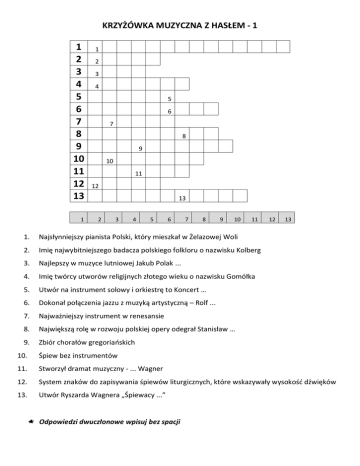 KRZYŻÓWKA MUZYCZNA Z HASŁEM - 1 1 2 3 4 5 6 7 8 9 10 11 12 13 1 1 2 3 4 5 6 7 8 9 10 11 12 13 2 3 4 5 6 7 8 9 10 11 1. Najsłynniejszy pianista Polski, który mieszkał w Żelazowej Woli 2. Imię najwybitniejszego badacza polskiego folkloru o nazwisku Kolberg 3. Najlepszy w muzyce lutniowej Jakub Polak ... 4. Imię twórcy utworów religijnych złotego wieku o nazwisku Gomółka 5. Utwór na instrument solowy i orkiestrę to Koncert … 6. Dokonał połączenia jazzu z muzyką artystyczną – Rolf ... 7. Najważniejszy instrument w renesansie 8. Największą rolę w rozwoju polskiej opery odegrał Stanisław … 9. Zbiór chorałów gregoriańskich 12 13 10. Śpiew bez instrumentów 11. Stworzył dramat muzyczny - ... Wagner 12. System znaków do zapisywania śpiewów liturgicznych, które wskazywały wysokość dźwięków 13. Utwór Ryszarda Wagnera „Śpiewacy ...” › Odpowiedzi dwuczłonowe wpisuj bez spacji