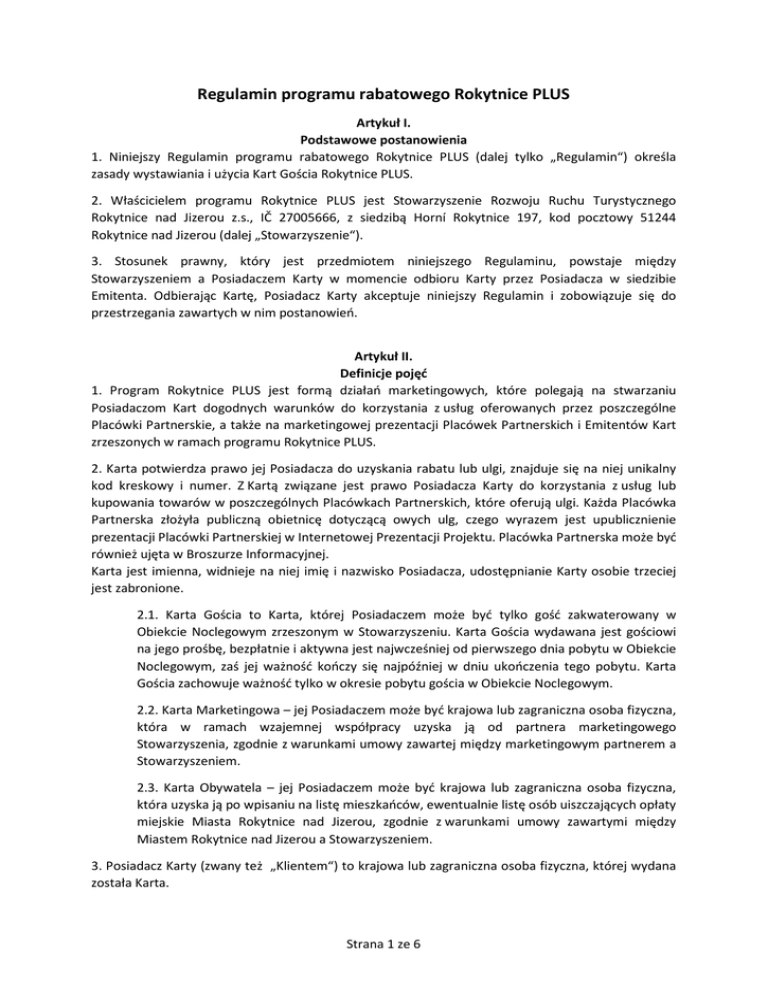 Regulamin programu rabatowego Rokytnice PLUS Artykuł I. Podstawowe postanowienia 1. Niniejszy Regulamin programu rabatowego Rokytnice PLUS (dalej tylko „Regulamin“) określa zasady wystawiania i użycia Kart Gościa Rokytnice PLUS. 2. Właścicielem programu Rokytnice PLUS jest Stowarzyszenie Rozwoju Ruchu Turystycznego Rokytnice nad Jizerou z.s., IČ 27005666, z siedzibą Horní Rokytnice 197, kod pocztowy 51244 Rokytnice nad Jizerou (dalej „Stowarzyszenie“). 3. Stosunek prawny, który jest przedmiotem niniejszego Regulaminu, powstaje między Stowarzyszeniem a Posiadaczem Karty w momencie odbioru Karty przez Posiadacza w siedzibie Emitenta. Odbierając Kartę, Posiadacz Karty akceptuje niniejszy Regulamin i zobowiązuje się do przestrzegania zawartych w nim postanowień. Artykuł II. Definicje pojęć 1. Program Rokytnice PLUS jest formą działań marketingowych, które polegają na stwarzaniu Posiadaczom Kart dogodnych warunków do korzystania z usług oferowanych przez poszczególne Placówki Partnerskie, a także na marketingowej prezentacji Placówek Partnerskich i Emitentów Kart zrzeszonych w ramach programu Rokytnice PLUS. 2. Karta potwierdza prawo jej Posiadacza do uzyskania rabatu lub ulgi, znajduje się na niej unikalny kod kreskowy i numer. Z Kartą związane jest prawo Posiadacza Karty do korzystania z usług lub kupowania towarów w poszczególnych Placówkach Partnerskich, które oferują ulgi. Każda Placówka Partnerska złożyła publiczną obietnicę dotyczącą owych ulg, czego wyrazem jest upublicznienie prezentacji Placówki Partnerskiej w Internetowej Prezentacji Projektu. Placówka Partnerska może być również ujęta w Broszurze Informacyjnej. Karta jest imienna, widnieje na niej imię i nazwisko Posiadacza, udostępnianie Karty osobie trzeciej jest zabronione. 2.1. Karta Gościa to Karta, której Posiadaczem może być tylko gość zakwaterowany w Obiekcie Noclegowym zrzeszonym w Stowarzyszeniu. Karta Gościa wydawana jest gościowi na jego prośbę, bezpłatnie i aktywna jest najwcześniej od pierwszego dnia pobytu w Obiekcie Noclegowym, zaś jej ważność kończy się najpóźniej w dniu ukończenia tego pobytu. Karta Gościa zachowuje ważność tylko w okresie pobytu gościa w Obiekcie Noclegowym. 2.2. Karta Marketingowa – jej Posiadaczem może być krajowa lub zagraniczna osoba fizyczna, która w ramach wzajemnej współpracy uzyska ją od partnera marketingowego Stowarzyszenia, zgodnie z warunkami umowy zawartej między marketingowym partnerem a Stowarzyszeniem. 2.3. Karta Obywatela – jej Posiadaczem może być krajowa lub zagraniczna osoba fizyczna, która uzyska ją po wpisaniu na listę mieszkańców, ewentualnie listę osób uiszczających opłaty miejskie Miasta Rokytnice nad Jizerou, zgodnie z warunkami umowy zawartymi między Miastem Rokytnice nad Jizerou a Stowarzyszeniem. 3. Posiadacz Karty (zwany też „Klientem“) to krajowa lub zagraniczna osoba fizyczna, której wydana została Karta. Strana 1 ze 6 4. Przekazanie Karty to, według niniejszego Regulaminu, wprowadzenie obowiązkowych danych identyfikacyjnych gościa (imię, nazwisko, data urodzenia, adres zamieszkania – miejscowość i kraj, email) do Systemu Informacyjnego Stowarzyszenia u Emitenta Karty. 5. Obiekt Noclegowy to budynek lub inna przestrzeń czy powierzchnia, gdzie za opłatą świadczona jest usługa zakwaterowania i inne związane z tym usługi. 6. Emitent (lub też „przyznający kartę“, „wystawiający kartę“) to Obiekt Noclegowy prowadzony przez członka Stowarzyszenia lub inny podmiot związany umową ze Stowarzyszeniem, który posiada uprawnienia do wystawienia Karty Gościa, Karty Marketingowej czy Karty Obywatela. Lista członkowskich Obiektów Noclegowych prowadzonych przez członków Stowarzyszenia, będących Emitentami Karty Gościa, dostępna jest w Internetowej Prezentacji Projektu. 7. Placówka Partnerska jest związanym umową partnerem Stowarzyszenia. Podana jest w Internetowej Prezentacji Projektu bądź w Broszurze Informacyjnej. Partner zobowiązał się świadczyć swoje usługi lub sprzedawać swoje towary Posiadaczowi Karty, udzielając rabatu czy innego bonusu opisanego w Internetowej Prezentacji Projektu czy w Broszurze Informacyjnej. 8. Broszura Informacyjna to wydrukowane materiały wydawane przez Stowarzyszenie, które zawierają podstawowe informacje o programie Rokytnice PLUS, listę Placówek Partnerskich, włącznie z warunkami i zasadami korzystania z rabatów i innych ulg przysługujących Posiadaczowi Karty. Stowarzyszenie nie jest zobowiązane do wydania Broszury Informacyjnej, zatem wszelkie informacje, które znalazłyby się w Broszurze Informacyjnej, dostępne są w Internetowej Prezentacji Projektu. 9. Internetową Prezentację Projektu stanowi zbiór informacji o programie Rokytnice PLUS, lista Emitentów Kart oraz lista Placówek Partnerskich, włącznie z warunkami i zasadami korzystania z rabatów i innych ulg przysługujących Posiadaczowi Karty na usługi oraz towary. Internetowa Prezentacja Projektu znajduje się na stronie www.rokytniceplus.cz i prowadzona jest przez Stowarzyszenie. 10. Sezon letni to, zgodnie z niniejszym Regulaminem, coroczny okres, zaczynający się najwcześniej 1 maja i kończący się najpóźniej 30 listopada. 11. Sezon zimowy to, zgodnie z niniejszym Regulaminem, coroczny okres, zaczynający się najwcześniej 1 grudnia i kończący się najpóźniej 30 kwietnia. 12. System Informacyjny to program komputerowy umożliwiający rejestrację i ewidencję danych identyfikacyjnych Posiadacza Karty, informacji dotyczących okresu ważności Karty, a także służący do rejestracji danych związanych z Placówkami Partnerskimi, gdzie szczególnie ważna jest lista owych Placówek, opis i zakres oferowanych przez nich rabatów i ulg oraz informacje o korzystaniu z usług czy zakupie towarów przez Posiadaczy Kart w poszczególnych Placówkach Partnerskich. 13. Adres korespondencyjny S