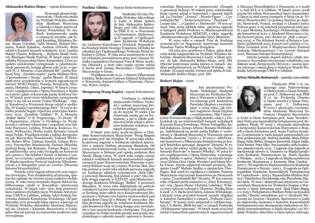 Aleksandra BubiczMojsa sopran koloraturowy Paulina Glinka Dysponuje głosem kolo raturowym. Ukończyła studia na Wydziale WokalnoAktor skim Akademii Muzycznej w Gdańsku w klasie śpiewu ad. Bożeny Porzyńskiej. Po stu diach kontynuowała naukę u cenionych artystów, jak In grid Kremling, Zdzisława Do nat, Ileana Cotrubas, Julia Hamari, Roland Her mann, Kałudi Kałudow, Andreas Orlowitz. Brała udział w licznych kursach wokalnych, m.in. London Master Classes, Schleswig – Holstein Musik Festi val, Rheingau Musik Festival. W latach 19932013 solistka Warszawskiej Opery Kameralnej. Z tym ze społem wielokrotnie występowała w przedstawie niach operowych, kreując główne role, m.in. w ope rach W. A. Mozarta; „Czarodziejski flet”, partia Kró lowej Nocy, „Dyrektor teatru”, partia Madame Herz, „Uprowadzenie z Seraju”, partia Blondy. W latach 19982012 uczestniczyła w licznych zagranicznych tournee WOK (Niemcy, Francja, Szwajcaria, Hisz pania, Holandia, Liban, Japonia). W latach 2004 2007 współpracowała z Operą Narodową w Rydze na Łotwie, gdzie wykonywała partię Królowej No cy. W latach 20062010 wielokrotnie występowała także w tej roli na scenie Teatru Wielkiego – Ope ry Narodowej w Warszawie biorąc udział w spekta klu „W krainie Czarodziejskiego fletu”. W swym do robku posiada bogaty repertuar oratoryjnokanta towy, m.in. „Exsultate Jubilate” W. A. Mozarta, „Stabat Mater” G. B. Pergolesiego, „Te Deum” M. A. Charpentiera, „Gloria” A. Vivaldiego i in. Wystę powała z wieloma orkiestrami i zespołami oraz chó rami Warszawy, Lublina, Wrocławia, Krakowa, To runia, Wałbrzycha, Płocka, Łodzi, Bytomia i innych miast Polski. Współpracowała z takimi dyrygenta mi jak: Mieczysław Nowakowski, Tadeusz Wiche rek, Ruben Silva, Tadeusz Karolak, Łukasz Boro wicz, Przemysław Stanisławski, Dariusz Mikulski, Andrzej Knap, Kai Bumann, Tomasz Bugaj i inni. W październiku 2015 roku wystąpiła na koncercie arii i pieśni w The Schubert Society of Britain w Lon dynie, we wrześniu i październiku 2016 w Lublinie (V Międzynarodowy Festiwal Andrzeja Nikodemo wicza) a w listopadzie 2016 we Lwowie (Muzeum Salomei Kruszelnickiej). Posiada wiele nagrań płytowych oraz nagra nia telewizyjne. Poza działalnością artystyczną, śpie waczka zajmuje się również pracą naukowodydak tyczną. W roku 2009 otrzymała stopień doktora ha bilitowanego sztuki w dyscyplinie artystycznej wokalistyka. W latach 1997–2011 była pracowni kiem naukowodydaktycznym Wydziału Artystycz nego UMCS w Lublinie, pełniąc także funkcję kie rownika Zakładu Kształcenia Wokalnego. Od paź dziernika 2011 prowadzi klasę śpiewu solowego na Wydziale WokalnoAktorskim Akademii Muzycz nej im. Grażyny i Kiejstuta Bacewiczów w Łodzi, gdzie obecnie pracuje na stanowisku profesora nad zwyczajnego. Studentka III roku Wy działu WokalnoAktorskiego w Łodzi w klasie śpiewu dr hab. Aleksandra Bubicz Mojsy, prof. AM. Absolwent ka PSM II st. w Warszawie z wyróżnieniem. Zdobywczy ni II nagrody w Ogólnopol skim Konkursie Wokalnym im. Ludomira Różyckiego w Gliwicach. Stypendyst ka Fundacji Dzieło Nowego Tysiąclecia. Od kilku lat członkini jury Ogólnopolskiego Festiwalu Pieśni Sa kralnej w Grójcu. W roku 2014 uczestniczyła w kur sie wokalnym prowadzonym przez prof. Janusza Ni ziołka organizatora European Voice & Music Acade my (Munich), a 2016 roku wzięła czynny udział w kursie prof. Joanny Borowskiej z Uniwersytetu Muzycznego w Grazu. Współpracowała m.in. z chórem Filharmonii Łódzkiej, Stołecznym Centrum Edukacji Kulturalnej w Warszawie, domami kultury w Piasecznie, Chyno wie, Warce, Grójcu. Sopran lirykokoloraturowy Mengmeng WangKapica sopran koloraturowy Urodzona w chińskiej miejscowości DeZhou. Pocho dzi z rodziny muzycznej, któ ra bardzo pielęgnowała jej pa sję do muzyki. W wieku 5 lat rozpoczęła naukę gry na for tepianie, a już w szkole pod stawowej brała udział w pierw szym konkursie wokalnym ka tegorii dziecięcej. W latach 20012004 uczyła się śpiewu w Chiń skim Konserwatorium Muzycznym Wang Bingrui pod opieką prof. Ma Honghai. W 2004 roku zdoby ła pierwszą nagrodę w konkursie młodych śpiewa ków w mieście Dezhou, prowincja Shandong. Od 2004 roku kontynuowała naukę w Konserwatorium Muzycznym w Sichuan pod opieką profesora Ren Jiaode Zhang Linna. W 2006 roku wzięła czynny udział w wokalnych kursach mistrzowskich organi zowanych przez Konserwatorium Muzyczne w pro wincji Sichuan ucząc się u tenora Warrena Mok, dwa lata później w 2006 roku zdobyła pierwsza nagrodę na konkursie młodych wykonawców „Style Qilu” w prowincji Shandong. Rok później w 2007 roku zdo była drugią nagrody w XXXVIII sesji Międzynaro dowego Konkursu Włoskiego "Bellini" w prowincji Shenzhen. W 2009 roku dokształcała się podczas wokalnych kursów mistrzowskich pod opieką teno ra Xuchang, które odbyły się w Konserwatorium Mu zycznym w Sichuan oraz kursów mistrzowskich pod opieką Beier Gang Qi w Pekinie. W 2009 roku zdo była pierwszą nagrodę na wokalnym Konkursie Mu zyki Światowej Chin w Hong Kongu oraz wyróżnie nie w tym samym konkursie z fortepianu. Tuż przed wyjazdem do Polski uzyskała posadę nauczyciela aka demickiego w zakresie muzyki operowej w Konser watorium Muzycznym w miejscowości Chengdu w prowincji Sichuan. W trakcie pracy wielokrotnie brała czynny udział w koncertach i operach takich jak „La Traviata”, „Ernani”, „Wesele Figara ", „ Cza rodziejski flet " – forma koncertowa, " Purytanie ", „ Lunatyczka ", „i Capuleti e i Montecchi”. W tym sa mym roku 2009 zdobyła także pierwszą nagrodę w kategorii pieśni Poulenca w Międzynarodowym Konkursie Wokalnym SEMCON, a także nagrodę „Międzynarodowego Wysłannika Opery Młodzieży” . W 2010 roku w ramach Tour de Xuchang uczestniczyła we fragmencie operowego koncertu Xiaoshan Teatru Wielkiego Hangzhou. Od roku 2011 przebywa w Polsce, gdzie sk