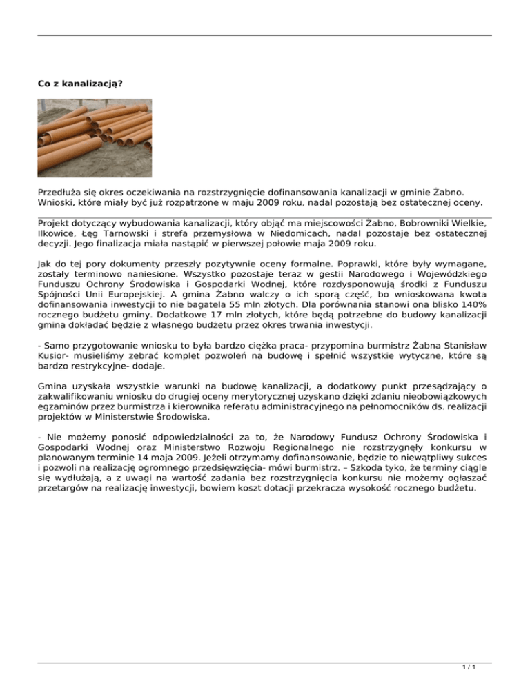 Co z kanalizacją? Przedłuża się okres oczekiwania na rozstrzygnięcie dofinansowania kanalizacji w gminie Żabno. Wnioski, które miały być już rozpatrzone w maju 2009 roku, nadal pozostają bez ostatecznej oceny. Projekt dotyczący wybudowania kanalizacji, który objąć ma miejscowości Żabno, Bobrowniki Wielkie, Ilkowice, Łęg Tarnowski i strefa przemysłowa w Niedomicach, nadal pozostaje bez ostatecznej decyzji. Jego finalizacja miała nastąpić w pierwszej połowie maja 2009 roku. Jak do tej pory dokumenty przeszły pozytywnie oceny formalne. Poprawki, które były wymagane, zostały terminowo naniesione. Wszystko pozostaje teraz w gestii Narodowego i Wojewódzkiego Funduszu Ochrony Środowiska i Gospodarki Wodnej, które rozdysponowują środki z Funduszu Spójności Unii Europejskiej. A gmina Żabno walczy o ich sporą część, bo wnioskowana kwota dofinansowania inwestycji to nie bagatela 55 mln złotych. Dla porównania stanowi ona blisko 140% rocznego budżetu gminy. Dodatkowe 17 mln złotych, które będą potrzebne do budowy kanalizacji gmina dokładać będzie z własnego budżetu przez okres trwania inwestycji. - Samo przygotowanie wniosku to była bardzo ciężka praca- przypomina burmistrz Żabna Stanisław Kusior- musieliśmy zebrać komplet pozwoleń na budowę i spełnić wszystkie wytyczne, które są bardzo restrykcyjne- dodaje. Gmina uzyskała wszystkie warunki na budowę kanalizacji, a dodatkowy punkt przesądzający o zakwalifikowaniu wniosku do drugiej oceny merytorycznej uzyskano dzięki zdaniu nieobowiązkowych egzaminów przez burmistrza i kierownika referatu administracyjnego na pełnomocników ds. realizacji projektów w Ministerstwie Środowiska. - Nie możemy ponosić odpowiedzialności za to, że Narodowy Fundusz Ochrony Środowiska i Gospodarki Wodnej oraz Ministerstwo Rozwoju Regionalnego nie rozstrzygnęły konkursu w planowanym terminie 14 maja 2009. Jeżeli otrzymamy dofinansowanie, będzie to niewątpliwy sukces i pozwoli na realizację ogromnego przedsięwzięcia- mówi burmistrz. – Szkoda tyko, że terminy ciągle się wydłużają, a z uwagi na wartość zadania bez rozstrzygnięcia konkursu nie możemy ogłaszać przetargów na realizację inwestycji, bowiem koszt dotacji przekracza wysokość rocznego budżetu. 1/1 Powered by TCPDF (www.tcpdf.org)