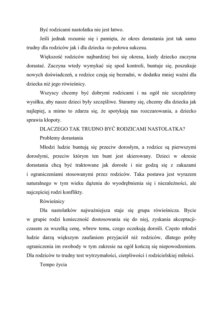 Być rodzicami nastolatka nie jest łatwo. Jeśli jednak rozumie się i pamięta, że okres dorastania jest tak samo trudny dla rodziców jak i dla dziecka -to połowa sukcesu. Większość rodziców najbardziej boi się okresu, kiedy dziecko zaczyna dorastać. Zaczyna wtedy wymykać się spod kontroli, buntuje się, poszukuje nowych doświadczeń, a rodzice czują się bezradni, w dodatku mniej ważni dla dziecka niż jego rówieśnicy. Wszyscy chcemy być dobrymi rodzicami i na ogół nie szczędzimy wysiłku, aby nasze dzieci były szczęśliwe. Staramy się, chcemy dla dziecka jak najlepiej, a mimo to zdarza się, że spotykają nas rozczarowania, a dziecko sprawia kłopoty. DLACZEGO TAK TRUDNO BYĆ RODZICAMI NASTOLATKA? Problemy dorastania Młodzi ludzie buntują się przeciw dorosłym, a rodzice są pierwszymi dorosłymi, przeciw którym ten bunt jest skierowany. Dzieci w okresie dorastania chcą być traktowane jak dorosłe i nie godzą się z zakazami i ograniczeniami stosowanymi przez rodziców. Taka postawa jest wyrazem naturalnego w tym wieku dążenia do wyodrębnienia się i niezależności, ale najczęściej rodzi konflikty. Rówieśnicy Dla nastolatków najważniejsza staje się grupa rówieśnicza. Bycie w grupie rodzi konieczność dostosowania się do niej, zyskania akceptacjiczasem za wszelką cenę, wbrew temu, czego oczekują dorośli. Często młodzi ludzie darzą większym zaufaniem przyjaciół niż rodziców, dlatego próby ograniczenia im swobody w tym zakresie na ogół kończą się niepowodzeniem. Dla rodziców to trudny test wytrzymałości, cierpliwości i rodzicielskiej miłości. Tempo życia Życie codzienne obecnie podlega różnorodnym presjom. Dotyczy to zarówno dorosłych, jak i dzieci. Wielu rodziców zmaga się z bezrobociem, wielu zaś poświęca swojej pracy zarobkowej dużo czasu. Dorastające dzieci również już od najmłodszych lat podlegają wyjątkowej presji - oczekuje się od nich osiągnięć w szkole, ładnej sylwetki, sukcesów. Coraz mniej chwil pozostaje na rozmowy i wspólne spędzanie czasu.