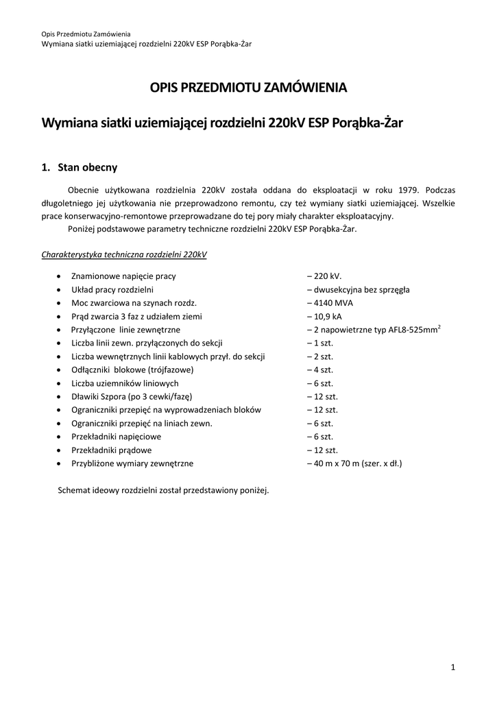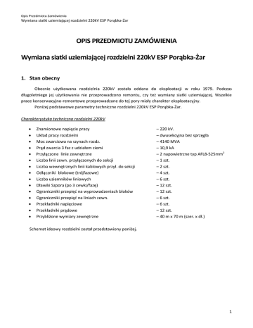 Opis Przedmiotu Zamówienia Wymiana siatki uziemiającej rozdzielni 220kV ESP Porąbka-Żar OPIS PRZEDMIOTU ZAMÓWIENIA Wymiana siatki uziemiającej rozdzielni 220kV ESP Porąbka-Żar 1. Stan obecny Obecnie użytkowana rozdzielnia 220kV została oddana do eksploatacji w roku 1979. Podczas długoletniego jej użytkowania nie przeprowadzono remontu, czy też wymiany siatki uziemiającej. Wszelkie prace konserwacyjno-remontowe przeprowadzane do tej pory miały charakter eksploatacyjny. Poniżej podstawowe parametry techniczne rozdzielni 220kV ESP Porąbka-Żar. Charakterystyka techniczna rozdzielni 220kV Znamionowe napięcie pracy Układ pracy rozdzielni Moc zwarciowa na szynach rozdz. Prąd zwarcia 3 faz z udziałem ziemi Przyłączone linie zewnętrzne Liczba linii zewn. przyłączonych do sekcji Liczba wewnętrznych linii kablowych przył. do sekcji Odłączniki blokowe (trójfazowe) Liczba uziemników liniowych Dławiki Szpora (po 3 cewki/fazę) Ograniczniki przepięć na wyprowadzeniach bloków Ograniczniki przepięć na liniach zewn. Przekładniki napięciowe Przekładniki prądowe Przybliżone wymiary zewnętrzne – 220 kV. – dwusekcyjna bez sprzęgła – 4140 MVA – 10,9 kA – 2 napowietrzne typ AFL8-525mm2 – 1 szt. – 2 szt. – 4 szt. – 6 szt. – 12 szt. – 12 szt. – 6 szt. – 6 szt. – 12 szt. – 40 m x 70 m (szer. x dł.) Schemat ideowy rozdzielni został przedstawiony poniżej. 1 Opis Przedmiotu Zamówienia Wymiana siatki uziemiającej rozdzielni 220kV ESP Porąbka-Żar ROZDZIELNIA ODŁĄCZNIKOWA 220kV Schemat ideowy rozdzielni 220kV 2 Opis Przedmiotu Zamówienia Wymiana siatki uziemiającej rozdzielni 220kV ESP Porąbka-Żar Widok ogólny rozdzielni Odłącznik blokowy wraz z uziemnikiem (Po prawej widoczne dławiki Szpora) 3 Opis Przedmiotu Zamówienia Wymiana siatki uziemiającej rozdzielni 220kV ESP Porąbka-Żar Wiek zainstalowanych urządzeń oraz przeprowadzona ekspertyza stanu technicznego systemu uziemień ESP Porąbka-Żar wskazuje na stopniową ich degradację. Konieczność przeciwdziałania nadmiernemu zwiększeniu rezystancji uziomów zmusza Zamawiającego do podjęcia kroków zaradczych w tym zakresie. Ponadto w ramach ekspertyzy określono zagrożenie piorunowe i sprawdzono zainstalowane środki ochrony odgromowej w rozdzielni napowietrznej 220kV w odniesieniu do aktualnych norm dla tego typu obiektów. Z zaleceń zawartych w ekspertyzie wynika konieczność uzupełnienia zainstalowanych urządzeń LPS (lightning protection system – urządzenie ochrony odgromowej) o dodatkowe urządzenia ochronne dla zapewnienia odpowiedniego poziomu ochrony odgromowej (LPL - lightning protection level). Granicę eksploatacji urządzeń rozdzielni stanowią zaciski prądowe mostka prądowego przyłączenia linii napowietrznych Żar 1 i Żar 2 na łańcuchach izolatorów odciągowych zamocowanych do trawersu bramki. W ostatnich latach w ramach modernizacji ESP Porąbka-Żar wymieniono: przekładniki prądowe wszystkich bloków oraz przekładniki napięciowe- 2001-2002r. kable 220kV wyprowadzeń mocy wszystkich bloków z kabli olejowych na suche o izolacji z polietylenu usieciowanego, oraz blokowe ograniczniki przepięć. 2. Przedmiot zamówienia 2.1 Wykonanie siatki uziemiającej oraz dostawa i montaż dodatkowych urządzeń LPS Siatkę uziemiającą oraz montaż dodatkowych urządzeń LPS należy wykonać wg projektu wykonawczego nr 01/11/2015 opracowanego w oparciu o przeprowadzoną ekspertyzę stanu technicznego siatki uziemiającej i zagrożenia piorunowego (w ramach umowy CRU 395/OP/2015 w roku 2015) przez firmę RST. Do najważniejszych wymogów tego projektu należą: uziom kratowy wykonać ze stali nierdzewnej StSt DEHN 860900 uziomy poziome łączyć połączeniami egzotermicznymi w systemie Galmarweld na iglice odgromowe zastosować maszt składany h=7mb St/tZn/Al DEHN 103122 na maszty odgromowe zastosować maszt składany h=16,35mb St/tZn DEHN 103016 na uziomy pionowe zastosować system uziomów pionowych GALMAR pomiedziowanych Projekt jest w posiadaniu Zamawiającego i może zostać udostępniony Wykonawcy po złożeniu wniosku o udostępnienie na etapie postępowania przetargowego. 2.2 Renowacja terenu powierzchni rozdzielni 220kV Prace polegają na wykonaniu renowacji terenu powierzchni rozdzielni 220kV oraz zabudowaniu dodatkowej bramy wjazdowej. W ramach zadania należy: opracować i przedstawić Zamawiającemu do akceptacji: rodzaj materiału, sposób i technologię wykonania wymiany podłoża trawiastego w rozdzielni na podłoże z kruszywa łamanego oraz zabudowy dodatkowej bramy wjazdowej na teren rozdzielni; uwzględnić możliwość wjazdu ciężkiego sprzętu (dźwigi samochodowe ciężarowe) na drogi transportowe oraz plac manewrowy wewnątrz rozdzielni (do przeciwległego kanału kablowego); 4 Opis Przedmiotu Zamówienia Wymiana siatki uziemiającej rozdzielni 220kV ESP Porąbka-Żar głębokość warstw kruszywa dla poszczególnych fragmentów utwardzenia (wymagana różna nośność podłoża dróg transportowych, powierzchni wokół aparatów i pozostałej części) określić w technologii wykonania; uwzględnić, że zwiększona nośność transportowa musi obejmować cały środkowy plac manewrowy od nowej bramy; wykonać nowe nawierzchnie asfaltowe na drogach transportowych oraz przy bramach wjazdowych; zastąpić kruszywo z części rozdzielni, na których jest ono wyłożone takim samym materiałem jak w nowo wykonywanych utwardzeniach powierzchni rozdzielni; wymienić obramowania krawężnikowe betonowe na nowe; wypełnić kruszywem przewidziane miejsca zgodnie z zaakceptowaną technologią; uwzględnić w konstrukcji nowej bramy następujące wymogi: o dostosowana do ruchu kołowego samochodów ciężarowych; o wykonana z nowych elementów; o kształt i wysokość jak istniejące bramy; o dwuskrzydłowa; o otwierana ręcznie do wnętrza rozdzielni; o całość konstrukcji cynkowana ogniowo; o zamknięcie ryglowe z możliwoś