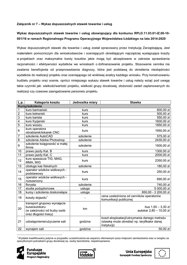 Załącznik nr 7 – Wykaz dopuszczalnych stawek towarów i usług Wykaz dopuszczalnych stawek towarów i usług obowiązujący dla konkursu RPLD.11.03.01-IZ.00-10001/16 w ramach Regionalnego Programu Operacyjnego Województwa Łódzkiego na lata 2014-2020 Wykaz dopuszczalnych stawek dla towarów i usług został opracowany przez Instytucję Zarządzającą. Jest materiałem pomocniczym dla wnioskodawców i oceniających określającym najczęściej występujące koszty w projektach oraz maksymalne kwoty kosztów jakie mogą być akceptowane w zakresie sprawdzenia racjonalności i efektywności wydatków we wnioskach o dofinansowanie projektu. Stosowanie cennika nie zwalania beneficjenta od przeprowadzenia diagnozy, która jest podstawą do określenia niezbędności wydatków do realizacji projektu oraz oceniającego od wnikliwej analizy każdego wniosku. Przy konstruowaniu budżetu projektu oraz ocenie, oprócz niniejszego wykazu stawek towarów i usług należy wziąć pod uwagę takie czynniki jak: wielkość/wartość projektu, wielkość grupy docelowej, złożoność zadań zaplanowanych do realizacji czy czasowe zaangażowanie personelu projektu. L.p. Kategoria kosztu Kursy/szkolenia 1 kurs barmański 2 kurs kelnerski 3 kurs barista 4 kurs fryzjerski 5 kurs wizażu kurs operatora 6 obrabiarek/tokarek CNC 7 szkolenie AutoCAD 8 szkolenie Adobe Photoshop szkolenie księgowość w małej 9 firmie 10 prawo jazdy Kat. B 11 prawo jazdy Kat. C kurs spawacza TIG, MAG, 12 MMA, MIG 13 obsługa kas fiskalnych operator wózków widłowych 14 podstawowy operator wózków widłowych 15 rozszerzony 16 florysta 17 studia podyplomowe 18 kursy i szkolenia doskonalące 1 1 Jednostka miary Stawka kurs kurs kurs kurs kurs 600,00 zł 500,00 zł 550,00 zł 1600,00 zł 1850,00 zł kurs 1950,00 zł szkolenie szkolenie 575,00 zł 2430,00 zł szkolenie 1500,00 zł kurs kurs 1300,00 zł 2000,00 zł kurs 2350,00 zł szkolenie 180,00 zł kurs 250,00 zł kurs 690,00 zł szkolenie usługa usługa 19 koszty dojazdu - 20 transport grupowy wynajęcie busa/autokaru (w zależności od liczby osób oraz długości trasy) km 21 udostępnienie/użyczenie sali godzina 22 wynajem sali godzina 740,00 zł 5 000,00 zł 850,00 - 3 200,00 zł cena uzależniona od cenników operatorów komunikacji publicznej bus 1,50 – 3,30 zł autokar 2,80 – 10,00 zł koszt eksploatacji/utrzymania danego metrażu (stawkę może określać np. taryfikator danej instytucji) 50,00 zł Wydatek kwalifikowalny jedynie w przypadku uczestniczenia we wsparciu oferowanym poza miejscem zamieszkania oraz w związku ze specyficznymi potrzebami grupy docelowej np. osoby bezrobotne, niepełnosprawne. sala szkoleniowa sala komputerowa sala konferencyjna 2 Personel projektu 1 2 wynagrodzenie nauczyciela 70,00 zł 120,00 zł godzina W celu realizacji zajęć w ramach programów finansowanych ze środków pochodzących z budżetu Unii Europejskiej istnieje możliwość: 1. przydzielenia zajęć nauczycielowi już zatrudnionemu w danej szkole, 2. zatrudnienia nauczyciela z innej szkoły lub placówki. W przypadku 1. tj. przydzielenia nauczycielowi zajęć, w ramach programów finansowanych ze środków pochodzących z budżetu Unii Europejskiej prowadzonych bezpośrednio z uczniami lub wychowankami albo na ich rzecz: za każdą godzinę prowadzenia tych zajęć nauczycielowi przysługuje wynagrodzenie w wysokości ustalonej, jak za godziny ponadwymiarowe - w sposób określony w art. 35 ust. 3 ustawy – Karta Nauczyciela; zajęcia te nie są wliczane do tygodniowego obowiązkowego wymiaru godzin zajęć dydaktycznych, wychowawczych i opiekuńczych, prowadzonych bezpośrednio z uczniami lub wychowankami albo na ich rzecz; wynagrodzenie nauczycieli wymienionych w art. 35a ust. 1 nie uwzględnia się przy obliczaniu kwot wydatkowanych na średnie wynagrodzenia nauczycieli. W przypadku 2. tj. zatrudnienia nauczyciela w szkole lub placówce publicznej, w celu realizacji zajęć w ramach programów finansowanych ze środków pochodzących z budżetu Unii Europejskiej, prowadzonych bezpośrednio z uczniami lub wychowankami albo na ich rzecz, nauczyciel: musi posiadać kwalifikacje określone w przepisach wydanych na podstawie art. 9 ust. 2 i 3 ustawy - Karta Nauczyciela oraz musi spełniać warunki określone w art. 10 ust. 5 pkt 3 i 4 tej ustawy - Karta Nauczyciela. Jest obowiązany przedstawić dyrektorowi szkoły lub placówki informację z Krajowego Rejestru Karnego; zatrudniony jest na zasadach określonych w Kodeksie pracy; za każdą godzinę prowadzenia zajęć, nauczycielowi przysługuje wynagrodzenie nie wyższe niż wynagrodzenie za jedną godzinę ponadwymiarową prowadzenia zajęć ustalone w sposób określony w art. 35 ust. 3 ustawy – Karta Nauczyciela dla nauczyciela dyplomowanego posiadającego wykształcenie wyższe magisterskie i realizującego tygodniowy obowiązkowy wymiar godzin zajęć, o którym mowa w art. 42 ust. 3 w tabeli w lp. 3 Wydatki na wynagrodzenie personelu są kwalifikowalne pod warunkiem, że ich wysokość odpowiada stawkom faktycznie stosowanym u beneficjenta poza projektami współfinansowanymi z funduszy strukturalnych i Funduszu Spójności na analogicznych stanowiskach lub na stanowiskach wymagających analogicznych kwalifikacji. ustawy – Karta Nauczyciela. 2 doradca zawodowy Staże i praktyki 1 stypendium stażowe 2 koszty związane z odbywaniem staży i praktyk 3 zawodowych 3 opiekun praktykanta lub stażysty Pomoce dydaktyczne i wyposażenie wyposażenie pracowni lub warsztatów szkolnych dla 1 zawodów szkolnictwa zawodowego koszty zawiązane z wdrożeniem mechanizmu racjonalnych usprawnień w 2 celu zapewnienia możliwości pełnego uczestnictwa osób 7 z niepełnosprawnościami 3 godzina 100,00 zł 150 h praktyki zawodowej lub stażu 1 800,00 zł osoba 5 000,00 zł 150 h praktyki zawodowej lub stażu/ grupa do 6 praktykantów lub stażystów - osoba refundacja wynagrodzenia do 5 000,00 zł 4 brutto ; refundacja d