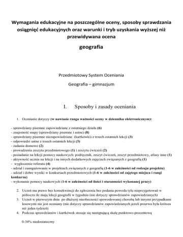 Wymagania edukacyjne na poszczególne oceny, sposoby sprawdzania osiągnięć edukacyjnych oraz warunki i tryb uzyskania wyższej niż przewidywana ocena geografia Przedmiotowy System Oceniania Geografia – gimnazjum I. Sposoby i zasady oceniania 1. Ocenianie dotyczy (w nawiasie ranga ważności oceny w dzienniku elektronicznym): - sprawdziany pisemne zapowiedziane z ostatniego działu (6) - znajomość mapy (sprawdziany pisemne i ustne) (8) - sprawdziany pisemne niezapowiedziane (kartkówki) z trzech ostatnich lekcji (3) - odpowiedzi ustne z trzech ostatnich lekcji (3) - zadania domowe (2) - prowadzenia zeszytu przedmiotowego (1) i zeszytu ćwiczeń (2) - posiadanie na lekcji pomocy naukowych: podręcznik, zeszyt ćwiczeń, zeszyt przedmiotowy, atlasy inne (1) - aktywność ucznia na lekcji i na innych dodatkowych zajęciach związanych z geografią (1) - wygłoszenie referatu (4) - udział i zaangażowanie w projektach związanych z geografią (1-6 w zależności od rodzaju projektu) - udział i dobre wyniki w konkursach przedmiotowych (1-6 w zależności od zajętego miejsca i rangi konkursu) - wykonanie pomocy naukowych (1-6 w zależności od ilości i staranności wykonanej pracy) 2. Uczeń ma prawo bez konsekwencji do zgłoszenia bez podania powodu tylu nieprzygotowań w półroczu ile mają lekcji geografii w tygodniu (nie dotyczy sprawdzianów zapowiedzianych) 3. Uczeń w pierwszym dniu po dłuższej nieobecności spowodowanej chorobą lub innymi przypadkami losowymi nie jest oceniany (nie dotyczy sprawdzianów zapowiedzianych jeżeli przerwa była krótsza niż jeden tydzień) 4. Podczas sprawdzianów i kartkówek stosuje się następującą skalę punktowo-procentową 0-34% niedostateczny 35-49% dopuszczający 50-69% dostateczny 70-84% dobry 85-100% bardzo dobry 5. 6. 7. 8. 9. Jeżeli co najmniej połowa zadań na sprawdzianie lub kartkówce będzie na wymagania konieczne skala może być zaostrzona. Jeżeli uczeń ze sprawdzianu zapowiedzianego uzyska 100% punktów otrzymuje ocenę celującą o ile co najmniej jedno zadanie będzie na wymagania dopełniające. Uczeń ma prawo do poprawy oceny ze sprawdzianu zapowiedzianego lub w razie usprawiedliwionej nieobecności do zaliczenia sprawdzianu na dodatkowych zajęciach w terminie do następnego sprawdzianu zapowiedzianego Uczeń nieobecny bez uzasadnionego powodu na sprawdzianie zapowiedzianym otrzymuje ocenę niedostateczną. Sprawdziany są zapowiedziane co najmniej z tygodniowym wyprzedzeniem Ocena za pierwsze półrocze i ocena roczna nie jest średnią arytmetyczną ocen cząstkowych Jeżeli uczeń na pierwsze półrocze otrzyma ocenę niedostateczną lub jest nieklasyfikowany musi zaliczyć to półrocze w terminie do 20 maja II. Wymagania programowe (szczegółowe) na poszczególne oceny Klasa I gimnazjum CELUJĄCY Uczeń spełnia wszystkie wymagania na poszczególne oceny. Z dobrym skutkiem bierze udział w konkursach przedmiotowych. Wykazuje wiedzę wykraczającą poza program nauczania. Wykonuje zadania i ćwiczenia wykraczające poza program nauczania. BARDZO DOBRY - obliczyć skalę mapy znając odległość na mapie i w terenie - wymienić główne kartograficzne metody przedstawiania zjawisk na mapie - rozpoznać typy rzeźby na mapie hipsometrycznej - orientować mapę w terenie według obiektów i igły magnetycznej - wyznaczanie południka miejscowego przy użyciu gnomu - wyznaczyć współrzędne obiektów i powierzchni na mapie Polski z dokładnością do 10 minut - zaznacza na mapach punkty znając ich współrzędne - ustalanie daty przy przekraczaniu linii zmiany daty - wyjaśnia i oblicza zmiany wysokości Słońca nad horyzontem w ciągu roku - wyjaśnia dowody na ruch obiegowy Ziemi - odróżnia strefy oświetlenia na podstawie długości trwania dnia i nocy i kierunku górowania Słońca - wyjaśnianie związku pomiędzy czynnikami klimatycznymi a cechami klimatu na pewnym obszarze - określenie typu klimatu na podstawie miesięcznych sum opadu i przebiegu temperatur - przedstawienie cech płytowej budowy litosfery oraz wykazanie jej związku z występowaniem wulkanizmu i trzęsieniami ziemi - ustalenie procesów rzeźbotwórczych podczas powstawania danej formy powierzchni Ziemi DOBRY - wskazywanie znaczenia skali mapy w przedstawianiu różnych informacji na mapie - rozpoznać formy rzeźby terenu na mapach poziomicowych - przedstawić procedurę orientacji mapy w terenie według obiektów i igły magnetycznej - rozpoznanie obiektów na zdjęciach satelitarnych i mapach topograficznych - analiza treści map różnych rodzajów - porównywanie treści map tematycznych - wyjaśnia termin „geoida” - wyjaśnia dowody na kulistość Ziemi - wskazywanie zniekształcenia siatki kartograficznej w różnych odwzorowaniach - wyznaczyć współrzędne obiektów i powierzchni na mapach świata i kontynentów z dokładnością do 1 stopnia - oblicza prędkość kontową Ziemi w czasie jej ruchu obrotowego - wskazywanie na globusie momentu wschodu, zachodu i południa Słońca w czasie ruchu obrotowego - wyjaśnienie zależności pomiędzy czasem słonecznym a długością geograficzną - wyjaśnia konieczność ustalania czasu urzędowego na danym terytorium - odróżnia czas strefowy, miejscowy (słoneczny) i urzędowy - określa przesuwanie się miejsc wschodu i zachodu Słońca w ciągu roku - przedstawia na rycinach sytuację oświetlenia Ziemi w dniach rozpoczynania się pór roku - wyjaśnia zjawisko dnia i nocy polarnej - porównywanie danych z wykresów klimatycznych oraz treści map klimatycznych - podanie przykładów organizmów tworzących poszczególne formacje roślinne - wskazanie różnic pomiędzy poszczególnymi rodzajami wietrze DOSTATECZNY - przeliczanie skali liczbowej na mianowaną i odwrotnie - wykorzystanie podziałki liniowej do obliczenia odległości w terenie - odróżnianie mapy ogólnogeograficznej od tematycznej - wykonać profil terenu na podstawie mapy poziomicowej - orientowa