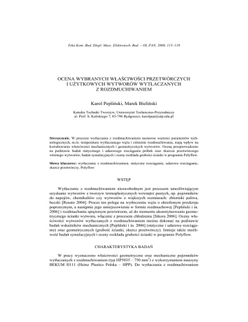 Teka Kom. Bud. Ekspl. Masz. Elektrotech. Bud. – OL PAN, 2008, 115–118 OCENA WYBRANYCH WŁAŚCIWOŚCI PRZETWÓRCZYCH I UŻYTKOWYCH WYTWORÓW WYTŁACZANYCH Z ROZDMUCHIWANIEM Karol Pepliński, Marek Bieliński Katedra Techniki Tworzyw, Uniwersytet Techniczno-Przyrodniczy al. Prof. S. Kaliskiego 7, 85-796 Bydgoszcz, [email protected] Streszczenie. W procesie wytłaczania z rozdmuchiwaniem nastawne wartości parametrów technologicznych, m.in. temperatura wytłaczanego węża i ciśnienie rozdmuchiwania, mają wpływ na kształtowanie właściwości mechanicznych i geometrycznych wytworów. Ocenę przeprowadzono na podstawie badań statycznego i udarowego rozciągania próbek oraz skurczu przetwórczego wtórnego wytworów, badań symulacyjnych i oceny rozkładu grubości ścianki w programie Polyflow. Słowa kluczowe: wytłaczanie z rozdmuchiwaniem, statyczne rozciąganie, udarowe rozciąganie, skurcz przetwórczy, Polyflow WSTĘP Wytłaczanie z rozdmuchiwaniem nieswobodnym jest procesem umożliwiającym uzyskanie wytworów z tworzyw termoplastycznych wewnątrz pustych, np. pojemników do napojów, chemikaliów czy wytworów o większych rozmiarach: zbiorniki paliwa, beczki [Rosato 2004]. Proces ten polega na wytłoczeniu węża o określonym przekroju poprzecznym, a następnie jego umiejscowieniu w formie rozdmuchowej [Pepliński i in. 2006] i rozdmuchaniu sprężonym powietrzem, aż do momentu ukonstytuowania geometrycznego ścianki wytworu, włącznie z procesem chłodzenia [Sikora 2006]. Oceny właściwości wytworów wytłaczanych z rozdmuchiwaniem można dokonać na podstawie badań wskaźników mechanicznych [Pepliński i in. 2006] (statyczne i udarowe rozciąganie) oraz geometrycznych (grubość ścianki, skurcz przetwórczy). Istnieje także możliwość badań symulacyjnych i oceny rozkładu grubości ścianki w programie Polyflow. CHARAKTERYSTYKA BADAŃ W pracy wyznaczono właściwości geometryczne oraz mechaniczne pojemników wytłaczanych z rozdmuchiwaniem (typ HP5035 – 750 mm3) z wykorzystaniem maszyny BEKUM H111 (Heinz Plastics Polska – HPP). Do wytłaczania z rozdmuchiwaniem 116 Karol Pepliński, Marek Bieliński pojemników stosowano bimodalny HDPE (BS2541, Borelis). Zmienne wejściowe parametry procesu wytłaczania z rozdmuchiwaniem to temperatura wytłaczanego węża Tm: 175, 190, 210°C i ciśnienie rozdmuchiwania pb: 0,35, 0,69, 0,9, 1,32 MPa. Rozkład grubości ścianki wyznaczono z wykorzystaniem urządzenia Magma Mike (HPP). Pomiar skurczu przetwórczego wykonano stosując urządzenie Contura® G2 RDS wraz z głowicą skanującą (Akson Bydgoszcz). Do pomiaru statycznego i udarowego rozciągania próbek zastosowano maszynę Instron 4401 i PSd 50/15 (Politechnika Poznańska). WYNIKI BADAŃ Na podstawie badań ujawniono istotny wpływ ciśnienia rozdmuchiwania i temperatury wytłaczanego węża na wskaźniki mechaniczne statycznego i udarowego rozciągania. Zwiększenie pb i obniżenie Tm powodowało wzrost wartości badanych wskaźników (rys. 1). Także w przypadku pomiaru skurczu przetwórczego wtórnego dostrzeżono, że wzrost pb i obniżenie Tm powoduje jego zmniejszenie zarówno w kierunku osiowym, jak i poprzecznym butelki (rys. 2). Zaobserwowano również anizotropie skurczową, której średnia wartość wyniosła 51,6%. a) b) Rys. 1. Wpływ ciśnienia rozdmuchiwania pb i temperatury wytłaczanego węża Tm na: a) wytrzymałość na statyczne rozciąganie, b) wytrzymałość na udarowe rozciąganie Fig. 1. Influence of blow molding pressure and temperature of extruded parison on: a) tensile strenght, b) tensile impact strenght Na podstawie wyników badań skurczu przetwórczego potwierdzono, że podczas konstruowania gniazd form wytłaczarsko-rozdmuchowych należy uwzględnić fakt, iż w kierunku poprzecznym wytworu skurcz tworzywa jest większy aniżeli w kierunku osiowym. Na tej podstawie zaproponowano również zależność dla wymiaru osiowego Log i poprzecznego Lpg w gnieździe formującym: oraz Log=Lo + so·Lo (1) Lpg=Lp + sp·L (2) gdzie: Lo, Lp – wymiar osiowy i poprzeczny wytworu rozdmuchanego, mm, OCENA WYBRANYCH WŁAŚCIWOŚCI PRZETWÓRCZYCH... a) 117 so, sp – bezwzględna wartość skurczu osiowego i poprzecznego przy danym pb i b) T m. Rys. 2. Wpływ ciśnienia rozdmuchiwania i temperatury wytłaczanego węża na skurcz przetwórczy: a) osiowy (So), b) poprzeczny (Sp) Fig. 2. Influence of blow molding pressure and temperature of extruded parison on processing shrinkage: a) axial (So), b) across (Sp) Rys. 3. Porównanie rozkładu grubości ścianki wytworu rozdmuchiwanego na podstawie danych symulacyjnych i eksperymentalnych w płaszczyźnie y pojemnika Fig. 3. Comparison the distribution of blow molding wall thickness with simulation and experimental data in y plane of container 118 Karol Pepliński, Marek Bieliński Wyniki badań rozkładu grubości ścianki uzyskane w badaniach teoretycznych (symulacyjnych Polyflow) porównano z wynikami badań eksperymentalnych (rys. 3). Wykazano niewielką różnicę pomiędzy wynikami uzyskanymi doświadczalnie i symulacyjnie. Posługując się programem symulacyjnym wykazano także pewien wpływ analizowanych parametrów technologicznych (pb i Tm) na grubość ścianki pojemnika (ok. 0,25 mm). W badaniach eksperymentalnych różnice te wyniosły około 0,5 mm. Potwierdzono także wpływ geometrii formy wytłaczarsko-rozdmuchowej na grubość ścianki pojemnika. WNIOSKI Na podstawie badań wybranych właściwości mechanicznych i geometrycznych wytworów wytłaczanych z rozdmuchiwaniem stwierdzono możliwość kształtowania (konstytuowania) cech materiałowych i geometrycznych opakowań o przewidywanej postaci (głównie poprzez sterowanie nastawnymi wartościami parametrów technologicznych Tm i pb). Najkorzystniejszymi wartościami rozpatrywanych wielkości wejściowych w analizowanych zakresach są Tm = 175ºC i pb = 1,3 MPa. Badania symulacyjne dostarczyły ważnych informacji potwierdzają