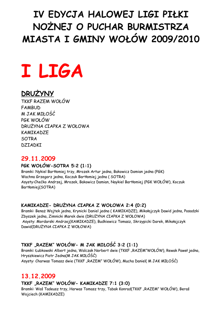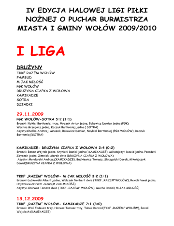 IV EDYCJA HALOWEJ LIGI PIŁKI NOŻNEJ O PUCHAR BURMISTRZA MIASTA I GMINY WOŁÓW 2009/2010 I LIGA DRUŻYNY TKKF RAZEM WOŁÓW FAMBUD M JAK MIŁOŚĆ PGK WOŁÓW DRUŻYNA CIAPKA Z WOŁOWA KAMIKADZE SOTRA DZIADKI 29.11.2009 PGK WOŁÓW-SOTRA 5:2 (1:1) Bramki: Nykiel Bartłomiej trzy, Mrozek Artur jedna, Bakowicz Damian jedna (PGK) Wachna Grzegorz jedna, Koczuk Bartłomiej jedna ( SOTRA) Asysty:Chećko Andrzej, Mrozek, Bakowicz Damian, Naykiel Bartłomiej (PGK WOŁÓW), Koczuk Bartłomiej(SOTRA) KAMIKADZE- DRUŻYNA CIAPKA Z WOŁOWA 2:4 (0:2) Bramki: Benaż Wojtek jedna, Krynicki Daniel jedna ( KAMIKADZE), Mikołajczyk Dawid jedna, Posadzki Zbyszek jedna, Zimnicki Marek dwie (DRUŻYNA CIAPKA Z WOŁOWA) Asysty: Mordarski Andrzej(KAMIKADZE), Budkiewicz Tomasz, Skrzypicki Darek, Mikołajczyk Dawid(DRUŻYNA CIAPKA Z WOŁOWA) TKKF „RAZEM” WOŁÓW- M JAK MIŁOŚĆ 3:2 (1:1) Bramki: Łubkowski Albert jedna, Walczak Norbert dwie (TKKF „RAZEM”WOŁÓW), Rewak Paweł jedna, Hryszkiewicz Piotr Jedna(M JAK MIŁÓŚĆ) Asysty: Charwas Tomasz dwie (TKKF „RAZEM” WOŁÓW), Mucha Daniel( M JAK MIŁOŚĆ) 13.12.2009 TKKF „RAZEM” WOŁÓW- KAMIKADZE 7:1 (3:0) Bramki: Woś Tadeusz trzy, Harwas Tomasz trzy, Tabak Konrad(TKKF „RAZEM” WOŁÓW), Beraś Wojciech (KAMIKADZE) FAMBUD- PGK WOŁÓW 6:0 (2:0) Bramki: Gacek Marek dwie, Kruczek Damian trzy, Gałecki Tomasz (FAMBUD) DZIADKI- SOTRA 1:3 (0:1) Bramki: Fałat Piotr, Wachna Piotr, Koczuk Bartłomiej(SOTRA), Olszewski Krzysztof(DZIADKI) M JAK MIŁOŚĆ- DRUŻYNA CIAPKA Z WOŁOWA 6:1(3:0) Bramki: Hryszkiewicz Piotr dwie, Krzykwa Michał, Rewak Michał, Konon Patryk(M JAK MIŁOŚĆ), Skrzypicki Dariusz(DRUŻYNA CIAPKA Z WOŁOWA) 10.01.2010 KAMIKADZE- PGK WOŁÓW 2:1 TKKF „RAZEM” WOŁÓW- SOTRA 2:1 FAMBUD- DRUŻYNA CIAPKA Z WOŁOWA 7:0 DZIADKI- M JAK MIŁOŚĆ 4:5 24.01.2010 PGK WOŁÓW- DRUŻYNA CIAPKA Z WOŁOWA 2:1 (2:0) Bramki: Nykiel Bartłomiej jedna, Mrozek Artur jedna (PGK WOŁÓW), Stróżyński Daniel jedna(DRUŻYNA CIAPKA Z WOŁOWA) SOTRA- KAMIKADZE 3:10 (1:3) Bramki: Koczuk Bartłomiej dwie, Karwacki Józef jedna(SOTRA), Ziółkowski Szymon sześć, Mordarski Andrzej dwie, Czyżowicz Wojciech jedna, Sobotka Rafał jedna(KAMIKADZE) TKKF „RAZEM” WOŁÓW- DZIADKI 11:3 (5:2) Bramki: Walczak Norbert pięć, Harwas Tomasz dwie, Woś Tadeusz dwie, Sawko Krystian jedna, Wlaźlak Bartłomiej jedna(TKKF „RAZEM WOŁÓW), Olszewski Krzysztof trzy(DZIADKI) M JAK MIŁOŚĆ- FAMBUD 2:5 (1:1) Bramki: Krzykwa Michał dwie(M JAK MIŁOŚĆ), Marcinkowski Adrian jedna, Gałecki Tomasz jedna, Gacek Marek jedna, Koczuk Piotr jedna, Kruczek Damian jedna( FAMBUD) 22.02.2010 DZIADKI- FAMBUD mecz nie odbył się 28.02.2010 PGK WOŁÓW- TKKF „RAZEM” WOŁÓW 0:2(0:1) Bramki: Tabak Konrad jedna, Woś Tadeusz jedna(TKKF) SOTRA- M JAK MIŁOŚĆ 0:3 walkower KAMIKADZE- FAMBUD 2:2 (0:0) Bramki: Krynicki Daniel dwie(KAMIKADZE), Gałecki Tomasz jedna, Krynicki Daniel jedna( FAMBUD) 6.03.2010 PGK WOŁÓW- DZIADKI 3:0 walkower FAMBUD- SOTRA 4:3 (0:1) Bramki: Szewczyk Grzegorz dwie, Kruczek Damian jedna, Gacek Marek jedna(FAMBUD), Wachna Grzegorz trzy(SOTRA) M JAK MIŁOŚĆ- KAMIKADZE 3:6 (3:3) Bramki: Hryszkiewicz Piotr dwie, Hryszkiewicz jedna(M JAK MIŁÓŚĆ), Ziółkowski Szymon trzy, Modarski Andrzej dwie, Hoduj Paweł jedna(KAMIKADZE) TKKF „RAZEM” WOŁÓW- DRUŻYNA CIAPKA Z WOŁOWA 7:1 (3:0) Bramki: Walczak Norbert cztery, Tabak Konrad jedna, Wlany Bartłomiej jedna, Harwas Tomasz jedna(TKKF „RAZEEM” WOŁÓW), Jaworski Krzysztof jedna (DRUŻYNA CIAPKA Z WOŁOWA) II LIGA GR. A DRUŻYNY ORKAN MOJĘCICE I LORDY ROCZNIK 93 CICHA WODA SCOOBY TEAM HEROS STARY WOŁÓW OLD BOY SKOŁY Z RATAJ BANDA RAMZESA 22.11.2009 ORKAN MOJĘCICE I- CICHA WODA 4:2 (0:0) Bramki: Leszkowicz Piotr dwie, Szumalanski Krzysztof, Kopociński Radek, Witiak Łukasz, Wytyk Asysty: Karbowski Paweł dwie, Kasiński Piotr, Leszkowicz Piotr, Kopociński Radek HEROS STARY WOŁÓW- SOKOŁY Z RATAJ 6:3 (3:2) Bramki: Kuczma Mateusz, Romanowicz Dawid, Pawłowski Ireneusz dwie, Żarczyński Rafał dwie, Korzeniowski Andrzej dwie Asysty: Ulatowski Tomek, Żarczyński Rafał, Wróblewski Tomek, Romanowicz Dawid, Pawłowski Irek dwie, Romanowicz Krzysztof, Korzeniowski Andrzej, Zabłocki Tomasz ORKAN MOJĘCICE I - SCOOBY TEAM 2:1 (0:0) Bramki: Karbowski Paweł, Suchan Mariusz, Leszkowicz Piotr Asysty: Karbowski Paweł, Burant Dawid Żółte kartki: Wodnicki Adam, Wityk, Leszkowicz Piotr BANDA RAMZESA- ROCZNIK’93 2:12 (0:5) Bramki: Szadej Tobiasz dwie, Walniczak Kacper cztery, Lofek Patryk dwie, Świtała Łukasz dwie, Szafrański Jacek dwie, Wysoczański Adam dwie Asysty: Stawiski Sebastian, Walniczak kacper, Pytowski Damian, Szafrański Jacek, Lofek Patryk, Wysoczański Adam trzy, Świstała Łykasz trzy OLD BOY- LORDY 1:7 (0:5) Bramki: Manain Krzysztof, Tabak Krzysztof trzy, Walaś Tomasz dwie, Gołębiewski Marcin, Kołodziej Marcin Asysty: Krzykwa Mieczysław, Tabak Krzysztof dwie, Gołębiewski Marcin dwie, Walaś Tomasz dwie, Wachowiak Bartosz 13.12.2009 HEROS STARY WOŁÓW- ORKAN MOJĘCICE I 4:8 (1:2) Bramki: Leszkowicz Piotr dwie, Wodnicki Adam dwie, Karbowski Paweł, Fila Dawid, Kopociński Radek, Jędrycha Mateusz(ORKAN MOJĘCICE I), Pawłowski Ireneusz trzy, Janus Paweł OLD BOY- SOKOŁY Z RATAJ 5:1 (2:0) Bramki: Borzyński Marek trzy, Wysoczański Kazimierz, Janas Jan(OLD BOY), Żarczyński Rafał (SOKOŁY Z RATAJ) BANDA RAMZESA- CICHA WODA 0:7 (0:4) Bramki: Witiak Łukasz dwie, Kasiński Piotr dwie, Kozak Jarosław dwie. Szumluński Krzysztof(CICHA WODA) SCOOBY TEAM- ROCZNIK ‘93 5:3 (1:2) Bramki: Suchan Mariusz dwie, Matusiewicz Artur dwie, Stańczyk Emanuel (SCOOBY TEAM), ), Świtała Łukasz, Szafrański Jacek, Lofek Patyk(ROCZNIK’93) CICHA WODA- LORDY 2:5 (0:2) Bramki: Gołębiewski Marcin dwie, Mucha Kamil dwie, Walaś Tomasz(LORDY), Kasiński Piotr, Witiak Tomasz 10.01.2010 OLD BOY- ORKAN MOJĘCICE I 0:1 SCOOBY TEAM- CICHA WODA 2:0 LORDY- SOKOŁY Z RATAJ 3:1 SCOOBY TEA
