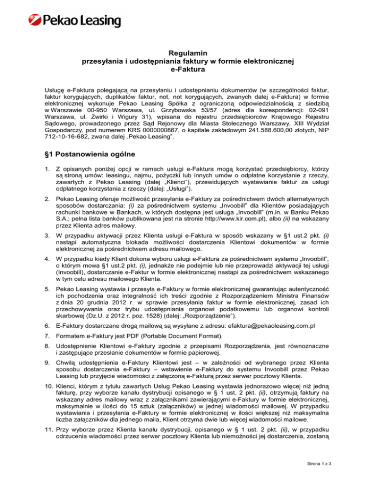 Regulamin przesyłania i udostępniania faktury w formie elektronicznej e-Faktura Usługę e-Faktura polegającą na przesyłaniu i udostępnianiu dokumentów (w szczególności faktur, faktur korygujących, duplikatów faktur, not, not korygujących, zwanych dalej e-Faktura) w formie elektronicznej wykonuje Pekao Leasing Spółka z ograniczoną odpowiedzialnością z siedzibą w Warszawie 00-950 Warszawa, ul. Grzybowska 53/57 (adres dla korespondencji: 02-091 Warszawa, ul. świrki i Wigury 31), wpisana do rejestru przedsiębiorców Krajowego Rejestru Sądowego, prowadzonego przez Sąd Rejonowy dla Miasta Stołecznego Warszawy, XIII Wydział Gospodarczy, pod numerem KRS 0000000867, o kapitale zakładowym 241.588.600,00 złotych, NIP 712-10-16-682, zwana dalej „Pekao Leasing”. §1 Postanowienia ogólne 1. Z opisanych poniŜej opcji w ramach usługi e-Faktura mogą korzystać przedsiębiorcy, którzy są stroną umów: leasingu, najmu, poŜyczki lub innych umów o odpłatne korzystanie z rzeczy, zawartych z Pekao Leasing (dalej „Klienci”), przewidujących wystawianie faktur za usługi odpłatnego korzystania z rzeczy (dalej: „Usługi”). 2. Pekao Leasing oferuje moŜliwość przesyłania e-Faktury za pośrednictwem dwóch alternatywnych sposobów dostarczania: (i) za pośrednictwem systemu „Invoobill” dla Klientów posiadających rachunki bankowe w Bankach, w których dostępna jest usługa „Invoobill” (m.in. w Banku Pekao S.A.; pełna lista banków publikowana jest na stronie http://www.kir.com.pl), albo (ii) na wskazany przez Klienta adres mailowy. 3. W przypadku aktywacji przez Klienta usługi e-Faktura w sposób wskazany w §1 ust.2 pkt. (i) nastąpi automatyczna blokada moŜliwości dostarczenia Klientowi dokumentów w formie elektronicznej za pośrednictwem adresu mailowego. 4. W przypadku kiedy Klient dokona wyboru usługi e-Faktura za pośrednictwem systemu „Invoobill”, o którym mowa §1 ust.2 pkt. (i), jednakŜe nie podejmie lub nie przeprowadzi aktywacji tej usługi (Invoobill), dostarczanie e-Faktur w formie elektronicznej nastąpi za pośrednictwem wskazanego w tym celu adresu mailowego Klienta. 5. Pekao Leasing wystawia i przesyła e-Faktury w formie elektronicznej gwarantując autentyczność ich pochodzenia oraz integralność ich treści zgodnie z Rozporządzeniem Ministra Finansów z dnia 20 grudnia 2012 r. w sprawie przesyłania faktur w formie elektronicznej, zasad ich przechowywania oraz trybu udostępniania organowi podatkowemu lub organowi kontroli skarbowej (Dz.U. z 2012 r. poz. 1528) (dalej: „Rozporządzenie”). 6. E-Faktury dostarczane drogą mailową są wysyłane z adresu: [email protected] 7. Formatem e-Faktury jest PDF (Portable Document Format). 8. Udostępnienie Klientowi e-Faktury zgodnie z przepisami Rozporządzenia, jest równoznaczne i zastępujące przesłanie dokumentów w formie papierowej. 9. Chwilą udostępnienia e-Faktury Klientowi jest – w zaleŜności od wybranego przez Klienta sposobu dostarczenia e-Faktury – wstawienie e-Faktury do systemu Invoobill przez Pekao Leasing lub przyjęcie wiadomości z załączoną e-Fakturą przez serwer pocztowy Klienta. 10. Klienci, którym z tytułu zawartych Usług Pekao Leasing wystawia jednorazowo więcej niŜ jedną fakturę, przy wyborze kanału dystrybucji opisanego w § 1 ust. 2 pkt. (ii), otrzymują faktury na wskazany adres mailowy wraz z załącznikami zawierającymi e-Faktury w formie elektronicznej, maksymalnie w ilości do 15 sztuk (załączników) w jednej wiadomości mailowej. W przypadku wystawiania i przesyłania e-Faktury w formie elektronicznej w ilości większej niŜ maksymalna liczba załączników dla jednego maila, Klient otrzyma dwie lub więcej wiadomości mailowe. 11. Przy wyborze przez Klienta kanału dystrybucji, opisanego w § 1 ust. 2 pkt. (ii), w przypadku odrzucenia wiadomości przez serwer pocztowy Klienta lub niemoŜności jej dostarczenia, zostaną Strona 1 z 3 podjęte nie mniej niŜ 3 próby ponownego jej wysłania w okresie kolejnych 24 godzin. W przypadku, gdy wszystkie próby zakończą się niepowodzeniem z powodów leŜących po stronie Klienta (np. brak serwera pocztowego, brak przestrzeni dyskowej, zablokowane konto, brak konta, itp.), wiadomość uzyskuje status „ODRZUCONA”, co oznacza, Ŝe udostępnienie e-Faktury w formie elektronicznej zakończyło się niepowodzeniem i skutkuje tym, Ŝe Klientowi zostanie wysłana faktura w formie papierowej zgodnie z wymogami prawa podatkowego określającymi sposób wystawiania faktur. 12. W przypadku, jeŜeli w dwóch kolejnych miesiącach udostępnienie e-Faktury w formie elektronicznej zakończy się niepowodzeniem z powodów leŜących po stronie Klienta, Pekao Leasing uznaje, Ŝe nastąpiło odwołanie zgody na przesyłanie i udostępnianie e-Faktury w formie elektronicznej. Ponowne skorzystanie przez Klienta z usługi e-Faktura wymaga ponownego złoŜenia oświadczenia o wyraŜeniu zgody na przesyłanie, w tym udostępnianie e-Faktury wystawionej z tytułu świadczonych przez Pekao Leasing na rzecz Klienta Usług. §2 Opis i warunki udostępniania usługi e-Faktura 1. Pekao Leasing udostępnia Klientowi e-Faktury wystawiane z tytułu świadczonych przez Pekao Leasing Usług, jak równieŜ powiadamia Klienta o wystawieniu i udostępnieniu e-Faktury. 2. Warunkiem skorzystania przez Klienta z usługi e-Faktura jest złoŜenie przez Klienta oświadczenia o wyraŜeniu zgody na przesyłanie, w tym udostępnianie, e-Faktury wystawionej z tytułu świadczonych przez Pekao Leasing na rzecz Klienta Usług w formie: a) pisemnej, złoŜonego przy zawieraniu z Pekao Leasing umowy leasingu, najmu, umowy poŜyczki lub innej umowy o podobnym charakterze, której przedmiotem jest odpłatne udostępnienie rzeczy lub w późniejszym terminie w trakcie trwania powyŜej wymienionych umów poprzez przesłanie oświadczenia o wyraŜeniu zgody na adres: Pekao Leasing Sp. z o.o. ul. świrki i Wigury 31, 02-091 W