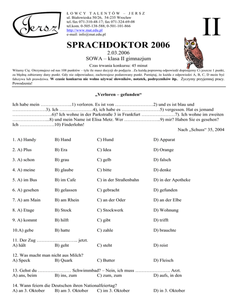 ŁOWCY TALENTÓW – JERSZ ul. Białowieska 50/26, 54-235 Wrocław tel./fax 071-310-48-17; fax 071-324-69-08 tel.kom. 0-505-138-588; 0-501-101-866 http://www.mat.edu.pl e-mail: [email protected] II SPRACHDOKTOR 2006 2.03.2006 SOWA – klasa II gimnazjum Czas trwania konkursu: 45 minut Witamy Cię. Otrzymujesz od nas 108 punktów – tyle ile masz decyzji do podjęcia . Za każdą poprawną odpowiedź dopisujemy Ci jeszcze 1 punkt, za błędną zabieramy dany punkt. Gdy nie odpowiadasz, zachowujesz podarowany punkt. Pamiętaj, że każda z odpowiedzi A, B, C, D może być fałszywa lub prawdziwa. W czasie konkursu nie wolno używać słowników, notatek, podręczników itp.. Życzymy przyjemnej pracy. Powodzenia! „Verloren – gefunden“ Ich habe mein ………………..1) verloren. Es ist von ……………………2) und es ist blau und …………………3). Ich …………………4), ich habe es ……………………5) vergessen. Hat es jemand …………………….6)? Ich wohne in der Parkstraße 3 in Frankfurt …………………7). Ich wohne im zweiten …………………...8) und mein Name ist Elisa Metz. Wer …………………..9) mir? Haben Sie es gesehen? Ich ………………….10) Finderlohn! Nach „Schuss“ 35, 2004 1. A) Handy B) Hand C) Hund D) Apparat 2. A) Plus B) Era C) Idea D) Orange 3. A) schon B) grau C) gelb D) falsch 4. A) meine B) glaube C) bitte D) denke 5. A) im Bus B) im Cafe C) in der Straßenbahn D) in der Apotheke 6. A) gesehen B) gelassen C) gebracht D) gefunden 7. A) am Main B) am Rhein C) an der Oder D) an der Elbe 8. A) Etage B) Stock C) Stockwerk D) Wohnung 9. A) kommt B) hilft C) gibt D) trifft 10.A) gebe B) hatte C) zahle D) brauchte 11. Der Zug …………………….. jetzt. A) hält B) geht C) steht D) reist 12. Was macht man nicht aus Milch? A) Speck B) Quark C) Butter D) Fleisch 13. Gehst du ………………… Schwimmbad? – Nein, ich muss …………………. Arzt. A) ans, beim B) ins, zum C) zum, zum D) aufs, in den 14. Wann feiern die Deutschen ihren Nationalfeiertag? A) an 3. Oktober B) am 3. Oktober C) im 3. Oktober D) in 3. Oktober 15. Die Tante kommt erst ……………… Mittwoch. A) auf B) gegen C) am D) von 16. Herr Doktor, …………………… muss ich diese Tabletten einnehmen? A) wann B) wie lange C) bis wann D) wie oft 17. Das Kind geht spazieren, weil …………………………. A) das Wetter ist schön. B) es Lust hat. C) die Sonne scheint. D) es ist klein. 18. Guten Abend, Herr Jakob. Darf ich mit …………………….. sprechen? A) Ihrer B) Ihm C) Ihnen D) Herrn 19. Ist das Bild hässlich? – Nein, es ist sehr ……………………. A) schön B) hübsch C) langweilig D) klein 20. Was ist richtig? - Soll ich …………………….. Schuhe nehmen? A) die schwarzen B) alle schwarzen C) viele schwarzen D) diese schwarzen 21. Was ………………… heute im Fernsehen? A) rennt B) geht D) läuft C) kommt 22. Hallo Thommy! Was hast du ………………….. mich? A) für B) gegen C) an D) von 23. Warum spielst du so falsch? A) Weil ich nicht geübt habe. C) Darum ich nicht geübt habe. B) Da ich nicht geübt habe. D) Leider habe ich nicht geübt. 24. Zahnbürsten gibt es ……………………. A) im Supermarkt B) in der Apotheke C) in der Bücherei D) in dem Kino 25. Der Kalender hängt …………………… A) an der Wand B) über dem Bett C) neben dem Bild D) an der Decke 26. Was kann man in Berlin machen? A) ein Museum besuchen C) sich eine alte Kirche ansehen. B) einen Einkaufsbummel machen. D) ins Theater gehen. 27. ……………… spielen Sie Tennis? A) Wo B) Warum C) Wie oft D) Wann Zapraszamy do: konkursu DEUTSCHFREUND 2006 w nowym roku szkolnym 2006/2007, udziału w obozie „Konie, matematyka i języki“ w Serpelicach w czasie wakacji 2006. Obóz przeznaczony jest dla ambitnych uczniów szkół podstawowych od klasy 3 i uczniów gimnazjów, którym nie przeszkadza „odrobina nauki“ na tym obozie. Szczegóły: www.mat.edu.pl © Copyright by Łowcy Talentów – JERSZ, Wrocław 2006