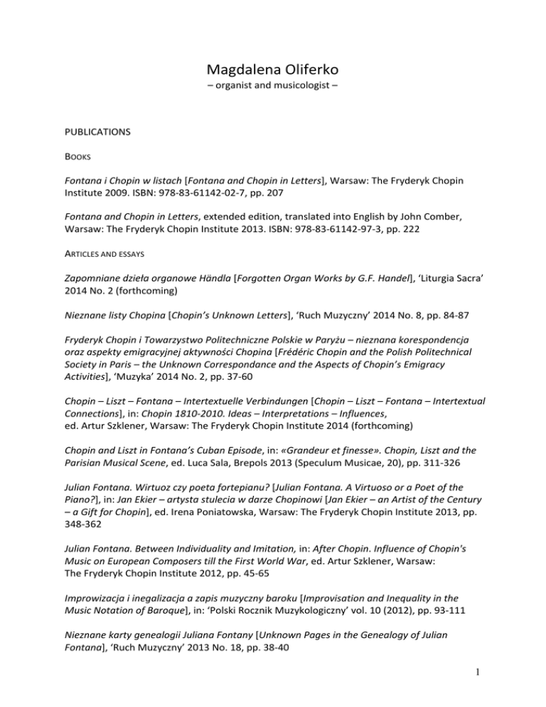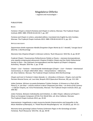 Magdalena Oliferko – organist and musicologist – PUBLICATIONS BOOKS Fontana i Chopin w listach [Fontana and Chopin in Letters], Warsaw: The Fryderyk Chopin Institute 2009. ISBN: 978-‐83-‐61142-‐02-‐7, pp. 207 Fontana and Chopin in Letters, extended edition, translated into English by John Comber, Warsaw: The Fryderyk Chopin Institute 2013. ISBN: 978-‐83-‐61142-‐97-‐3, pp. 222 ARTICLES AND ESSAYS Zapomniane dzieła organowe Händla [Forgotten Organ Works by G.F. Handel], ‘Liturgia Sacra’ 2014 No. 2 (forthcoming) Nieznane listy Chopina [Chopin’s Unknown Letters], ‘Ruch Muzyczny’ 2014 No. 8, pp. 84-‐87 Fryderyk Chopin i Towarzystwo Politechniczne Polskie w Paryżu – nieznana korespondencja oraz aspekty emigracyjnej aktywności Chopina [Frédéric Chopin and the Polish Politechnical Society in Paris – the Unknown Correspondance and the Aspects of Chopin’s Emigracy Activities], ‘Muzyka’ 2014 No. 2, pp. 37-‐60 Chopin – Liszt – Fontana – Intertextuelle Verbindungen [Chopin – Liszt – Fontana – Intertextual Connections], in: Chopin 1810-‐2010. Ideas – Interpretations – Influences, ed. Artur Szklener, Warsaw: The Fryderyk Chopin Institute 2014 (forthcoming) Chopin and Liszt in Fontana’s Cuban Episode, in: «Grandeur et finesse». Chopin, Liszt and the Parisian Musical Scene, ed. Luca Sala, Brepols 2013 (Speculum Musicae, 20), pp. 311-‐326 Julian Fontana. Wirtuoz czy poeta fortepianu? [Julian Fontana. A Virtuoso or a Poet of the Piano?], in: Jan Ekier – artysta stulecia w darze Chopinowi [Jan Ekier – an Artist of the Century – a Gift for Chopin], ed. Irena Poniatowska, Warsaw: The Fryderyk Chopin Institute 2013, pp. 348-‐362 Julian Fontana. Between Individuality and Imitation, in: After Chopin. Influence of Chopin's Music on European Composers till the First World War, ed. Artur Szklener, Warsaw: The Fryderyk Chopin Institute 2012, pp. 45-‐65 Improwizacja i inegalizacja a zapis muzyczny baroku [Improvisation and Inequality in the Music Notation of Baroque], in: ‘Polski Rocznik Muzykologiczny’ vol. 10 (2012), pp. 93-‐111 Nieznane karty genealogii Juliana Fontany [Unknown Pages in the Genealogy of Julian Fontana], ‘Ruch Muzyczny’ 2013 No. 18, pp. 38-‐40 1 Archiwum Ludwika Bronarskiego. Zapomniana skarbnica chopinowska [The Archive of Prof. Ludwik Bronarski in Freiburg (CH). The Forgotten Chopin‘s Treasury], ‘Ruch Muzyczny’ 2012 No. 4, pp. 30-‐31 Julian Fontana na Kubie [Julian Fontana in Cuba], ‘Ruch Muzyczny’ 2011 No. 14, pp. 32-‐36 Jak Kuba Chopinowi... Chopinowskie święto w Hawanie [Chopin Got What He Deserved ... Chopin Festival in Havana], ‘Ruch Muzyczny’ 2010 No. 20, pp. 26-‐27 Koncert Fontany w sali Erarda. Sukces czy porażka? [Fontana’s Concert at the Salle Erard. Success or failure?], ‘Ruch Muzyczny’ 2010 No. 13, pp. 36-‐39 Przyjaźń czy animozja? Nieznane aspekty relacji Fontany i Chopina [Friendship or Animosity? Unknown Aspects of the Relationship between Chopin and Fontana], ‘Ruch Muzyczny’ 2010 No. 2, pp. 30-‐34 REVIEWS Bach à la polonaise, review of the book of Dr. Szymon Paczkowski Styl polski w muzyce Johanna Sebastiana Bacha [Polish Style in the Music of J.S. Bach], Lublin 2011, ‘Ruch Muzyczny’ 2014 No. 9, pp. 85-‐86 Chopin i jego muzyczny kosmos [Chopin and His Musical Cosmos], review of the book of Prof. Jean-‐Jacques Eigeldinger L'Univers musical de Chopin, Cracow 2010, ‘Ruch Muzyczny’ 2013 No. 12, pp. 37-‐38 Feliks Nowowiejski w nowej odsłonie [The new face of Felix Nowowiejski], review of the book of Ireneusz Wyrwa Problematyka wykonawcza utworów organowych Feliksa Nowowiejskiego w świetle poglądów estetycznych kompozytora [The Performance Practice of the Organ Works F. Nowowiejskis in the Context of His Aesthetic Views], Lublin 2011, ‘Ruch Muzyczny’ 2013 Nr. 10, p. 38 Händel. Niewolnik sławy [Händel. The Slave of Fame], review of the book by Christopher Hogwood, Händel, translated by B. Świderska, Cracow 2010, ‘Ruch Muzyczny’ 2011 No. 20, pp. 36-‐37 Listy Chopina na nowo odczytane [The Letters of Chopin as Interpreted Anew], review of the book Korespondencja Fryderyka Chopina [Chopin’s Correspondance], Vol.1 (1816-‐1831), ed. Prof. Zofia Helman, Prof. Zbigniew Skowron and Hanna Wróblewska-‐Straus, Warsaw 2009, ‘Ruch Muzyczny’ 2010 No. 23, pp. 34-‐35 Dwa oblicza Chopina [Two Faces of Chopin], review of the book by Prof. Mieczysław Tomaszewski Chopin. Fenomen i paradoks [Chopin. The Phenomenon and the Paradox], Lublin 2009, ‘Ruch Muzyczny’ 2011 No. 13, p. 39 2 Jak słuchamy Chopina [How Do We Listen to Chopin?], review of the book of Prof. Irena Poniatowska W kręgu recepcji i rezonansu muzyki. Szkice chopinowskie [In the Circle of Reception and Resonance of Music. Chopin’s Sketches], Warsaw 2008, ‘Ruch Muzyczny’ 2010 No. 15, pp. 33-‐34 Klawesynowa perła Gdańska [The Harpsichord Pearl of Danzig], review of the CD of Alina Ratkowska, Johann Jeremias du Grain. Complete Harpsichord Concertos, Sarton Records 2012], ‘Ruch Muzyczny’ 2014 No. 6, p. 82 Schnabel na Świętej Górze [Schnabel on The Holy Mountain], review of the CD Musica Sacromontana. Joseph Schnabel, DUX 2014], „Ruch Muzyczny” 2014 No. 9, p. 88 CONFERENCES AND CONGRESSES 43. International Conference of Association of Polish Composers (ZKP) Muzyka wśród innych sztuk – związki i inspiracje [Music Among Other Arts – Relationships and Inspirations], Bydgoszcz, Music Academy, 9th-‐11th October 2014 „Twój geniusz nie ma osiąść na fortepianie i koncertach, Ty z oper masz się unieśmiertelnić.” – Chopina inspiracje dramatyczną sceną [„Your genius is not supposed to rest on the piano and concerts, it is operas that should immortalize you.“ – Chopin’s inspirations for the drama] 42. International Conference of Association of Polish Composers (ZKP) Musica Ecclesiastica – Vetus et Nova, Opole – Nysa, 23t