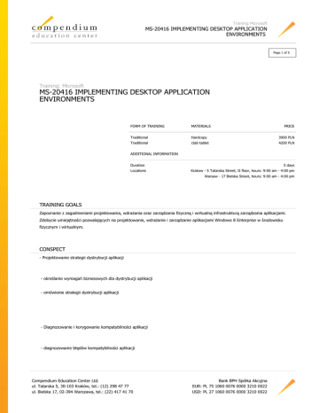 Training Microsoft MS-20416 IMPLEMENTING DESKTOP APPLICATION ENVIRONMENTS Page 1 of 5 Training: Microsoft MS-20416 IMPLEMENTING DESKTOP APPLICATION ENVIRONMENTS FORM OF TRAINING MATERIALS PRICE Traditional Hardcopy 3900 PLN Traditional ctab tablet 4200 PLN ADDITIONAL INFORMATION Duration Locations 5 days Krakow - 5 Tatarska Street, II floor, hours: 9:00 am - 4:00 pm Warsaw - 17 Bielska Street, hours: 9:00 am - 4:00 pm TRAINING GOALS Zapoznanie z zagadnieniami projektowania, wdrażania oraz zarządzania fizyczną i wirtualną infrastrukturą zarządzania aplikacjami. Zdobycie umiejętności pozwalających na projektowanie, wdrażanie i zarządzanie aplikacjami Windows 8 Enterprise w środowisku fizycznym i wirtualnym. CONSPECT - Projektowanie strategii dystrybucji aplikacji - określanie wymagań biznesowych dla dystrybucji aplikacji - omówienie strategii dystrybucji aplikacji - Diagnozowanie i korygowanie kompatybilności aplikacji - diagnozowanie błędów kompatybilności aplikacji Compendium Education Center Ltd. ul. Tatarska 5, 30-103 Kraków, tel.: (12) 298 47 77 ul. Bielska 17, 02-394 Warszawa, tel.: (22) 417 41 70 Bank BPH Spółka Akcyjna EUR: PL 75 1060 0076 0000 3210 0022 USD: PL 27 1060 0076 0000 3210 0022 Training Microsoft MS-20416 IMPLEMENTING DESKTOP APPLICATION ENVIRONMENTS Page 2 of 5 - implementacja rozwiązań korygowania kompatybilności aplikacji - rozwiązywanie błędów kompatybilności z Application Compatibility Toolkit - Wdrażanie aplikacji za pomocą zasad grupy oraz Windows Intune - wdrażanie aplikacji za pomocą zasad grupy - wdrażanie aplikacji za pomocą Windows Intune - Wdrażanie aplikacji za pomocą System Center Configuration Manager - wprowadzenie do wdrażania aplikacji za pomocą Configuration Manager 2012 - wdrażanie aplikacji za pomocą Configuration Manager 2012 - Konfiguracja wdrażania aplikacji samoobsługowych - wprowadzenie do wdrażania aplikacji samoobsługowych - konfiguracja rozwiązań aplikacji samoobsługowyuch z Windows Intune - wdrożenia aplikacji samoobsługowych z Configuration Manager 2012 - wdrożenia aplikacji samoobsługowych z Service Manager 2012 - Projektowanie i implementacja infrastruktury Presentation Virtualization Compendium Education Center Ltd. ul. Tatarska 5, 30-103 Kraków, tel.: (12) 298 47 77 ul. Bielska 17, 02-394 Warszawa, tel.: (22) 417 41 70 Bank BPH Spółka Akcyjna EUR: PL 75 1060 0076 0000 3210 0022 USD: PL 27 1060 0076 0000 3210 0022 Training Microsoft MS-20416 IMPLEMENTING DESKTOP APPLICATION ENVIRONMENTS Page 3 of 5 - ocena wymagań dla Presentation Virtualization - planowanie infrastruktury Presentation Virtualization - wdrażanie infrastruktury Presentation Virtualization - Przygotowanie, konfiguracja i wdrażanie aplikacji Presentation Virtualization - ocenianie strategii aplikacji Presentation Virtualization - wdrażanie Remote Desktop, RemoteApp oraz RD Web Access - Projektowanie i wdrażanie środowiska Application Virtualization - wprowadzenie do modeli Application Virtualization - wdrażanie komponentów infrastruktury Application Virtualization - konfiguracja wsparcia klientów Application Virtualization - Przygotowanie, sekwencjonowanie oraz wdrażanie aplikacji wirtualnych - sekwencjonowanie aplikacji w App-V - wdrażanie aplikacji App-V - Planowanie i implementacja aktualizacji aplikacji oraz zabezpieczeń Compendium Education Center Ltd. ul. Tatarska 5, 30-103 Kraków, tel.: (12) 298 47 77 ul. Bielska 17, 02-394 Warszawa, tel.: (22) 417 41 70 Bank BPH Spółka Akcyjna EUR: PL 75 1060 0076 0000 3210 0022 USD: PL 27 1060 0076 0000 3210 0022 Training Microsoft MS-20416 IMPLEMENTING DESKTOP APPLICATION ENVIRONMENTS Page 4 of 5 - planowanie aktualizacji aplikacji - wdrażanie aktualizacji z WSUS - wdrażanie aktualizacji aplikacji za pomocą Configuration Manager 2012 - implementacja zabezpieczeń aplikacji - Planowanie i implementacja aktualizacji aplikacji oraz zastępowania - planowanie i implemtacja aktualizacji aplikacji oraz zastępowania - planowanie i implementacja współistnienia aplikacji - Monitorowanie wdrażania aplikacji, wykorzystania i wydajności - planowanie i implementacja infrastruktury monitorowania aplikacji - inwentaryzacja i analiza zasobów - monitorowanie wykorzystania zasobów przez aplikacje REQUIREMENTS - bardzo dobra znajomość koncepcji i podstaw TCP/IP - bardzo dobra znajomość Active Directory Domain Services - doświadczenie w tworzeniu skryptów - bardzo dobra znajomość koncepcji zabezpieczeń, uwierzytelniania i autoryzacji - umiejętność przygotowania instalacji Windows 8, aktualizacji do Windows 8 oraz migracji stanu użytkownika oraz ustawień z Compendium Education Center Ltd. ul. Tatarska 5, 30-103 Kraków, tel.: (12) 298 47 77 ul. Bielska 17, 02-394 Warszawa, tel.: (22) 417 41 70 Bank BPH Spółka Akcyjna EUR: PL 75 1060 0076 0000 3210 0022 USD: PL 27 1060 0076 0000 3210 0022 Training Microsoft MS-20416 IMPLEMENTING DESKTOP APPLICATION ENVIRONMENTS Page 5 of 5 Windows XP - umiejętność konfiguracji dysków, partycji, woluminów oraz sterowników urządzeń w środowisku Windows 8 - umiejętność i rozwiązywanie problemów z nadawaniem uprawnień oraz innych ustawień zapewniających dostęp do zasobów - umiejętność konfiguracji ustawień sieciowych - umiejętność i rozwiązywanie problemów z połączeniami bezprzewodowymi - umiejętność konfiguracji i rozwiązywania problemów z zabezpieczeniami Windows 8 - umiejętność konfigacji komputerów mobilnych i urządzeń - rozumienie koncepcji wdrażania oraz tworzenia obrazów - znajomość koncepcji SQL Server - wiedza równoważna Windows Server 2012 MCSA - podstawowa wiedza w zakresie technologii wirtualizacji (laboratoria na szkoleniu realizowane są w środowisku Hyper-V) CERTIFICATE Uczestnicy otrzymują po zakończeniu szkolenia zaświadczenie o ukończeniu autoryzowanego kursu Microsoft. TRAINER Microsoft Certified Trainer. Compendium Education Center Ltd. ul. Tatarska 5, 3