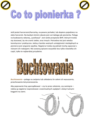 F -X C h a n ge F -X C h a n ge N y bu Je li jeste harcerzem/harcerk , na pewno jecha , lub dopiero pojedziesz na obóz harcerski. Na ka dym letnim obozie jest co takiego jak pionierka. Polega na budowaniu w asnej „cywilizacji”. Jest wiele przepisów BHP, których trzeba si stosowa , by nie zrani siebie, oraz innych. Potrzebna te jest wiedza teoretyczna i praktyczna. Jedn z bardzo wa nych umiej tno ci niezb dnych w pionierce jest wi zanie w ów. Najpierw trzeba si jednak troch zapozna z ró nymi ich rodzajami. Nie zostan opisane wszystkie lecz tylko niewielka ich cz , tylko te najbardziej przydatne. Buchtowanie – polega na zwijaniu lub uk adaniu lin celem ich wysuszenia, przechowania lub przenoszenia. Aby poprawnie lin uporz dkowa – czy to przez u enie, czy zwini cie – nale y j najpierw rozprostowa z ewentualnych zapl ta i u lu nymi kr gami na ziemi. ac .c tr om k lic C om k lic C .c re . . k e r- s o ft w a w w ac ww ww tr to to bu y N O W ! PD O W ! PD k e r- s o ft w a re F -X C h a n ge F -X C h a n ge N y bu Rodzaje 1. 2. 3. 4. 5. 6. ów, które zostan opisane Zwyk y P aski Ósemkowy Pó sztyk Wyblinka Ratowniczy pojedy czy ac .c tr om k lic C om k lic C .c re . . k e r- s o ft w a w w ac ww ww tr to to bu y N O W ! PD O W ! PD k e r- s o ft w a re F -X C h a n ge F -X C h a n ge N y bu 1. W ze zwyk y : Najprostszy rodzaj w a. Stosowany g ównie we wspinaczce i eglarstwie. y do zabezpieczenia innego w a przed rozwi zaniem. Klasycznym jego zastosowaniem jest asekuracja cz owieka, a tak e z czenie dwóch lin. Nie blokuje si nawet pod znacznym obci eniem. W ze ten jest potrzebny cho by do zdobycia sprawno ci m odego p ywaka (**) - nale y go umie zawi za na sobie pod wod . ac .c tr om k lic C om k lic C .c re . . k e r- s o ft w a w w ac ww ww tr to to bu y N O W ! PD O W ! PD k e r- s o ft w a re F -X C h a n ge F -X C h a n ge N y bu 2. W ze p aski : y do czenia dwóch lin - tak e o ró nych grubo ciach. Dobrze dzia a na grubych i sztywnych linach. Stosowany w eglarstwie; w makramie znany jest jako ze Józefiny. Jak wiemy, dla harcerzy bliski jest ten w ze . Symbolizuje on braterstwo. Jest on niezwykle silny, przez co mo emy go stosowa w wielu sytuacjach, szczególnie jak "musimy zwi za koniec z ko cem". W ze zaciska si pod obci eniem, ale jest atwy do rozwi zania - spróbujcie sami. Z reszt supe ten adnie wygl da (jest symetryczny). ac .c tr om k lic C om k lic C .c re . . k e r- s o ft w a w w ac ww ww tr to to bu y N O W ! PD O W ! PD k e r- s o ft w a re F -X C h a n ge F -X C h a n ge N y bu 3. W ze ósemkowy : y jako zabezpieczenie przed wysuni ciem si liny z bloku lub kipy. Cz sto stosowany na ko cach szotów, robiony na fale miecza lub fale p etwy sterowej, przy jednoczesnym stosowaniu "piesków". Stosuj c dwie p tle z ósemki przechodz ce jedna przez drug mo na po czy dwie liny o kompletnie ró nej grubo ci i zbudowane z ró nych materia ów, które nie dadz si porz dnie zwi za adnym innym sposobem ! ac .c tr om k lic C om k lic C .c re . . k e r- s o ft w a w w ac ww ww tr to to bu y N O W ! PD O W ! PD k e r- s o ft w a re F -X C h a n ge F -X C h a n ge N y bu 4. W ze pó sztyk : y najcz ciej do zabezpieczania innych w ów u ywanych do cumowania. Nie nale y jednak cumowa przy u yciu pó sztyku. W pionierce mo e s do przymocowania namiotu, gdy nie ma si ledzi. ac .c tr om k lic C om k lic C .c re . . k e r- s o ft w a w w ac ww ww tr to to bu y N O W ! PD O W ! PD k e r- s o ft w a re F -X C h a n ge F -X C h a n ge N y bu 5. W ze ratowniczy pojedy czy : Jeden z w ów stosowanych we wspinaczce, eglarstwie oraz ratownictwie. ze u ywany jest bardzo cz sto. Za jego pomoc robi si na ko cu liny oko do cumowania, mo e by tak e u yty do po czenia dwóch lin. Jednak typowe zastosowanie to zabezpieczenie cz owieka w trudnych warunkach pracy na pok adzie, za burt lub na wysoko ci. P tla tego w a nie zaciska si , nawet przy du ym obci eniu. Szczególnie przydatny w sytuacjach, gdy wokó danego przedmiotu (w asnego cia a, drzewa, bloku skalnego lub punktów zaczepienia uprz y wspinaczkowej) nale y zawi za niezaciskaj si p tl . ac .c tr om k lic C om k lic C .c re . . k e r- s o ft w a w w ac ww ww tr to to bu y N O W ! PD O W ! PD k e r- s o ft w a re F -X C h a n ge F -X C h a n ge N y bu 6. W ze wyblinka : ze wykorzystywany g ównie przy wspinaczce do szybkiego wpinania si w stanowisko, ze wzgl du na swoje w ciwo ci samozaciskuj ce si na elemencie. To pocz tek i koniec wielu w ów s cych np. do zwi zania dwóch erdzi. Idea jest prosta i wida j na zdj ciu. ac .c tr om k lic C om k lic C .c re . . k e r- s o ft w a w w ac ww ww tr to to bu y N O W ! PD O W ! PD k e r- s o ft w a re F -X C h a n ge F -X C h a n ge N y bu To ju wszystko ! Dzi kuj za uwag . ac .c tr om k lic C om k lic C .c re . . k e r- s o ft w a w w ac ww ww tr to to bu y N O W ! PD O W ! PD k e r- s o ft w a re