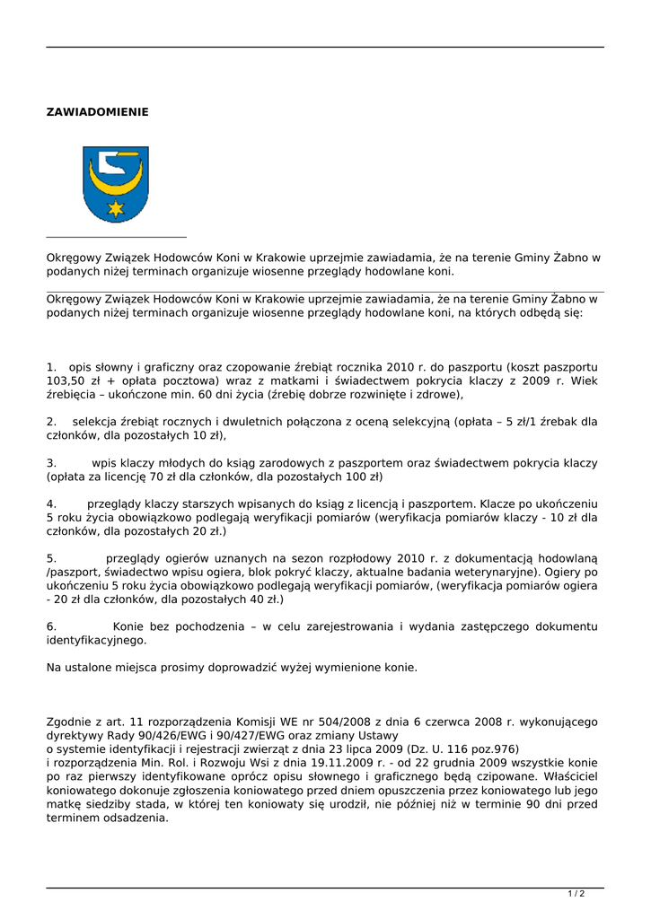ZAWIADOMIENIE Okręgowy Związek Hodowców Koni w Krakowie