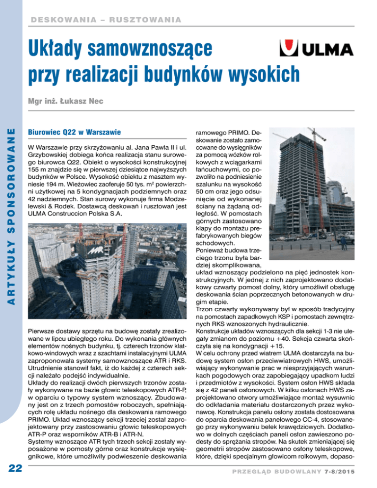 DE S KOWAN IA – RUSZT OWANIA Układy samowznoszące przy realizacji budynków wysokich A R T Y K U ŁY S P ON S O R OWANE Mgr inż. Łukasz Nec Biurowiec Q22 w Warszawie W Warszawie przy skrzyżowaniu al. Jana Pawła II i ul. Grzybowskiej dobiega końca realizacja stanu surowego biurowca Q22. Obiekt o wysokości konstrukcyjnej 155 m znajdzie się w pierwszej dziesiątce najwyższych budynków w Polsce. Wysokość obiektu z masztem wyniesie 194 m. Wieżowiec zaoferuje 50 tys. m2 powierzchni użytkowej na 5 kondygnacjach podziemnych oraz 42 nadziemnych. Stan surowy wykonuje firma Modzelewski & Rodek. Dostawcą deskowań i rusztowań jest ULMA Construccion Polska S.A. Pierwsze dostawy sprzętu na budowę zostały zrealizowane w lipcu ubiegłego roku. Do wykonania głównych elementów nośnych budynku, tj. czterech trzonów klatkowo-windowych wraz z szachtami instalacyjnymi ULMA zaproponowała systemy samowznoszące ATR i RKS. Utrudnienie stanowił fakt, iż do każdej z czterech sekcji należało podejść indywidualnie. Układy do realizacji dwóch pierwszych trzonów zostały wykonywane na bazie głowic teleskopowych ATR-P, w oparciu o typowy system wznoszący. Zbudowany jest on z trzech pomostów roboczych, spełniających rolę układu nośnego dla deskowania ramowego PRIMO. Układ wznoszący sekcji trzeciej został zaprojektowany przy zastosowaniu głowic teleskopowych ATR-P oraz wsporników ATR-B i ATR-N. Systemy wznoszące ATR tych trzech sekcji zostały wyposażone w pomosty górne oraz konstrukcje wysięgnikowe, które umożliwiły podwieszenie deskowania 22 ramowego PRIMO. Deskowanie zostało zamocowane do wysięgników za pomocą wózków rolkowych z wciągarkami łańcuchowymi, co pozwoliło na podniesienie szalunku na wysokość 50 cm oraz jego odsunięcie od wykonanej ściany na żądaną odległość. W pomostach górnych zastosowano klapy do montażu prefabrykowanych biegów schodowych. Ponieważ budowa trzeciego trzonu była bardziej skomplikowana, układ wznoszący podzielono na pięć jednostek konstrukcyjnych. W jednej z nich zaprojektowano dodatkowy czwarty pomost dolny, który umożliwił obsługę deskowania ścian poprzecznych betonowanych w drugim etapie. Trzon czwarty wykonywany był w sposób tradycyjny na pomostach zapadkowych KSP i pomostach zewnętrznych RKS wznoszonych hydraulicznie. Konstrukcje układów wznoszących dla sekcji 1-3 nie ulegały zmianom do poziomu +40. Sekcja czwarta skończyła się na kondygnacji +15. W celu ochrony przed wiatrem ULMA dostarczyła na budowę system osłon przeciwwiatrowych HWS, umożliwiający wykonywanie prac w niesprzyjających warunkach pogodowych oraz zapobiegający upadkom ludzi i przedmiotów z wysokości. System osłon HWS składa się z 42 paneli osłonowych. W kilku osłonach HWS zaprojektowano otwory umożliwiające montaż wysuwnic do odkładania materiału dostarczonych przez wykonawcę. Konstrukcja panelu osłony została dostosowana do oparcia deskowania panelowego CC-4, stosowanego przy wykonywaniu belek krawędziowych. Dodatkowo w dolnych częściach paneli osłon zawieszono podesty do sprężania stropów. Na skutek zmieniającej się geometrii stropów zastosowano osłony teleskopowe, które, dzięki specjalnym głowicom rolkowym, dopasoPRzeg l Ąd bu d owl any 7-8/2015 DE SKOWANIA – RUS ZTOWAN I A Apartamentowce CentralPark w Gdańsku Zostały zakończone prace przy realizacji konstrukcji żelbetowej budynków osiedla CentralPark w Gdańsku Morenie. W ramach drugiego etapu inwestycji wykonywane są dwa 17-kondygnacyjne budynki o wysokości 55 m, połączone 2-poziomową podziemną halą garażową. Inwestorem jest Grupa Inwestycyjna HOSSA S.A. a generalnym wykonawcą stanu surowego firma BAUHAUS Sp. z o.o. Do wykonania ścian zewnętrznych budynków ULMA zaproponowała system samowznoszący RKS Light z kompatybilnym deskowaniem ramowym PRIMO o wysokości 3,30 m i łącznej powierzchni około 800 m2. Na każdy obiekt budowanego osiedla dostarczono PR zeglĄ d bu d ow l an y 7-8/2015 po 16 segmentów samowznoszących, powieszonych na jego obwodzie. Każdy wspornik RKS Light wyposażony w dwa pomosty robocze: pomost główny oraz dolny do odzyskiwania głowic zostały zaprojektowane na bazie systemu MK, a główny element wspornika, tzw. maszt, zbudowany został z profili MK-180. Wykorzystanie w trakcie realizacji stopy RKS umożliwiło zmniejszenie liczby pomostów roboczych, a tym samym pozwoliło na redukcję ilości sprzętu. Dostarczony na budowę system RKS pozwolił skrócić czas realizacji jednej kondygnacji do 9 dni, a proces podnoszenia wszystkich segmentów wznoszących na jednym budynku trwał 6 godzin. A R T Y K U ŁY S P ON S O R OWANE wują się do geometrii obiektu. Wykorzystano również osłony przeciwwiatrowe skośne, dostosowane do pochylenia powierzchni zewnętrznej budynku oraz osłonę przeciwwiatrową komunikacyjną zapewniającą dostęp do najwyższych, aktualnie realizowanych kondygnacji. Komunikacja odbywa się po schodni BRIO zaprojektowanej w module 1,4 x 3,0 m. Podczas realizacji wieżowca ULMA dostarczyła także kilka rozwiązań do wykonywania nietypowych elementów obiektu. Do realizacji pochyłej ściany budynku między kondygnacjami 2 i 8 użyto specjalnie zaprojektowanych konsol BMK z deskowaniem ramowym PRIMO. Konsole wyposażone były w 3 poziomy podestów roboczych z komunikacją pionową oraz pełnym obarierowaniem. Belki kompozytowe oparte na słupach również zostały zrealizowane za pomocą szalunku PRIMO, ustawionego na rusztowaniu modułowym BRIO. W celu wykonania zbiornika przeciwpożarowego usytuowanego powyżej 15 kondygnacji nad czwartym trzonem klatkowo-windowym ULMA opracowała nietypową konstrukcję nośną. Rozwiązanie, którego zadaniem było podparcie konstrukcji żelbetowej zbiornika, bazowało na ośmiu kratownicach MK o wysokości 2,5 m i długości 8,2 m. Konstrukcja zakotwiona została do ścian przy użyciu specjalnych blach węzłowych M