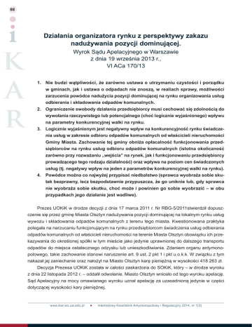 88 Działania organizatora rynku z perspektywy zakazu nadużywania pozycji dominującej. Wyrok Sądu Apelacyjnego w Warszawie z dnia 19 września 2013 r., VI ACa 170/13 1. Nie budzi wątpliwości, że zarówno ustawa o utrzymaniu czystości i porządku w gminach, jak i ustawa o odpadach nie znoszą, w realiach sprawy, możliwości zarzucenia powódce nadużycia pozycji dominującej na rynku organizowania usług odbierania i składowania odpadów komunalnych. 2. Ograniczenie swobody działania przedsiębiorcy musi cechować się zdolnością do wywołania rzeczywistego lub potencjalnego (choć logicznie wyjaśnionego) wpływu na parametry konkurencyjnej walki na rynku. 3. Logicznie wyjaśnionym jest negatywny wpływ na konkurencyjność rynku świadczenia usług w zakresie odbioru odpadów komunalnych od właścicieli nieruchomości Gminy Miasta. Zachowanie tej gminy obniża opłacalność funkcjonowania przedsiębiorców na rynku usług odbioru odpadów komunalnych (istotna okoliczność zarówno przy rozważaniu „wejścia” na rynek, jak i funkcjonowaniu przedsiębiorcy prowadzącego tego rodzaju działalność) oraz wpływa na poziom cen świadczonych usług (tj. negatywy wpływ na jeden z parametrów konkurencyjnej walki na rynku). 4. Powódce można co najwyżej przypisać niedbalstwo (sprawca wyobraża sobie skutek bezprawny, lecz bezpodstawnie przypuszcza, że go uniknie lub, gdy sprawca nie wyobraża sobie skutku, choć może i powinien go sobie wyobrazić – w obu przypadkach jego działanie jest wadliwe). Prezes UOKiK w drodze decyzji z dnia 17 marca 2011 r. Nr RBG-5/2011stwierdził dopusz- czenie się przez gminę Miasta Olsztyn nadużywania pozycji dominującej na lokalnym rynku usług wywozu i składowania odpadów komunalnych z terenu tego miasta. Kwestionowana praktyka polegała na narzucaniu funkcjonującym na rynku przedsiębiorcom świadczenia usług odbierania odpadów komunalnych od właścicieli nieruchomości na terenie Miasta Olsztyn obowiązku ich przekazywania do określonej spółki w tym mieście jako jedynie uprawnionej do dalszego transportu odpadów do miejsca ostatecznego odzysku lub unieszkodliwiania. Zdaniem organu antymonopolowego, takie zachowanie stanowi naruszenie art. 9 ust. 2 pkt 1 i pkt u.o.k.k. W związku z tym nakazał jej zaniechanie oraz nałożył na Miasto Olsztyn karę pieniężną w wysokości 418 263 zł. Decyzja Prezesa UOKiK została w całości zaskarżona do SOKiK, który – w drodze wyroku z dnia 22 listopada 2012 r. – oddalił odwołanie. Miasto Olsztyn wniosło od tego wyroku apelację. Sąd Apelacyjny na mocy omawianego wyroku uznał apelację za uzasadnioną jedynie w części dotyczącej wysokości kary pieniężnej. www.ikar.wz.uw.edu.pl internetowy Kwartalnik Antymonopolowy i Regulacyjny 2014, nr 1(3) 89 Konrad Kohutek Działania organizatora rynku z perspektywy zakazu nadużywania pozycji dominującej Leżący u podstaw omawianego wyroku problem materialno-prawny w istocie odnosi się do relacji zachodzących pomiędzy regułami antymonopolu (w tym zakazu nadużywania pozycji dominującej z art. 9 u.o.k.k.) oraz rygorami (obowiązkami), jakie na przedsiębiorców (w tym gminy) nakładają przepisy innych ustaw – ustaw „odrębnych” o jakich mowa w art. 3 u.o.k.k. Ten drugi przepis wyłącza zastosowanie wspomnianych reguł do ograniczeń konkurencji dopuszczonych na mocy wspomnianych ustaw. Sąd Apelacyjny nie odniósł się wszakże do tego przepisu, co nie podważa faktu, iż istota rozstrzygnięcia sprawy sprowadzała się (m.in.) do ustalenia czy przepisy odrębnych ustaw – w danym wypadku ustawy o utrzymaniu czystości i porządku w gminach oraz ustawy o odpadach –niejako legitymują zachowanie dominanta (na lokalnym rynku organizacji usług odbioru i składowania odpadów komunalnych) – pozbawiając go cech nadużycia pozycji dominującej. Sąd Apelacyjny odwołał się do reguły ukształtowanej w orzecznictwie Sądu Najwyższego, zgodnie z którą ustawa antymonopolowa „znajduje zastosowanie tylko do takich działań organizatora rynku, w zakresie których dysponuje on marginesem swobody”. Sąd Apelacyjny przytoczył wyrok SN z 15 lipca 2009 r. III SK 34/08, a także – odnoszący się do merytorycznie bardzo podobnej sprawy – tj. do tej jaką oceniał SN w wyroku z dnia 3 marca 2010 r. III 37/09 (Miasto Katowice). Warto dodać, iż cytowana wyżej „reguła kolizyjna” zastosowana była przez SN już w jednym z wcześniejszych wyroków, tj. z dnia 19 października 2006 r., III SK 15/06 (wdzwaniany Internet), w którym sąd ów – już literalnie – odniósł się do art. 3 u.o.k.k. w przedmiocie ustalania wzajemnego stosunku między przepisami prawa telekomunikacyjnego a ustawy antymonopolowej. W wyniku zastosowania cytowanej wyżej reguły (poprzedzonej zbadaniem – wynikającej z (także unijnego) prawa ochrony środowiska – zasady bliskości), Sąd Apelacyjny doszedł w omawianym wyroku do wniosku, iż praktyki Miasta Olsztyn nie podlegały „legalizacji” na mocy relewantnych ustaw, a zatem „nie pozbawiły je cech nadużycia pozycji dominującej”. W takim wypadku należało zbadać zasadność naruszenia art. 9 ust. 2 pkt 5 u.o.k.k. przez Prezesa UOKiK. Także w tej materii Sąd Apelacyjny nie dopatrzył się takiego naruszenia, przyjmując, iż organ antymonopolowy właściwie zakwalifikował zachowania Miasta Olsztyn jako przeciwdziałanie warunkom niezbędnym do powstania lub rozwoju konkurencji. Sąd ów nie miał wątpliwości, iż skutkiem tego zachowania było „pozbawienie przedsiębiorców świadczących lub zamierzających świadczyć usługi odbioru odpadów komunalnych od właścicieli nieruchomości z terenu Gminy Miasta Olsztyn możliwości wyboru miejsca składowania i/lub odzysku odpadów” i tym samym „wymuszenie” przekazywania ich tylko na składowisko prowadzone przez określonego przedsiębiorcę (również działającego na rynku odbioru odpadów), um