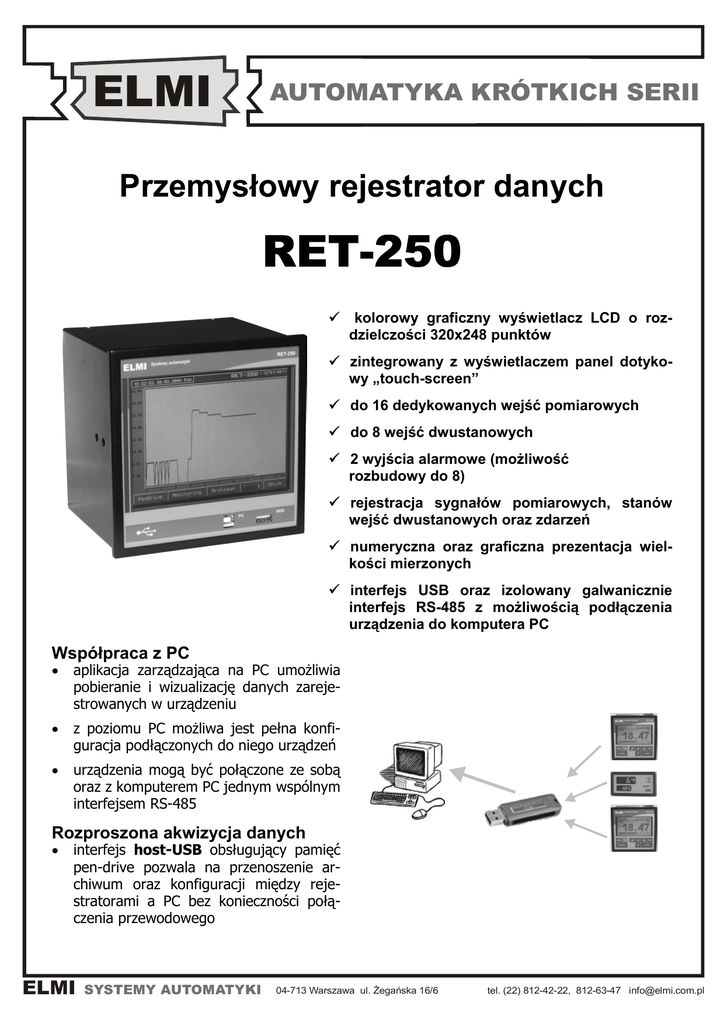 ELMI AUTOMATYKA KRÓTKICH SERII Przemysłowy rejestrator danych RET-250 kolorowy graficzny wyświetlacz LCD o rozdzielczości 320x248 punktów zintegrowany z wyświetlaczem panel dotykowy „touch-screen” do 16 dedykowanych wejść pomiarowych do 8 wejść dwustanowych 2 wyjścia alarmowe (możliwość rozbudowy do 8) rejestracja sygnałów pomiarowych, stanów wejść dwustanowych oraz zdarzeń numeryczna oraz graficzna prezentacja wielkości mierzonych interfejs USB oraz izolowany galwanicznie interfejs RS-485 z możliwością podłączenia urządzenia do komputera PC Współpraca z PC • aplikacja zarządzająca na PC umożliwia pobieranie i wizualizację danych zarejestrowanych w urządzeniu • z poziomu PC możliwa jest pełna konfiguracja podłączonych do niego urządzeń • urządzenia mogą być połączone ze sobą oraz z komputerem PC jednym wspólnym interfejsem RS-485 Rozproszona akwizycja danych • interfejs host-USB obsługujący pamięć pen-drive pozwala na przenoszenie archiwum oraz konfiguracji między rejestratorami a PC bez konieczności połączenia przewodowego ELMI SYSTEMY AUTOMATYKI 04-713 Warszawa ul. Żegańska 16/6 tel. (22) 812-42-22, 812-63-47 [email protected] 04-713 Warszawa ul. Żegańska 16/6 tel. (22) 812-42-22 tel./fax (22) 812-63-47 Pomiar • • • Podstawowe dane techniczne • wejścia analogowe urządzenie wyposażone jest w od 4 do 16 dedykowanych wejść pomiarowych, mierzących (w zależności od wykonania) sygnały elektryczne: prądowe, napięciowe, termoparowe, rezystancyjne (czujniki PT) definiowane przez użytkownika parametry konwersji jednostek, kalibracji oraz nazwy toru i jednostki pomiarowej umożliwiają odczyt pomiaru bezpośrednio w jednostkach docelowych (kPa, °C itp.), a także dokładne kalibrowanie toru pomiarowego (wejścia pomiarowego wraz z czujnikiem) aktualne wartości mierzone mogą być wyświetlane w kilku trybach: lista torów, tabelarycznie, wykres czasowy - • • • • • ilość: 2, 4 lub 8 (izolacja galwaniczna - opcjonalnie), wyjścia - • dane archiwalne przechowywane są w nieulotnej pamięci Flash o pojemności do 8 MB, pozwalającej na zapis ok. 600 tys. rekordów wykorzystanie wejść dwustanowych umożliwia rejestrację w trybie wyzwalanym obok sygnałów analogowych rejestrowane mogą być także sygnały z wejść dwustanowych, a także zdarzenia (przekroczenie zakresu pomiarowego/progów alarmowych, odłączenie zasilania) zarejestrowane dane mogą być przeglądane w trybie graficznym (wykres czasowy) oraz tabelarycznym 0(4)-20mA, 0-10V, termopara typu J, K, S, T, czujnik PT ilość: 4, 8, 16 (izolacja galwaniczna - opcjonalnie) przetwarzanie 16-bitowe dokładność pomiaru 0,1 % zakresu wyprowadzone zasilanie +24V/200mA dla czujników pasywnych wejścia dwustanowe - Rejestracja • www.elmi.pl 2 (możliwość rozbudowy do 8) wyjścia przekaźnikowe przełączne 5A/250 V AC płyta czołowa - • kolorowy wyświetlacz graficzny 320X248 punktów zasilanie - 85...250 V AC lub 24 V DC Funkcje dodatkowe • 2 wyjścia alarmowe pozwalają na zastosowanie rejestratora w prostym układzie regulacji Obudowa Widok z góry Widok z boku 163 139 114 7 134 139 144 144