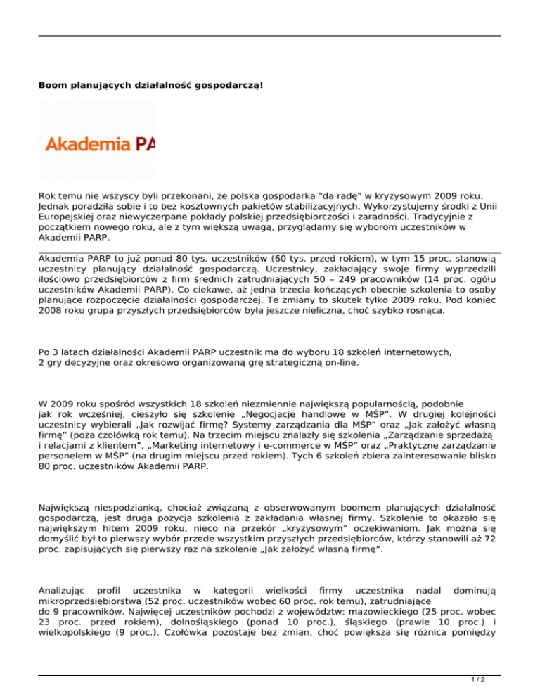 Boom planujących działalność gospodarczą! Rok temu nie wszyscy byli przekonani, że polska gospodarka "da radę" w kryzysowym 2009 roku. Jednak poradziła sobie i to bez kosztownych pakietów stabilizacyjnych. Wykorzystujemy środki z Unii Europejskiej oraz niewyczerpane pokłady polskiej przedsiębiorczości i zaradności. Tradycyjnie z początkiem nowego roku, ale z tym większą uwagą, przyglądamy się wyborom uczestników w Akademii PARP. Akademia PARP to już ponad 80 tys. uczestników (60 tys. przed rokiem), w tym 15 proc. stanowią uczestnicy planujący działalność gospodarczą. Uczestnicy, zakładający swoje firmy wyprzedzili ilościowo przedsiębiorców z firm średnich zatrudniających 50 – 249 pracowników (14 proc. ogółu uczestników Akademii PARP). Co ciekawe, aż jedna trzecia kończących obecnie szkolenia to osoby planujące rozpoczęcie działalności gospodarczej. Te zmiany to skutek tylko 2009 roku. Pod koniec 2008 roku grupa przyszłych przedsiębiorców była jeszcze nieliczna, choć szybko rosnąca. Po 3 latach działalności Akademii PARP uczestnik ma do wyboru 18 szkoleń internetowych, 2 gry decyzyjne oraz okresowo organizowaną grę strategiczną on-line. W 2009 roku spośród wszystkich 18 szkoleń niezmiennie największą popularnością, podobnie jak rok wcześniej, cieszyło się szkolenie „Negocjacje handlowe w MŚP”. W drugiej kolejności uczestnicy wybierali „Jak rozwijać firmę? Systemy zarządzania dla MŚP” oraz „Jak założyć własną firmę” (poza czołówką rok temu). Na trzecim miejscu znalazły się szkolenia „Zarządzanie sprzedażą i relacjami z klientem”, „Marketing internetowy i e-commerce w MŚP” oraz „Praktyczne zarządzanie personelem w MŚP” (na drugim miejscu przed rokiem). Tych 6 szkoleń zbiera zainteresowanie blisko 80 proc. uczestników Akademii PARP. Największą niespodzianką, chociaż związaną z obserwowanym boomem planujących działalność gospodarczą, jest druga pozycja szkolenia z zakładania własnej firmy. Szkolenie to okazało się największym hitem 2009 roku, nieco na przekór „kryzysowym” oczekiwaniom. Jak można się domyślić był to pierwszy wybór przede wszystkim przyszłych przedsiębiorców, którzy stanowili aż 72 proc. zapisujących się pierwszy raz na szkolenie „Jak założyć własną firmę”. Analizując profil uczestnika w kategorii wielkości firmy uczestnika nadal dominują mikroprzedsiębiorstwa (52 proc. uczestników wobec 60 proc. rok temu), zatrudniające do 9 pracowników. Najwięcej uczestników pochodzi z województw: mazowieckiego (25 proc. wobec 23 proc. przed rokiem), dolnośląskiego (ponad 10 proc.), śląskiego (prawie 10 proc.) i wielkopolskiego (9 proc.). Czołówka pozostaje bez zmian, choć powiększa się różnica pomiędzy 1/2 Mazowszem a pozostałymi województwami. Podobnie jak na koniec 2008 roku najmniej uczestników pochodzi z województwa świętokrzyskiego (niecałe 2 proc.). Udział kobiet w ogóle uczestników Akademii PARP nadal się powiększa i wynosi już 54 proc (53 proc. przed rokiem) wśród noworejestrujących się oraz aż 58 proc. wśród kończących szkolenia. Uczestnicy zamieszkali na wsi stanowią zdecydowaną mniejszość: 13 proc. wśród rozpoczynających szkolenia, 17 proc. wśród kończących. Uczestnik Akademii PARP nadal młodnieje. Na koniec 2009 roku średnia wieku uczestnika to 31 lat (mediana: 29 lat), wobec 32 lat przed rokiem i 34 lat na koniec 2007 roku. Wykształcenie wyższe zadeklarowało 67 proc. (nieznaczny spadek z ponad 70 proc. przed rokiem). Wynika z tego, że przeciętny uczestnik (uczestniczka) Akademii PARP to młoda, wykształcona osoba, właściciel firmy lub jego pracownik, prowadzący (lub planujący) swoją działalność gospodarczą w mieście. Serdecznie zapraszamy do korzystania z bezpłatnych, biznesowych szkoleń internetowych i licznych możliwości Akademii PARP w 2009 roku. W portalu znaleźć można najwyższej jakości nowoczesne rozwiązania szkoleniowe, opracowane specjalnie dla polskich małych i średnich firm. Do dyspozycji naszych uczestników pozostają opiekunowie, przez 6 dni w tygodniu. Więcej informacji: www.akademiaparp.gov.pl [email protected] Infolinia 0-801 444 MSP (czyli 0-801 444 677) 2/2 Powered by TCPDF (www.tcpdf.org)