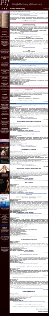Biuletyn Informacyjny BIEŻĄCY NUMER 01 . 09 .2 0 12 Drodzy Czytelnicy Przeglądu Socjologii Jakościowej, z przyjemnością informujemy, że nowy numer tematyczny „Qualitative Sociology Review”, pod redakcją Bernta Schnettlera i Bernda Rebsteina, International Perspectives on the Future of Qualitative Research in Europe jest już dostępny na naszej stronie internetowej! http://www.qualitativesociologyreview.org/ENG/volume22.php Jednocześnie zapraszamy do zapoznania się z niniejszym biuletynem informacyjnym PSJ, w którym znajdziecie Państwo informacje odnoszące się do aktualnych wydarzeń z zakresu nauk jakościowych w kraju i na świecie. Życzymy Państwu przyjemnej lektury! CALLS FOR PAPERS Graduate Journal of Social Science Special Issue: Visual Methodologies OD REDAKCJI W stronę socjologii ciała Anna Kacperczyk Dominika Byczkowska The forthcoming March 2013 edition of the Graduate Journal of Social Science explores the new pathways being carved out by postgraduate researchers and early career academics for the deployment of visual methodologies in the social sciences. The issue draws particular attention to the theoretical contributions made to the social sciences through the use of visual methods. This is a great opportunity for young and emerging scholars to get published, so please do take this opportunity to submit your draft papers to review! Deadline for Papers: October 31, 2012 For further information, please visit: http://www.gjss.org/index.php?/Visual-Methodologies.html ARTYKUŁY Ciało jako przedmiot badań socjologicznych – dylematy, pominięcia, możliwości Honorata Jakubowska Badacz i jego ciało w procesie zbierania i analizowania danych – na przykładzie badań nad społecznym światem wspinaczki Anna Kacperczyk source: Internet Journal of Comparative Research in Anthropology and Sociology Special Issue: Ways of understanding, misunderstanding and not understanding people Social research relies on our claims of understanding people – which often rely, further, on the claims advanced by our research participants (as respondents, informants, subjects, or in other roles) of understanding themselves and other people. Papers that reflect on forms of understanding, misunderstanding and not understanding people are invited. Articles that engage in a comparative approach, connecting different concepts, materials, methods, situations, pieces of research or other social realities are particularly welcome. Deadline for Papers: September 15, 2012 For further information, please visit: http://compaso.eu/category/call-for-papers/ source: Internet "Ciało świątynią duszy", czyli o procesie budowania tożsamości praktykującego hatha-jogę. Konstruowanie prywatnej quasi-religii Krzysztof T. Konecki "Ciało to mój największy nauczyciel". Interakcje z własnym ciałem w pracy tancerza Dominika Byczkowska Maska Bunt ‒ Manifestacja ‒ Rewolucja Tematyka XV numeru “Maski” kierowana jest między innymi do kulturoznawców, historyków sztuki, psychologów, socjologów, politologów, a także wszystkich innych przedstawicieli nauk społecznych. Wszystkie bowiem dziedziny zajmujące się historią i myślą ludzkości znają pojęcie buntu, rozumiane jako sprzeciw jednostki wobec grupy. Bunt może zostać wyrażony jako manifest, może prowadzić do rewolucji, krótkotrwałej zmiany o ogromnym zasięgu. Zarzewie buntu tkwić może w każdym i wyrażać się poprzez różnorodne manifesty. Na tej właśnie różnorodności interpretacji pojęć buntu, manifestu i rewolucji zbudowany zostanie XV numer „Maski”. Termin nadsyłania artykułów: 5 września 2012 Więcej informacji na stronie internetowej: http://www.maska.org.pl/nabor-tekstow-do-xv-numeru-maski/ Ciało – podstawowe narzędzie pracy. Rola ciała w procesie negocjowania tożsamości pracownic agencji towarzyskich źródło: Internet CALL FOR CHAPTERS Reflexivity in Criminological Research: Experiences with the Powerless and the Powerful Magdalena Wojciechowska The aim of Reflexivity in Criminological Research is to contribute to, advance and consolidate discussions of the ranges of methods and approaches in criminology through the presentation of international case studies Doświadczanie własnej in which the authors reflect upon their experiences with both powerless and/or powerful individuals/groups. cielesności przez biorców Reflexivity, and the need to be reflexive, permeates every aspect of all criminological research projects, kończyny – socjologiczne studium hence, submissions are welcome in areas of criminological study which address any of the following: zrekonstruowanego ciała - Accessing the field, building relationships with gatekeepers and/or research negotiations; - The influence of the researcher’s biography on the selection of research topic, relationships with the Katarzyna Kowal researched and interactions in the field; - Emotional or physical risks encountered, particularly in research of a sensitive nature or on vulnerable Ja zapisane na skórze. groups; Tatuowanie ciała jako praca - Power, partisanship and bias; tożsamościowa w - Issues faced when exiting the field/ending relationships with respondents; indywidualizującym się - Dissemination of research findings; społeczeństwie polskim - The problems with reflexivity in criminological research; Agata Dziuban - The role of reflexivity in new or innovative research methods/approaches, such as digital/online methods, visual ethnography, team research, or mixed methods. Deadline for Abstracts: November 30, 2012 Body art – ciało, sztuka, Deadline for Chapters: August 1, 2013 technologia. Od ciała For further information, please visit: ułomnego do bezawaryjnego humanoida http://www.britsoc.co.uk/media/43031/Reflexivity_Criminological_Research_CfP_301112.pdf source: Internet Izabela Franckiewicz-Olczak XV OGÓLNOPOLSKI ZJAZD SOCJOLOGICZNY Ciała osobliwe w przestrzeni freak/talk show Maja BrzozowskaBrywczyńsk