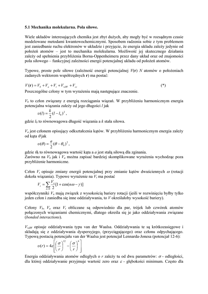5.1 Mechanika molekularna. Pola siłowe. Wiele układów interesujących chemika jest zbyt duŜych, aby mogły być w rozsądnym czasie modelowane metodami kwantowochemicznymi. Sposobem radzenia sobie z tym problemem jest zaniedbanie ruchu elektronów w układzie i przyjęcie, Ŝe energia układu zaleŜy jedynie od połoŜeń atomów – jest to mechanika molekularna. MoŜliwość jej skutecznego działania zaleŜy od spełnienia przybliŜenia Borna-Oppenheimera przez dany układ oraz od znajomości pola siłowego – funkcyjnej zaleŜności energii potencjalnej układu od połoŜeń atomów. Typowe, proste pole siłowe (zaleŜność energii potencjalnej V(r) N atomów o połoŜeniach zadanych wektorem współrzędnych r) ma postać: V (r ) = Vb + Va + Vt + VvdW + Vcc Poszczególne człony w tym wyraŜeniu mają następujące znaczenie. (*) Vb to człon związany z energią rozciągania wiązań. W przybliŜeniu harmonicznym energia potencjalna wiązania zaleŜy od jego długości l jak k υ (l ) = (l − l 0 ) 2 , 2 gdzie l0 to równowagowa długość wiązania a k stała siłowa. Va jest członem opisujący odkształcenia kątów. W przybliŜeniu harmonicznym energia zaleŜy od kąta θ jak a υ (θ ) = (θ − θ 0 ) 2 , 2 gdzie θ0 to równowagowa wartość kąta a a jest stałą siłową dla zginania. Zarówno na Vb jak i Va moŜna zapisać bardziej skomplikowane wyraŜenia wychodząc poza przybliŜenie harmoniczne. Człon Vt opisuje zmiany energii potencjalnej przy zmianie kątów dwuściennych ω (rotacji dokoła wiązania). Typowe wyraŜenie na Vt ma postać V Vt = ∑ n [1 + cos(nω − γ )] n =0 2 współczynniki Vn mają związek z wysokością bariery rotacji (jeśli w rozwinięciu byłby tylko jeden człon i zaniedba się inne oddziaływania, to V określałoby wysokość bariery). Człony Vb, Va oraz Vt obliczane są odpowiednio dla par, trójek lub czwórek atomów połączonych wiązaniami chemicznymi, dlatego określa się je jako oddziaływania związane (bonded interactions). VvdW opisuje oddziaływania typu van der Waalsa. Oddziaływania te są krótkozasięgowe i składają się z oddziaływania dyspersyjego, (przyciągającego) oraz członu odpychającego. Typową postacią potencjału van der Waalsa jest potencjał Lennarda-Jonesa (potencjał 12-6): σ 12 σ 6 υ (r ) = 4ε − r r Energia oddziaływania atomów odległych o r zaleŜy tu od dwu parametrów: σ - odległości, dla której oddziaływanie przyjmuje wartość zero oraz ε - głębokości minimum. Często dla opisania potencjału zamiast σ uŜywa się rmin = 21/6σ, czyli odległości, dla której energia oddziaływania osiąga minimum. 25 20 15 10 5 0 σ rmin ε -5 Wtedy potencjał Lennarda-Jonesa zapisać moŜna jako 6 rmin 12 rmin υ (r ) = ε − 2 r r Inne postaci funkcyjne oddziaływań van der Waalsa uŜywają innych wykładników w członach, albo eksponencjalnej zaleŜności dla członu odpychającego jak potencjał Buckinghama: υ (r ) = A exp(− Br ) + Cr −6 Parametry potencjału van der Waalsa zaleŜą od typu oddziałujących atomów. Oznaczałoby to, Ŝe dla układu z N róŜnymi typami atomów naleŜałoby wyznaczyć N(N – 1)/2 zestawów parametrów, co byłoby bardzo trudne i pracochłonne. Z tego powodu częściej wprowadza się parametry oddziaływania dla pojedynczych atomów a parametry dla par oblicza jako ich średnie. Człon Vcc w potencjale podanym na początku rozdziału opisuje oddziaływania elektrostatyczne trwałych ładunków zlokalizowanych na atomach. Dla ładunków na atomach i i j równych odpowiednio qi i qj mamy qi q j υ (rij ) = . 4πε 0 rij Inne sposoby opisu oddziaływania elektrostatycznego atomów uŜywają oprócz ładunków dalszych członów rozwinięcia multipolowego (dipoli, kwadrupoli, ...). Człony VvdW i Vcc opisują oddziaływania niezwiązane (non-bonded interactions), jako Ŝe mogą przyjmować niezerową wartość dla kaŜdej pary atomów, takŜe niezwiązanych poprzez wiązania chemiczne. Przyjmując typowe postacie poszczególnych członów oddziaływania wzór (*) moŜemy zapisać jako k a V V (r ) = ∑ i (li − l 0i ) 2 + ∑ i (θ i − θ 0i ) 2 + ∑ ∑ ni (1 + cos(nω i − γ i )) + 2 bonds 2 angles 2 torsions n σ ij + ∑ ∑ 4ε ij rij i =1 j =i +1 N N 12 6 σ ij N N q i q j − + ∑ r ∑ ij i =1 j =i +14πε 0 rij W stosowanych polach siłowych pojawiają się jeszcze inne człony np. opisujące wychylenia pozapłaszczyznowe lub człony sprzęgające długości wiązań i kąty. MoŜliwe jest teŜ obliczanie przyczynków polaryzacyjnych do energii potencjalnej: dla zadanych polaryzowalności atomów wyznacza się indukowane momenty dipolowe a później oblicza odpowiedni przyczynek do oddziaływań elektrostatycznych. Jest to jednak kosztowne, jako Ŝe polaryzacja jest przykładem oddziaływań wielociałowych – do obliczenia momentu dipolowego indukowanego na danym atomie potrzebna jest znajomość wszystkich pozostałych momentów dipolowych. Ich obliczenie prowadzi się zatem iteracyjnie do samouzgodnienia albo rozwiązując odpowiedni układ równań. Często stosuje się teŜ specjalne parametryzacje dla cząsteczek wody (np. reprezentując je jako nie 3 a 4 lub 5 punktów z ładunkami). Wspomnijmy jeszcze, Ŝe ze względu na konieczność obliczania sił działających na atomy wyprowadza się i programuje wzory takŜe na pochodne poszczególnych przyczynków energii względem odległości. Układy dostępne do symulacji metodami opartymi na polach siłowych w dalszym ciągu składają się z niewielu cząsteczek. Mając np. układ 1000 cząsteczek rozpuszczalnika moŜemy badać nanokroplę cieczy w próŜni, ale taki agregat nie nadaje się do badania własności ośrodka ciągłego. Wykorzystujemy wtedy periodyczne warunki brzegowe powtarzając periodycznie nasz układ (najczęściej prostopadłościan lub ośmiościan) w trzech kierunkach w przestrzeni. Atomy, które znajdują się na powierzchni naszej wyjściowe