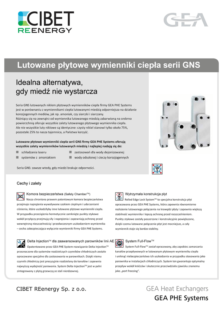 Lutowane płytowe wymienniki ciepła serii GNS Idealna alternatywa, gdy miedź nie wystarcza Seria GNS lutowanych niklem płytowych w y m i e n n i k ó w ciepła firmy GEA PHE Systems jest w p o r ó w n a n i u z w y m i e n n i k a m i ciepła l u t o w a n y m i miedzią odporniejsza na działanie korozjogennych mediów, jak np. amoniak, czy siarczki i siarczany. Różniący sią na zewnątrz od wymiennika lutowanego miedzią zabarwioną na srebrno powierzchnią oferuje wszystkie zalety lutowanego płytowego wymiennika ciepła. Ale nie wszystkie luty niklowe są identyczne: czysty nikiel stanowi tylko około 75%, pozostałe 25% to nasza tajemnica, a Państwa korzyść. Lutowane płytowe wymienniki ciepła serii GNS firmy GEA PHE Systems oferują wszystkie zalety wymienników lutowanych miedzią i najlepiej nadają się do: ■ schładzania laseru ■ zastosowań dla w o d y dejonizowanej ■ systemów z amoniakiem ■ w o d y odsolonej i cieczy korozjogennych Seria GNS: zawsze wtedy, gdy miedzi brakuje odporności. Cechy i zalety Komora b e z p i e c z e ń s t w a (Safety Chamber™) W y t r z y m a ł a konstrukcja płyt Nasza chroniona prawem patentowym komora bezpieczeństwa Rolled Edge Lock System™ to specjalna konstrukcja płyt przejmuje naprężenia wywoływane szokiem cieplnym i uderzeniami opracowana przez GEA PHE Systems, która zapewnia równomierne ciśnienia, które uszkodziłyby inne lutowane płytowe wymienniki ciepła. rozłożenie lutowanego połączenia na krawędzi płyty i zapewnia większą W przypadku przeciążenia hermetycznie zamknięte punkty stykowe stabilność wymiennika i lepszą ochronę przed rozszczelnieniem. wokół przyłączy przejmują siły i naprężenia i zapewniają ochronę przed Punkty stykowe zostały poszerzone i konstrukcyjnie powiększone, wewnętrzną nieszczelnością i przedwczesnym uszkodzeniem wymiennika dzięki czemu lutowane połączenie płyt jest mocniejsze, a cały - cecha zabezpieczająca wyłącznie wymienniki firmy GEA PHE Systems. wymiennik staje się bardzo stabilny. Delta Injection™ dla z a a w a n s o w a n y c h parowników linii A E Opatentowane przez GEA PHE System rozwiązanie Delta Injection™ S y s t e m Full-Flow™ System Full-Flow™ został opracowany, aby zapobiec zamarzaniu przeznaczone dla systemów rozdzielczych czynników chłodniczych zostało kanałów przepływowych w lutowanym płytowym wymienniku ciepła opracowane specjalne dla zastosowania w parownikach. Dzięki niemu i uniknąć niebezpieczeństwa ich uszkodzenia w przypadku stosowania jako czynnik chłodniczy jest precyzyjnie rozdzielany do kanałów i zapewnia parownika w instalacjach chłodniczych. System ten gwarantuje optymalny najwyższą wydajność parowania. System Delta Injection™ jest w pełni przepływ wokół króćców i skutecznie przeciwdziała zjawisku znanemu zintegrowany z płytą grzewczą ze stali nierdzewnej. jako „port freezing". CIBET REenergy Sp. z o.o. GEA Heat Exchangers GEA PHE Systems Dane techniczne wymienników serii GNS Materiał płyt: stal nierdzewna AISI 316/1.4401 Materiał lutu: stop niklowy Z a k r e s z a s t o s o w a n i a : do 16 bar i do + 195°C Certyfikaty: PED (CE), TÜV, ASME, UL, CSA, KHK, inne na zapytanie Cechy: Opcjonalnie: P o d w y ż s z o n a o d p o r n o ś ć na k o r o z j ę - s e r i a X C R Dzięki zastosowaniu jako materiału płyt stali szlachetnej wyższej jakości seria w y m i e n n i k ó w XCR firmy GEA PHE Systems oferuje większą odporność na korozję. Najlepiej nadają się do stosowania w surowych warunkach i w środowisku o dużej zawartości chloru, jak baseny kąpielowe i pompy ciepła w o d a - w o d a . Stal nierdzewna, Delta lutowane niklem Injection™ A B C D E F IM = Liczba płyt Ciężar N = Liczba płyt Pojemność -AE Typ 1Wymiary Standard!)we (mm Maksymalny Maksymalna przepływ wody liczba płyt (kg) (litrów/kanał) (m3/h) GNS 100 - 74 204 40 170 15 10,23+2,23xN 0,70+0,050xN 0,025 4 50 GNS 200 - 90 231 43 182 20 12,24+2,24xN 1,10+0,060xN 0,030 6 50 GNS 220 - 90 328 43 279 20 12,20+2,22xN 1,30+0,080xN 0,046 6 50 GNS 240 - 90 464 43 415 20 12,20+2,20xN 2,04+0,140xN 0,070 6 50 GNS 300 - 124 173 73 120 25 12,30+2,22xN 1,20+0,060xN 0,030 10 50 GNS 400 AE 124 335 73 281 25 11,80+2,24xN 1,60+0,130xN 0,065 10 100 GNS 500 AE 124 532 73 478 25 11,80+2,28xN 2,00+0,240xN 0,100 10 100 GNS700L - 271 532 200 460 40 13,30+2,34xN 9,60+0,540xN 0,230 27 150 GNS700M AE 271 532 200 460 40 13,30+2,30xN 9,60+0,540xN 0,230 27 150 GNS 800 AE 271 532 161 421 65 13,8+2,34xN 10,0+0,540xN 0,221 70 150 - Kompetencja w wymianie ciepła Firma GEA PHE Systems jest kontynuatorem firmy WilchwitzerThermo-Technik GmbH (WTT) powstałej w 1992 r. W roku 2004, po przejęciu przez koncern GEA, firma WTT GmbH zmieniła nazwę na GEA WTT GmbH i obecnie wchodzi w skład grupy GEA PHE Systems. Od 1996 roku dystrybutorem wymienników firmy WilchwitzerThermo-Technik GmbH było Przedsiębiorstwo Naukowo-Techniczne CIBETSp. z o.o. Od roku 2008 dystrybucję wymienników przejęta spótka-córka Przedsiębiorstwa Naukowo-Technicznego CIBET Sp. z o.o. - spółka CIBET REenergy Sp. z o.o. CIBET REenergy Sp. z o.o. al. Krakowska 197 ■ 02-180 Warszawa teł. +48 22 57 39 733 ■ fax + 49 22 57 39 757 [email protected] ■ www.cibetreenergy.pl Zmiany techniczne zastrzeżone GNS PL wersja 10/2010