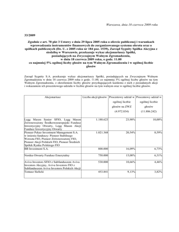 Warszawa, dnia 18 czerwca 2009 roku 33/2009 Zgodnie z art. 70 pkt 3 Ustawy z dnia 29 lipca 2005 roku o ofercie publicznej i warunkach wprowadzania instrumentów finansowych do zorganizowanego systemu obrotu oraz o spółkach publicznych (Dz. U. z 2005 roku nr 184 poz. 1539), Zarząd Sygnity Spółka Akcyjna z siedzibą w Warszawie, przekazuje wykaz akcjonariuszy Spółki, posiadających na Zwyczajnym Walnym Zgromadzeniu, w dniu 18 czerwca 2009 roku, o godz. 11.00 co najmniej 5% ogólnej liczby głosów na tym Walnym Zgromadzeniu i w ogólnej liczbie głosów Zarząd Sygnity S.A. przekazuje wykaz akcjonariuszy Spółki, posiadających na Zwyczajnym Walnym Zgromadzeniu w dniu 18 czerwca 2009 roku o godz. 11.00, co najmniej 5% ogólnej liczby głosów na tym Walnym Zgromadzeniu, z określeniem liczby głosów przysługujących kaŜdemu z nich z posiadanych akcji i wskazaniem ich procentowego udziału w liczbie głosów na tym walnym oraz w ogólnej liczbie głosów. Akcjonariusz Liczba akcji/głosów Procentowy udział w Procentowy udział w ogólnej liczbie ogólnej liczbie głosów na ZWZ głosów (4.972.834) (11.886.242) 1.188.623 23,90% 10,00% 1.021.368 20,54% 8,59% 800.000 16,09% 6,73% Nordea Otwarty Fundusz Emerytalny 750.000 15,08% 6,31% Aviva Investors SFIO z Subfunduszem Aviva Investors Akcyjny, Aviva Investors FIO z Subfunduszem Aviva Investors Polskich Akcji Tomasz Sielicki 530.000 10,66% 4,46% 453.841 9,13% 3,82% Legg Mason Senior SFIO, Legg Mason ZrównowaŜony Środkowoeuropejski Fundusz Inwestycyjny Otwarty, Legg Mason Akcji Fundusz Inwestycyjny Otwarty Pioneer Pekao Investment Management S.A. w imieniu funduszy: Pioneer Stabilnego Wzrostu FIO, Pioneer ZrównowaŜony FIO, Pioneer Akcji Polskich FIO, Pioneer Średnich Spółek Rynku Polskiego FIO BB Investment S.A.