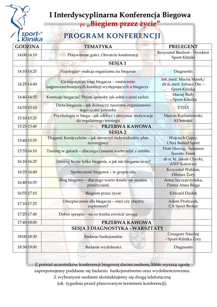 I Interdyscyplinarna Konferencja Biegowa pt. „Biegiem przez życie” PROGRAM KONFERENCJI GODZINA 14:00-14.10 TEMATYKA Przywitanie gości. Otwarcie konferencji. PRELEGENT Krzysztof Biedroń - Dyrektor Sport-Kliniki SESJA 1 14:10-14:25 Fizjologia – reakcja organizmu na bieganie 14:25-14:40 Co najczęściej trapi biegacza – omówienie najpowszechniejszych kontuzji występujących u biegaczy. 14:40-14:55 Kontuzje biegacza? Proste sposoby jak sobie z nimi radzić. 14:55-15:10 15:10-15:25 15:25-15:40 Diagnostix lek. med. Maciej Marek/ dr n. med. Juliusz Dec – Sport-Klinika Maciej Biały – Sport-Klinika Dieta biegacza – jak dostarczy naszemu organizmowi tego co mu potrzeba Psychologia w biegu - jak zdobyć i utrzymać motywację do regularnego treningu ETIXX Marcin Kochanowski, KOmental PRZERWA KAWOWA SESJA 2 15:40-15:55 Dogonić Kenijczyków – jak stworzyć indywidualny plan treningowy 15:55-16:10 Trening w górach – dlaczego czasami warto zejść z asfaltu 16:10-16:25 Trening to nie tylko bieganie, a jak nie bieganie to co? 16:25-16:40 Społeczność biegowa – w grupie siła 16:40-16:55 Blog biegowy – dlaczego warto dzielić się swoimi przeżyciami Wojciech Gajny, Ultra Beskid Sport Piotr Hercog , Salomon Suunto Team dr n. kf. Jakub Chycki, AWF Katowice Krzysztof Waldon, HRmax Żory Anna Szczypczyńska, Panna Anna Biega 16:55-17:10 Biegiem przez życie Edward Dudek 17:10-17:25 Ubezpieczenie dla biegacza – oręż czy zbędny suplement? Adam Prończuk, CA Sport Broker 17:25-17:40 17:40-18:00 Dobór sprzętu – na co trzeba zwrócić uwagę PRZERWA KAWOWA SESJA 3 DIAGNOSTYKA - WARSZTATY 18:00-18:30 Badanie funkcjonalne Grzegorz Niechaj - Sport-Klinika Żory 18:30-19:00 Badanie wydolności Diagnostix Z pośród uczestników konferencji biegowej dwóm osobom, które wyrażą zgodę zaproponujemy poddanie się badaniu funkcjonalnemu oraz wydolnościowemu. Z wybranymi osobami skontaktujemy się drogą telefoniczną (ok. tygodnia przed planowanym terminem konferencji).