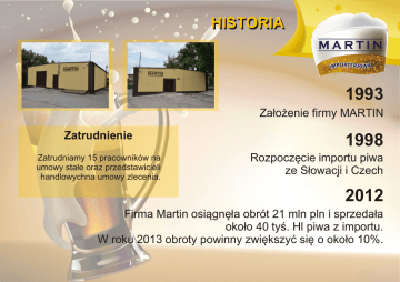 HISTORIA 1993 Za³o¿enie firmy MARTIN Zatrudnienie Zatrudniamy 15 pracowników na umowy sta³e oraz przedstawicieli handlowychna umowy zlecenia. 1998 Rozpoczêcie importu piwa ze S³owacji i Czech 2012 Firma Martin osi¹gnê³a obrót 21 mln pln i sprzeda³a oko³o 40 tyœ. Hl piwa z importu. W roku 2013 obroty powinny zwiêkszyæ siê o oko³o 10%. OSI¥GNIÊCIA 2009 2010 Certyfikat Wiarygodnoœci Biznesowej Certyfikat Wiarygodnoœci Biznesowej 2011 2011 Certyfikat Wiarygodnoœci Biznesowej Gazela Biznesu 2012 2012 Gazela Biznesu Certyfikat Wiarygodnoœci Biznesowej MAGAZYNY Transport i magazyn Posiadamy w³asne magazyny o powierzchni 3500m2 oraz w³asny transport. Korzystamy równie¿ z firm logistycznych (Raben), docieraj¹c w ka¿dy punkt w Polsce. MAGAZYNY DOSTAWCY Nasi dostawcy Naszymi dostawcami s¹ tylko najlepsi! Heineken Slovakia (Z³oty Ba¿ant) Brau Union (Heineken) Austria (Zipfer, Goser, Fischer Sol) Krusovice Molson Coors (Staropramen) Bernard PMS Prevor (Zubr, Litovel,Holba) Univer Wêgry Pikant Ostrava Olvi - Volfas Engelman - Litwa Butautu - Litwa ODBIORCY Nasi odbiorcy Naszymi odbiorcami s¹ du¿e sieci handlowe, stanowi¹ce oko³o 80% obrotu firmy. Makro C&C Selgros Auchan Real Carrefour Tesco Kaufland Piotr & Pawe³ Alma ¯abka Polomarket oraz inne, mniejsze HoReCa W segmencie HoReCa naszym g³ównym celem jest jakoœæ sprzedawanego piwa. Ten segment rynku ma wspomóc sprzeda¿ na rynku nowoczesnym i tradycyjnym. Ze wzglêdu na ustawê antyalkoholow¹ pe³ni rolê promocyjn¹. W HoReCa docieramy w ka¿dy punkt Polski, ale handlujemy tylko z tymi, dla których jakoœæ sprzedawanego piwa jest najwa¿niejsza. W Polsce po³udniowej ( Katowice, Kraków, Wroc³aw, Czêstochowa, Kielce ) docieramy poprzez w³asny transport i korzystamy z w³asnego serwisu. W Warszawie mamy firmê - córkê, która obs³uguje rynek HoReCa oraz tradycyjny. W pozosta³e czêœci kraju docieramy poprzez firmê logistyczn¹ Raben, a sprzêt serwisujemy poprzez firmy zewnêtrzne ( Szczecin, Koszalin, Poznañ, Gdañsk ). Serwisujemy urz¹dzenia do rozlewu piwa, minimum co 30 dni. Mamy równie¿ punkty, które serwisujemy czêœciej. Ka¿dego roku organizujemy w browarach, z których odbieramy piwo, szkolenia zarówno dla pracowników jak i najlepszych klientów.