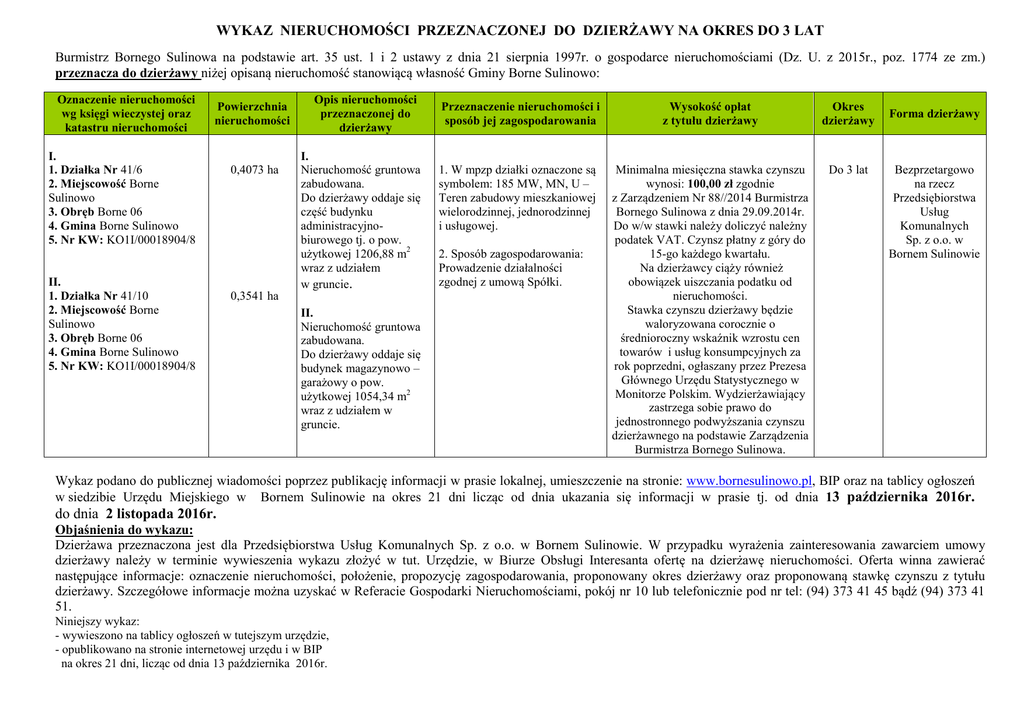 WYKAZ NIERUCHOMOŚCI PRZEZNACZONEJ DO DZIERŻAWY NA OKRES DO 3 LAT Burmistrz Bornego Sulinowa na podstawie art. 35 ust. 1 i 2 ustawy z dnia 21 sierpnia 1997r. o gospodarce nieruchomościami (Dz. U. z 2015r., poz. 1774 ze zm.) przeznacza do dzierżawy niżej opisaną nieruchomość stanowiącą własność Gminy Borne Sulinowo: Oznaczenie nieruchomości wg księgi wieczystej oraz katastru nieruchomości Powierzchnia nieruchomości I. 1. Działka Nr 41/6 2. Miejscowość Borne Sulinowo 3. Obręb Borne 06 4. Gmina Borne Sulinowo 5. Nr KW: KO1I/00018904/8 II. 1. Działka Nr 41/10 2. Miejscowość Borne Sulinowo 3. Obręb Borne 06 4. Gmina Borne Sulinowo 5. Nr KW: KO1I/00018904/8 0,4073 ha Opis nieruchomości przeznaczonej do dzierżawy I. Nieruchomość gruntowa zabudowana. Do dzierżawy oddaje się część budynku administracyjnobiurowego tj. o pow. użytkowej 1206,88 m2 wraz z udziałem w gruncie. 0,3541 ha II. Nieruchomość gruntowa zabudowana. Do dzierżawy oddaje się budynek magazynowo – garażowy o pow. użytkowej 1054,34 m2 wraz z udziałem w gruncie. Przeznaczenie nieruchomości i sposób jej zagospodarowania Wysokość opłat z tytułu dzierżawy Okres dzierżawy Forma dzierżawy 1. W mpzp działki oznaczone są symbolem: 185 MW, MN, U – Teren zabudowy mieszkaniowej wielorodzinnej, jednorodzinnej i usługowej. Minimalna miesięczna stawka czynszu wynosi: 100,00 zł zgodnie z Zarządzeniem Nr 88//2014 Burmistrza Bornego Sulinowa z dnia 29.09.2014r. Do w/w stawki należy doliczyć należny podatek VAT. Czynsz płatny z góry do 15-go każdego kwartału. Na dzierżawcy ciąży również obowiązek uiszczania podatku od nieruchomości. Stawka czynszu dzierżawy będzie waloryzowana corocznie o średnioroczny wskaźnik wzrostu cen towarów i usług konsumpcyjnych za rok poprzedni, ogłaszany przez Prezesa Głównego Urzędu Statystycznego w Monitorze Polskim. Wydzierżawiający zastrzega sobie prawo do jednostronnego podwyższania czynszu dzierżawnego na podstawie Zarządzenia Burmistrza Bornego Sulinowa. Do 3 lat Bezprzetargowo na rzecz Przedsiębiorstwa Usług Komunalnych Sp. z o.o. w Bornem Sulinowie 2. Sposób zagospodarowania: Prowadzenie działalności zgodnej z umową Spółki. Wykaz podano do publicznej wiadomości poprzez publikację informacji w prasie lokalnej, umieszczenie na stronie: www.bornesulinowo.pl, BIP oraz na tablicy ogłoszeń w siedzibie Urzędu Miejskiego w Bornem Sulinowie na okres 21 dni licząc od dnia ukazania się informacji w prasie tj. od dnia 13 października 2016r. do dnia 2 listopada 2016r. Objaśnienia do wykazu: Dzierżawa przeznaczona jest dla Przedsiębiorstwa Usług Komunalnych Sp. z o.o. w Bornem Sulinowie. W przypadku wyrażenia zainteresowania zawarciem umowy dzierżawy należy w terminie wywieszenia wykazu złożyć w tut. Urzędzie, w Biurze Obsługi Interesanta ofertę na dzierżawę nieruchomości. Oferta winna zawierać następujące informacje: oznaczenie nieruchomości, położenie, propozycję zagospodarowania, proponowany okres dzierżawy oraz proponowaną stawkę czynszu z tytułu dzierżawy. Szczegółowe informacje można uzyskać w Referacie Gospodarki Nieruchomościami, pokój nr 10 lub telefonicznie pod nr tel: (94) 373 41 45 bądź (94) 373 41 51. Niniejszy wykaz: - wywieszono na tablicy ogłoszeń w tutejszym urzędzie, - opublikowano na stronie internetowej urzędu i w BIP na okres 21 dni, licząc od dnia 13 października 2016r.