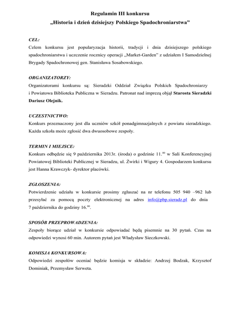 Regulamin III konkursu „Historia i dzień dzisiejszy Polskiego Spadochroniarstwa” CEL: Celem konkursu jest popularyzacja historii, tradycji i dnia dzisiejszego polskiego spadochroniarstwa i uczczenie rocznicy operacji „Market-Garden” z udziałem I Samodzielnej Brygady Spadochronowej gen. Stanisława Sosabowskiego. ORGANIZATORZY: Organizatorami konkursu są: Sieradzki Oddział Związku Polskich Spadochroniarzy i Powiatowa Biblioteka Publiczna w Sieradzu. Patronat nad imprezą objął Starosta Sieradzki Dariusz Olejnik. UCZESTNICTWO: Konkurs przeznaczony jest dla uczniów szkół ponadgimnazjalnych z powiatu sieradzkiego. Każda szkoła może zgłosić dwa dwuosobowe zespoły. TERMIN I MIEJSCE: Konkurs odbędzie się 9 października 2013r. (środa) o godzinie 11. 00 w Sali Konferencyjnej Powiatowej Biblioteki Publicznej w Sieradzu, ul. Żwirki i Wigury 4. Gospodarzem konkursu jest Hanna Krawczyk- dyrektor placówki. ZGŁOSZENIA: Potwierdzenie udziału w konkursie prosimy zgłaszać na nr telefonu 505 940 –962 lub przesyłać za pomocą poczty elektronicznej na adres [email protected] do dnia 7 października do godziny 16.00. SPOSÓB PRZEPROWADZENIA: Zespoły biorące udział w konkursie odpowiadać będą pisemnie na 30 pytań. Czas na odpowiedzi wynosi 60 min. Autorem pytań jest Władysław Sieczkowski. KOMISJA KONKURSOWA: Odpowiedzi zespołów oceniać będzie komisja w składzie: Andrzej Bodzak, Krzysztof Dominiak, Przemysław Serweta. NAGRODY: Zwycięzcy otrzymują dla szkoły Puchar Starosty Sieradzkiego. Trzy najlepsze zespoły nagrody rzeczowe, każdy zespół otrzyma pamiątkowy dyplom. Wyniki konkursu i materiał zdjęciowy umieszczone będą na stronie internetowej biblioteki www.pbp.sieradz.pl i przekazane lokalnym mediom. LAUREACI KONKURSÓW: I. 1.. Martyna Bogusławska, Milena Wysota - I LO w Sieradzu 2. Marcin Gryka, Hubert Kubielski - ZSP nr 1 w Sieradzu 3. Mariusz Kikowski, Artur Świniarski - ZSP nr 2 w Sieradzu 1. Martyna Bogusławska, Milena Wysota - I LO w Sieradzu 2. Krzysztof Góral, Hubert Kubielski - ZSP nr 1 w Sieradzu 3. Maria Krawczyk, Aleksandra Walkówka - I LO w Sieradzu II. INNE: • Organizatorzy nie zwracają kosztów przejazdu • W czasie trwania konkursu nie można korzystać z telefonów komórkowych • Wszystkie ewentualne sprawy sporne nie objęte niniejszym regulaminem rozstrzygają organizatorzy Polecana literatura: • Miętki Jan, Zarębski Stefan: „Na ziemią i w podziemiu” • Rozłubirski Edwin: „Kto, kiedy, dlaczego w spadochroniarstwie” • Tucholski Jerzy: „Cichociemni” Organizatorzy