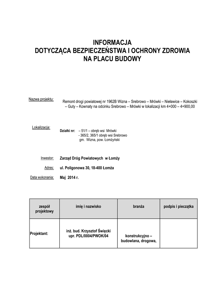INFORMACJA DOTYCZĄCA BEZPIECZEŃSTWA I OCHRONY ZDROWIA NA PLACU BUDOWY Nazwa projektu: Lokalizacja: Inwestor: Adres: Data wykonania: zespół projektowy Projektant: Remont drogi powiatowej nr 1962B Wizna – Srebrowo – Mrówki – Nieławice – Kokoszki – Guty – Kownaty na odcinku Srebrowo – Mrówki w lokalizacji km 4+000 – 4+900,00 Działki nr: – 51/1 – obręb wsi Mrówki - 365/2, 365/1 obręb wsi Srebrowo gm. Wizna, pow. Łomżyński Zarząd Dróg Powiatowych w Łomży ul. Poligonowa 30, 18-400 Łomża Maj 2014 r. imię i nazwisko inż. bud. Krzysztof Święcki upr. PDL/0004/PWOK/04 branża konstrukcyjno – budowlana, drogowa, podpis i pieczątka 1. ZAKRES ROBÓT W ramach przedsięwzięcia planuje się remont drogi poprzez odtworzenie nawierzchni jezdni z betonu asfaltowego, uzupełnienie nawierzchni poboczy oraz zjazdów i pola uprawne. Poprawie ulegnie również stan odwodnienia i bezpieczeństwa ruchu. Szczegółowy opis robót zawiera projekt budowlany. 2. ISTNIEJĄCE OBIEKTY BUDOWLANE Plac budowy stanowi pas drogi powiatowej na którym poza elementami drogi nie ma innych obiektów budowlanych. 3 . K O L E JNO ŚĆ W Y KON Y WAN YC H ROBÓT I Z AG RO ŻEN IA WYST EPU JĄC E POD CZ A S I CH R EA LIZ AC JI, SK ALA I RODZ AJE ZAGRO ŻE Ń W czasie opracowywania niniejszej informacji wykonawca robót nie jest jeszcze znany. Kolejność wykonywania robót jest następująca: 3.1. zagospodarowanie placu budowy 3.2. roboty ziemne 3.3. właściwe roboty budowlane 3.4. roboty wykończeniowe 3.5. maszyny i urządzenia techniczne użytkowane na placu budowy ad .3.1 Z agospod arowanie p l acu budow y Zagospodarowanie terenu budowy wykonuje się przed rozpoczęciem robót budowlanych, co najmniej w zakresie: a) oznakowania terenu i wyznaczenia stref niebezpiecznych, b) wykonania dróg, wyjść i przejść dla pieszych, c) urządzenia pomieszczeń higieniczno-sanitarnych i socjalnych, d) zapewnienia łączności telefonicznej, e) urządzenia składowisk materiałów i wyrobów W zależności od rodzaju i zakresu, roboty w pasie drogowym prowadzi się przy: 1) zamkniętym ruchu na drodze lub 2) wyłączeniu z ruchu drogowego części jezdni, pasa ruchu jezdni albo jego części, lub 3) ograniczonej prędkości pojazdów poruszających się na remontowanym odcinku jezdni, w przypadku gdy roboty są prowadzone na poboczu drogi, w rowie lub na przydrożnych skarpach. W warunkach ograniczonej widoczności miejsce pracy maszyn roboczych oświetla się. W czasie przerw w pracy oraz po zakończeniu pracy maszyny robocze zabezpiecza się przed ich przypadkowym uruchomieniem przez osoby nieupoważnione lub niezatrudnione przy tych pracach. Teren budowy lub robót powinien być w miarę potrzeby ogrodzony lub skutecznie zabezpieczony przed osobami postronnymi. Dla pojazdów używanych w trakcie wykonywania robót budowlanych należy wyznaczyć i oznakować miejsca postojowe na terenie budowy. Żurawie samojezdne, koparki i inne urządzenia ruchome, które mogą zbliżyć się na niebezpieczną odległość do w/w napowietrznych lub kablowych linii elektroenergetycznych, powinny być wyposażone w sygnalizatory napięcia. Na terenie budowy powinny być urządzone i wydzielone pomieszczenia higieniczno – sanitarne i socjalne – szatnie (na odzież roboczą i ochronną), umywalnie, jadalnie, suszarnie oraz ustępy. Dopuszczalne jest korzystanie z istniejących na terenie budowy pomieszczeń i urządzeń higieniczno – sanitarnych inwestora, jeżeli przewiduje to zawarta umowa. Na terenie budowy powinny być wyznaczone oznakowane, utwardzone i odwodnione miejsca do składania materiałów i wyrobów. Teren budowy powinien być wyposażony w sprzęt niezbędny do gaszenia pożarów, który powinien być regularnie sprawdzany, konserwowany i uzupełniany, zgodnie z wymaganiami producentów i przepisów przeciwpożarowych. Ilość i rozmieszczenie gaśnic przenośnych powinno być zgodne z wymaganiami przepisów przeciwpożarowych. Ad .3.2. Robot y ziemn e Zagrożenia występujące przy wykonywaniu robót ziemnych: upadek pracownika lub osoby postronnej do wykopu (brak wygrodzenia wykopu balustradami; brak przykrycia wykopu), zasypanie pracownika w wykopie wąskoprzestrzennym (brak zabezpieczenia ścian wykopu przed obsunięciem się; obciążenie klina naturalnego odłamu gruntu urobkiem pochodzącym z wykopu), potrącenie pracownika lub osoby postronnej łyżką koparki przy wykonywaniu robót na placu budowy lub w miejscu dostępnym dla osób postronnych (brak wygrodzenia strefy niebezpiecznej). Roboty ziemne powinny być prowadzone na podstawie projektu określającego położenie instalacji i urządzeń podziemnych, mogących znaleźć się w zasięgu prowadzonych robót. Wykonywanie robót ziemnych w bezpośrednim sąsiedztwie sieci powinno być poprzedzone określeniem przez kierownika budowy bezpiecznej odległości w jakiej mogą być one wykonywane od istniejącej sieci i sposobu wykonywania tych robót. W czasie wykonywania robót ziemnych miejsca niebezpieczne należy ogrodzić i umieścić napisy ostrzegawcze. W czasie wykonywania wykopów w miejscach dostępnych dla osób niezatrudnionych przy tych robotach, należy wokół wykopów pozostawionych na czas zmroku i w nocy ustawić balustrady zaopatrzone w światło ostrzegawcze koloru czerwonego. Podcinanie lub wycinanie drzew rosnących w pobliżu napowietrznych linii energetycznych, wiatrołomów, drzew spróchniałych, rosnących na stromych skarpach i na terenie zabudowanym wykonuje się pod nadzorem i przez co najmniej dwóch pracowników. Ad .3.3. i 3.4. Robo ty budow lane i robot y wyko ń c ze n iow e Zagrożenia występujące przy wykonywaniu robót budowlanych: - pochwycenie kończyn przez napęd maszyn (brak pełnej osłony napędu), - potrącenie pracownika lub osoby postronnej łyżką koparki przy wykonywaniu robót na placu budowy lub w miejscu dostępnym dla osób postronnych (brak wygrodzenia strefy niebezpieczne