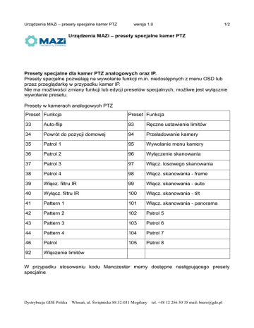 Urządzenia MAZi – presety specjalne kamer PTZ wersja 1.0 1/2 Urządzenia MAZi – presety specjalne kamer PTZ Presety specjalne dla kamer PTZ analogowych oraz IP. Presety specjalne pozwalają na wywołanie funkcji m.in. niedostępnych z menu OSD lub przez przeglądarkę w przypadku kamer IP. Nie ma możliwości zmiany funkcji lub edycji presetów specjalnych, możliwe jest wyłącznie wywołanie presetu. Presety w kamerach analogowych PTZ Preset Funkcja Preset Funkcja 33 Auto-flip 93 Ręczne ustawienie limitów 34 Powrót do pozycji domowej 94 Przeładowanie kamery 35 Patrol 1 95 Wywołanie menu kamery 36 Patrol 2 96 Wyłączenie skanowania 37 Patrol 3 97 Włącz. losowego skanowania 38 Patrol 4 98 Włącz. skanowania - frame 39 Włącz. filtru IR 99 Włącz. skanowania - auto 40 Wyłącz. filtru IR 100 Włącz. skanowania - tilt 41 Pattern 1 101 Włącz. skanowania - panorama 42 Pattern 2 102 Patrol 5 43 Pattern 3 103 Patrol 6 44 Pattern 4 104 Patrol 7 46 Patrol 105 Patrol 8 92 Włączenie limitów W przypadku stosowaniu kodu Manczester mamy dostępne następującego presety specjalne Dystrybucja GDE Polska Włosań, ul. Świątnicka 88 32-031 Mogilany tel. +48 12 256 50 35 mail: [email protected] Urządzenia MAZi – presety specjalne kamer PTZ wersja 1.0 Ustawienie Funkcja Presetu Wywołanie Funkcja Preset 65 Przeładowanie kamery 67 Auto-flip 66 Wywołanie menu kamery 69 Zakończenie rejestracji pattern 70 Zapisanie Pattern 1 70 Wywołanie Pattern 1 71 Zapisanie Pattern 2 71 Wywołanie Pattern 2 72 Zapisanie Pattern 3 72 Wywołanie Pattern 3 Presety w kamerach IPPTZ Preset Funkcja Preset Funkcja 94 Ponowne uruchomienie 111 Zarezerwowane 95 Zarezerwowane 112 Włącz. parkowowanie - preset 1 96 Wyłącz. skanowania 113 Włącz. parkowowanie - preset 2 97 Włącz. losowego skanowania 114 Włącz. parkowowanie - preset 3 98 Włącz. skanowania - frame 115 Włącz. parkowowanie - preset 4 99 Włącz. skanowania - pan 116 Włącz. parkowowanie - preset 5 100 Włącz. skanowania - tilt 117 Włącz. parkowowanie - preset 6 101 Włącz. skanowania - panorama 118 Włącz. parkowowanie - preset 7 102 Wyłącz. parkowania 119 Włącz. parkowowanie - preset 8 103 Włącz. parkow. - skanowanie pan 125 Włącz wentylator z załącz. temperaturą 104 Włącz. parkow. - skanowanie tilt 126 Włącz wentylator 105 Włącz. parkow. - skanow. panorama 127 Wyłącz wentylator 106 Włącz. parkow. - skanowanie frame 130 Rozpocznij pattern 107 Włącz. parkow. - skanow. losowe 131 Zatrzymaj pattern 108 Włącz. parkow. - skanow. pattern 132 Wywołaj pattern 109 Zarezerwowane 200 Resetuj ustawienia PTZ 110 Zarezerwowane Dystrybucja GDE Polska Włosań, ul. Świątnicka 88 32-031 Mogilany tel. +48 12 256 50 35 mail: [email protected] 2/2