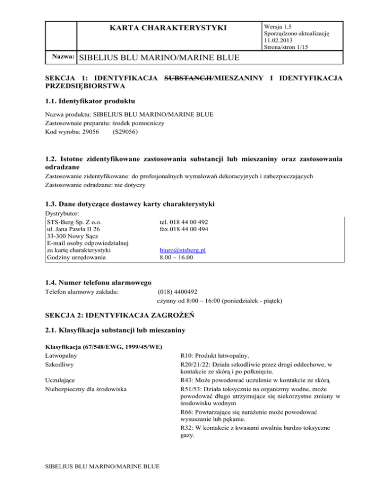 KARTA CHARAKTERYSTYKI Nazwa: Wersja 1.5 Sporządzono aktualizację 11.02.2013 Strona/stron 1/15 SIBELIUS BLU MARINO/MARINE BLUE SEKCJA 1: IDENTYFIKACJA SUBSTANCJI/MIESZANINY I IDENTYFIKACJA PRZEDSIĘBIORSTWA 1.1. Identyfikator produktu Nazwa produktu: SIBELIUS BLU MARINO/MARINE BLUE Zastosownaie preparatu: środek pomocniczy Kod wyrobu: 29056 (S29056) 1.2. Istotne zidentyfikowane zastosowania substancji lub mieszaniny oraz zastosowania odradzane Zastosowanie zidentyfikowane: do profesjonalnych wymalowań dekoracyjnych i zabezpieczających Zastosowanie odradzane: nie dotyczy 1.3. Dane dotyczące dostawcy karty charakterystyki Dystrybutor: STS-Berg Sp. Z o.o. ul. Jana Pawła II 26 33-300 Nowy Sącz E-mail osoby odpowiedzialnej za kartę charakterystyki Godziny urzędowania tel. 018 44 00 492 fax.018 44 00 494 [email protected] 8.00 – 16.00 1.4. Numer telefonu alarmowego Telefon alarmowy zakładu: (018) 4400492 czynny od 8:00 – 16:00 (poniedziałek - piątek) SEKCJA 2: IDENTYFIKACJA ZAGROŻEŃ 2.1. Klasyfikacja substancji lub mieszaniny Klasyfikacja (67/548/EWG, 1999/45/WE) Łatwopalny Szkodliwy Uczulające Niebezpieczny dla środowiska SIBELIUS BLU MARINO/MARINE BLUE R10: Produkt łatwopalny. R20/21/22: Działa szkodliwie przez drogi oddechowe, w kontakcie ze skórą i po połknięciu. R43: Może powodować uczulenie w kontakcie ze skórą. R51/53: Działa toksycznie na organizmy wodne, może powodować długo utrzymujące się niekorzystne zmiany w środowisku wodnym R66: Powtarzające się narażenie może powodować wysuszanie lub pękanie. R32: W kontakcie z kwasami uwalnia bardzo toksyczne gazy. KARTA CHARAKTERYSTYKI Nazwa: Wersja 1.5 Sporządzono aktualizację 11.02.2013 Strona/stron 2/15 SIBELIUS BLU MARINO/MARINE BLUE 2.2. Elementy oznakowania Zgodnie z dyrektywą 1999/45/WE Xn (produkt szkodliwy) N (produkt niebezpieczny dla środowiska) Składniki niebezpieczne: Tiocyjanian miedzi, kalafonia, N-tert-butyl-N-cyklopropyl-6-(metylio)-1,3,5-triazin-2,4-damin Zwroty R produkt łatwopalny, działa szkodliwie przez drogi oddechowe, w kontakcie ze skórą i po połknięciu, w kontakcie z kwasami uwalnia bardzo toksyczne gazy, może powodować uczulenie w kontakcie ze skórą, działa toksycznie na organizmy wodne; może powodować długo utrzymujące się niekorzystne zmiany w środowisku wodnym, powtarzające się narażenie może powodować wysuszanie lub pekanie skóry. Indeks ryzyka: R10 produkt łatwopalny R20/21/22 działa szkodliwie przez drogi oddechowe, w kontakcie ze skórą i po połknięciu R32 w kontakcie z kwasami uwalnia bardzo toksyczne gazy R51/53 działa toksycznie na organizmy wodne; moze powodowac długo utrzymujące się niekorzystne zmiany w środowisku wodnym R66 powtarzające się narażenie może powodowac wysuszanie lub pękanie skóry. Zwroty S przechowywać pojemnik szczelnie zamknięty, nosic odpowiednią odziez ochronną i odpowiednie rekawice ochronne, w przypadku awarii lub jeżeli źle się poczujesz, niezwłocznie zasięgnij porady lekarza-jeżeli to mozliwe, pokaż etykietę. Uzywac odpwoiednich pojemników zapobiegających skażeniu środowiska, produkt i opakowanie usuwac jako odpad niebezpieczny. Indeks bezpieczeństwa: S7 przechowywac pojemnik szczelnie zamknięty S36/37 nosic odpowiednią odzież ochronną i odpowiednie rękawice ochronne, S45 w przypadku awarii lub jeżeli źle się poczujesz, niezwłocznie zasięgnij porady lekarza-jeżeli to mozliwe, pokaż etykietę S57 uzywać odpowiednich pojemników zapobiegających skażeniu środowiska S60 Produkt i opakowanie usuwac jako odpad niebezpieczny Zawartość cząstek stałych (nielotnych) – 73,95 % Zawartość VOC – 25,99 % SIBELIUS BLU MARINO/MARINE BLUE KARTA CHARAKTERYSTYKI Nazwa: Wersja 1.5 Sporządzono aktualizację 11.02.2013 Strona/stron 3/15 SIBELIUS BLU MARINO/MARINE BLUE Woda: 0,04% 2.3. Inne zagrożenia Nieznane. Dostarczony produkt nie stwarza zagrożeń. Wymagana informacja znajduje się w tej karcie Charakterystyki Niebezpiecznej Substancji Chemicznej. SEKCJA 3: SKŁAD/ INFORMACJA O SKŁADNIKACH 3.1. Substancje Nie dotyczy 3.2. Mieszaniny Składniki stwarzające zagrożenie: Nazwa substancji Nr CAS Nr WE Nr Rejestracji Ksylen – mieszanina izomerów 1330-20-7 215-535-7 01-2119488216-32 Mesitylen 108-67-8 203-604-4 n/d Klasyfikacja (67/548/EWG) Klasyfikacja (Rozporządzenie 1272/2008) Stężenie % (C.) 601-022-00-9 R10 Xn; R20/21 Xi; R38 Flam. Liq. 3; H226 Acute Tox. 4; H332 Acute Tox. 4; H312 Skin Irrit. 2; H315 >= 3 - < 5 601-025-00-5 R10 Xi; R37 N; R51-R53 Flam. Liq. 3; H226 STOT SE 3; H335 Aquatic Chronic 2; H411 >= 1 - < 3 Octan 2-metoksy-1-metyloetylu 108-65-6 203-603-9 01-2119475791-29 607-195-00-7 R10 Flam. Liq. 3; H226 >= 1 - < 3 Solwent nafta (ropa naftowa), weglowodory lekkie aromatyczne 64742-95-6 265-199-0 01-2119455851-35 649-356-00-4 R10 Xi; R37 N; R51/53 Xn; R65 R66, R67 Flam. Liq. 3; H226 STOT SE 3; H335,H336 Aquatic Chronic 2;H411 Asp. Tox. 1; H304 >= 10 - < 12,5 Kalafonia 8050-09-7 232-475-7 650-015-00-7 R43 Skin Sens. 1; H317 >= 7 - < 10 1,2,4-trimetylobenzen 95-63-6 202-436-9 n/d 601-043-00-3 R10 Xn; R20 Xi; R36/37/38 N; R51-R53 Flam. Liq. 3; H226 Acute Tox. 4; H332 Eye Irrit. 2; H319 STOT SE 3; H335 Skin Irrit. 2; H315 Aquatic Chronic 2; H411 >= 5 - < 7 Tlenek cynku 1314-13-2 215-222-5 01-2119463881-32 030-013-00-7 N; R50-R53 Aquatic Acute 1; H400 Aquatic Chronic 1; H410 >= 7 - < 10 N'-ert-butyl-N-cyklopropyl-6(methylio)-1,3,5-triazino-2,4diamin 28159-98-0 248-872-3 n/d - Xi; R43 N; R50/53 Skin Sens. 1; H317 Aquatic Acute 1; H400 Aquatic Chronic 1;H410 >= 1 - < 3 Tiocyjanian miedzi 1111-67-7 - Xn; R20/21/22 SIBELIUS BLU MARINO/MARINE BLUE Nr Indeksowy - >= 30 - < 50 KARTA CHARAKTERYSTYKI Nazwa: Wersja 1.5 Sporządzono aktualizację 11.02.2013 Strona/stron 4/15 SIBELIUS BLU MARINO/MARINE BLUE 214-183-1 n/d R32 numer rejestracji będzie dostępny po dokonaniu rejestracji przez producenta substancji Pełny tekst symboli ryzyka (R) znajduje się w sekcji 