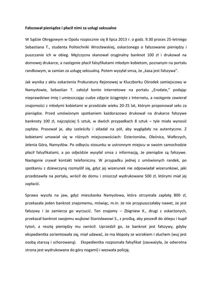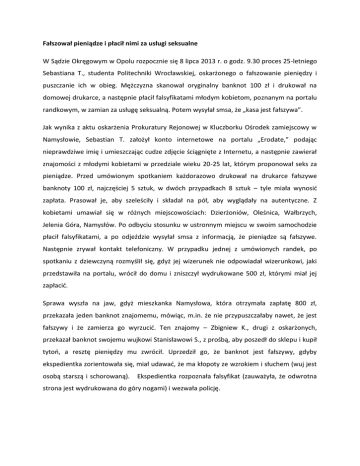 Fałszował pieniądze i płacił nimi za usługi seksualne W Sądzie Okręgowym w Opolu rozpocznie się 8 lipca 2013 r. o godz. 9.30 proces 25-letniego Sebastiana T., studenta Politechniki Wrocławskiej, oskarżonego o fałszowanie pieniędzy i puszczanie ich w obieg. Mężczyzna skanował oryginalny banknot 100 zł i drukował na domowej drukarce, a następnie płacił falsyfikatami młodym kobietom, poznanym na portalu randkowym, w zamian za usługę seksualną. Potem wysyłał smsa, że „kasa jest fałszywa”. Jak wynika z aktu oskarżenia Prokuratury Rejonowej w Kluczborku Ośrodek zamiejscowy w Namysłowie, Sebastian T. założył konto internetowe na portalu „Erodate,” podając nieprawdziwe imię i umieszczając cudze zdjęcie ściągnięte z Internetu, a następnie zawierał znajomości z młodymi kobietami w przedziale wieku 20-25 lat, którym proponował seks za pieniądze. Przed umówionym spotkaniem każdorazowo drukował na drukarce fałszywe banknoty 100 zł, najczęściej 5 sztuk, w dwóch przypadkach 8 sztuk – tyle miała wynosić zapłata. Prasował je, aby szeleściły i składał na pół, aby wyglądały na autentyczne. Z kobietami umawiał się w różnych miejscowościach: Dzierżoniów, Oleśnica, Wałbrzych, Jelenia Góra, Namysłów. Po odbyciu stosunku w ustronnym miejscu w swoim samochodzie płacił falsyfikatami, a po odjeździe wysyłał smsa z informacją, że pieniądze są fałszywe. Następnie zrywał kontakt telefoniczny. W przypadku jednej z umówionych randek, po spotkaniu z dziewczyną rozmyślił się, gdyż jej wizerunek nie odpowiadał wizerunkowi, jaki przedstawiła na portalu, wrócił do domu i zniszczył wydrukowane 500 zł, którymi miał jej zapłacić. Sprawa wyszła na jaw, gdyż mieszkanka Namysłowa, która otrzymała zapłatę 800 zł, przekazała jeden banknot znajomemu, mówiąc, m.in. że nie przypuszczałaby nawet, że jest fałszywy i że zamierza go wyrzucić. Ten znajomy – Zbigniew K., drugi z oskarżonych, przekazał banknot swojemu wujkowi Stanisławowi S., z prośbą, aby poszedł do sklepu i kupił tytoń, a resztę pieniędzy mu zwrócił. Uprzedził go, że banknot jest fałszywy, gdyby ekspedientka zorientowała się, miał udawać, że ma kłopoty ze wzrokiem i słuchem (wuj jest osobą starszą i schorowaną). Ekspedientka rozpoznała falsyfikat (zauważyła, że odwrotna strona jest wydrukowana do góry nogami) i wezwała policję. Oskarżony przyznał się do stawianych mu zarzutów. Za fałszowanie pieniędzy grozi kara nie krótsza od lat pięciu, albo 25 lat pozbawienia wolności. Za puszczenie w obieg fałszywych pieniędzy grozi od roku do 10 lat pozbawienia wolności.