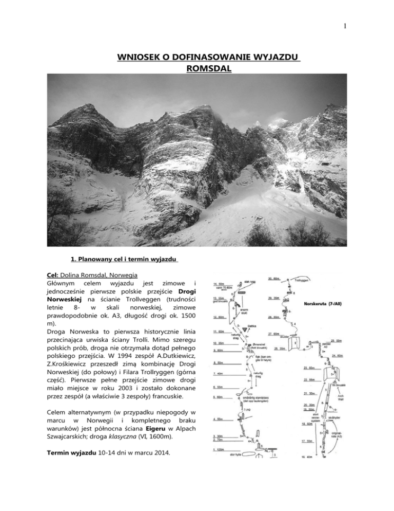 1 WNIOSEK O DOFINASOWANIE WYJAZDU ROMSDAL 1. Planowany cel i termin wyjazdu Cel: Dolina Romsdal, Norwegia Głównym celem wyjazdu jest zimowe i jednocześnie pierwsze polskie przejście Drogi Norweskiej na ścianie Trollveggen (trudności letnie 8w skali norweskiej, zimowe prawdopodobnie ok. A3, długość drogi ok. 1500 m). Droga Norweska to pierwsza historycznie linia przecinająca urwiska ściany Trolli. Mimo szeregu polskich prób, droga nie otrzymała dotąd pełnego polskiego przejścia. W 1994 zespół A.Dutkiewicz, Z.Krośkiewicz przeszedł zimą kombinację Drogi Norweskiej (do połowy) i Filara Trollryggen (górna część). Pierwsze pełne przejście zimowe drogi miało miejsce w roku 2003 i zostało dokonane przez zespół (a właściwie 3 zespoły) francuskie. Celem alternatywnym (w przypadku niepogody w marcu w Norwegii i kompletnego braku warunków) jest północna ściana Eigeru w Alpach Szwajcarskich; droga klasyczna (VI, 1600m). Termin wyjazdu 10-14 dni w marcu 2014. 2 2. Skład wyjazdu Krzysztof Banasik ((UKA Warszawa, nr karty 415) Jakub Radziejowski (UKA Warszawa, nr karty taternika 3630) Wykazy przejść dostępne są w bazie internetowej PZA 3. Kosztorys wyjazdu Prom: ok. 1200/1300 PLN w obie strony Paliwo: ok. 1600/1800 PLN w obie strony Noclegi ok. 2000 PLN Jedzenie: ok. 1000 PLN Łącznie koszt wyjazdu to ok. 6100 PLN, czyli ok. 3000 PLN na osobę 4. Zasady finansowania Planujemy wyłącznie udział własny oprócz tego, co dostaniemy w ramach dofinansowania z PZA, Oczekiwane dofinansowanie z PZA na osobę: 1800 PLN 5. Informacje o otrzymanych w przeszłości dofinansowaniach z PZA Krzysztof Banasik posiada doświadczenie letnie i zimowe ze wspinaczek w Alpach i Tatrach. Stale rozwija poziom sportowy i górski. Uczestniczył w wyjeździe na skalne drogi wielowyciągowe na wys. ok. 5000m n.p.m. do Indii w 2009 gdzie nabrał doświadczenia wyprawowego oraz do Kirgiozjii w 2012 roku. Jest członkiem Grupy Młodzieżowej PZA. Jakub Radziejowski – 1998 (Alpy), 2001 (Alpy), 2002 (Norwegia i wyprawa na Alaskę), 2003 (Alpy), 2004 (Alpy i Patagonia), 2005(Alpy), 2006 (Alpy i Karakorum), 2008 (Himalaje), 2012 (Patagonia) Z taternickim pozdrowieniem Krzysztof Banasik Jakub Radziejowski