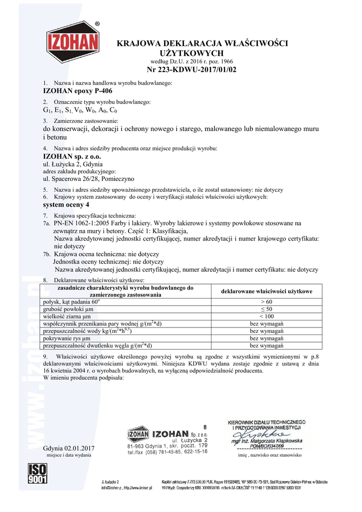 KRAJOWA DEKLARACJA WŁAŚCIWOŚCI UŻYTKOWYCH według Dz.U. z 2016 r. poz. 1966 Nr 223-KDWU-2017/01/02 1. Nazwa i nazwa handlowa wyrobu budowlanego: IZOHAN epoxy P-406 2. Oznaczenie typu wyrobu budowlanego: G1, E1, S1, V0, W0, A0, C0 3. Zamierzone zastosowanie: do konserwacji, dekoracji i ochrony nowego i starego, malowanego lub niemalowanego muru i betonu 4. Nazwa i adres siedziby producenta oraz miejsce produkcji wyrobu: IZOHAN sp. z o.o. ul. Łużycka 2, Gdynia adres zakładu produkcyjnego: ul. Spacerowa 26/28, Pomieczyno 5. 6. Nazwa i adres siedziby upoważnionego przedstawiciela, o ile został ustanowiony: nie dotyczy Krajowy system zastosowany do oceny i weryfikacji stałości właściwości użytkowych: system oceny 4 7. Krajowa specyfikacja techniczna: 7a. PN-EN 1062-1:2005 Farby i lakiery. Wyroby lakierowe i systemy powłokowe stosowane na zewnątrz na mury i betony. Część 1: Klasyfikacja, Nazwa akredytowanej jednostki certyfikującej, numer akredytacji i numer krajowego certyfikatu: nie dotyczy 7b. Krajowa ocena techniczna: nie dotyczy Jednostka oceny technicznej: nie dotyczy Nazwa akredytowanej jednostki certyfikującej, numer akredytacji i numer certyfikatu: nie dotyczy 8. Deklarowane właściwości użytkowe: zasadnicze charakterystyki wyrobu budowlanego do zamierzonego zastosowania połysk, kąt padania 60o grubość powłoki μm wielkość ziarna μm współczynnik przenikania pary wodnej g/(m2*d) przepuszczalność wody kg/(m2*h0,5) pokrywanie rys μm przepuszczalność dwutlenku węgla g/(m2*d) deklarowane właściwości użytkowe > 60 ≤ 50 < 100 bez wymagań bez wymagań bez wymagań bez wymagań 9. Właściwości użytkowe określonego powyżej wyrobu są zgodne z wszystkimi wymienionymi w p.8 deklarowanymi właściwościami użytkowymi. Niniejsza KDWU wydana zostaje zgodnie z ustawą z dnia 16 kwietnia 2004 r. o wyrobach budowalnych, na wyłączną odpowiedzialność producenta. W imieniu producenta podpisała: Gdynia 02.01.2017 --------------------------- miejsce i data wydania imię , nazwisko oraz stanowisko