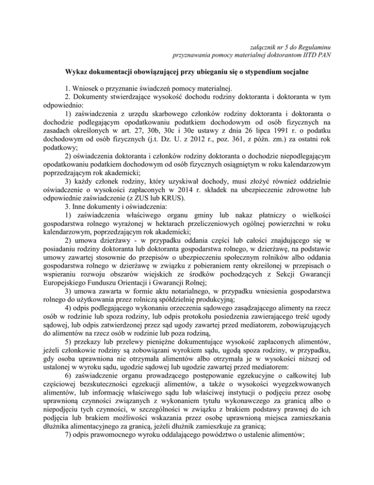 załącznik nr 5 do Regulaminu przyznawania pomocy materialnej doktorantom IITD PAN Wykaz dokumentacji obowiązującej przy ubieganiu się o stypendium socjalne 1. Wniosek o przyznanie świadczeń pomocy materialnej. 2. Dokumenty stwierdzające wysokość dochodu rodziny doktoranta i doktoranta w tym odpowiednio: 1) zaświadczenia z urzędu skarbowego członków rodziny doktoranta i doktoranta o dochodzie podlegającym opodatkowaniu podatkiem dochodowym od osób fizycznych na zasadach określonych w art. 27, 30b, 30c i 30e ustawy z dnia 26 lipca 1991 r. o podatku dochodowym od osób fizycznych (j.t. Dz. U. z 2012 r., poz. 361, z późn. zm.) za ostatni rok podatkowy; 2) oświadczenia doktoranta i członków rodziny doktoranta o dochodzie niepodlegającym opodatkowaniu podatkiem dochodowym od osób fizycznych osiągniętym w roku kalendarzowym poprzedzającym rok akademicki; 3) każdy członek rodziny, który uzyskiwał dochody, musi złożyć również oddzielnie oświadczenie o wysokości zapłaconych w 2014 r. składek na ubezpieczenie zdrowotne lub odpowiednie zaświadczenie (z ZUS lub KRUS). 3. Inne dokumenty i oświadczenia: 1) zaświadczenia właściwego organu gminy lub nakaz płatniczy o wielkości gospodarstwa rolnego wyrażonej w hektarach przeliczeniowych ogólnej powierzchni w roku kalendarzowym, poprzedzającym rok akademicki; 2) umowa dzierżawy - w przypadku oddania części lub całości znajdującego się w posiadaniu rodziny doktoranta lub doktoranta gospodarstwa rolnego, w dzierżawę, na podstawie umowy zawartej stosownie do przepisów o ubezpieczeniu społecznym rolników albo oddania gospodarstwa rolnego w dzierżawę w związku z pobieraniem renty określonej w przepisach o wspieraniu rozwoju obszarów wiejskich ze środków pochodzących z Sekcji Gwarancji Europejskiego Funduszu Orientacji i Gwarancji Rolnej; 3) umowa zawarta w formie aktu notarialnego, w przypadku wniesienia gospodarstwa rolnego do użytkowania przez rolniczą spółdzielnię produkcyjną; 4) odpis podlegającego wykonaniu orzeczenia sądowego zasądzającego alimenty na rzecz osób w rodzinie lub spoza rodziny, lub odpis protokołu posiedzenia zawierającego treść ugody sądowej, lub odpis zatwierdzonej przez sąd ugody zawartej przed mediatorem, zobowiązujących do alimentów na rzecz osób w rodzinie lub poza rodziną, 5) przekazy lub przelewy pieniężne dokumentujące wysokość zapłaconych alimentów, jeżeli członkowie rodziny są zobowiązani wyrokiem sądu, ugodą spoza rodziny, w przypadku, gdy osoba uprawniona nie otrzymała alimentów albo otrzymała je w wysokości niższej od ustalonej w wyroku sądu, ugodzie sądowej lub ugodzie zawartej przed mediatorem: 6) zaświadczenie organu prowadzącego postępowanie egzekucyjne o całkowitej lub częściowej bezskuteczności egzekucji alimentów, a także o wysokości wyegzekwowanych alimentów, lub informację właściwego sądu lub właściwej instytucji o podjęciu przez osobę uprawnioną czynności związanych z wykonaniem tytułu wykonawczego za granicą albo o niepodjęciu tych czynności, w szczególności w związku z brakiem podstawy prawnej do ich podjęcia lub brakiem możliwości wskazania przez osobę uprawnioną miejsca zamieszkania dłużnika alimentacyjnego za granicą, jeżeli dłużnik zamieszkuje za granicą; 7) odpis prawomocnego wyroku oddalającego powództwo o ustalenie alimentów; 8) orzeczenie sądu zobowiązujące jednego z rodziców do ponoszenia całkowitych kosztów utrzymania dziecka; 9) odpis zupełny aktu urodzenia, w przypadku gdy ojciec jest nieznany; 10) odpis prawomocnego wyroku sądu rodzinnego stwierdzającego przysposobienie lub zaświadczenie sądu rodzinnego lub ośrodka adopcyjno-opiekuńczego o prowadzonym postępowaniu sądowym w sprawie o przysposobienie dziecka; odpis prawomocnego wyroku sądu rodzinnego orzekającego rozwód lub separację albo akt zgonu małżonka lub rodzica doktoranta – w przypadku osoby samotnie wychowującej dziecko; 11) dokument określający datę utraty dochodu oraz miesięczną wysokość utraconego dochodu przez doktoranta lub członka rodziny doktoranta; 12) dokument określający wysokość dochodu uzyskanego przez doktoranta lub członka rodziny doktoranta, w przypadku uzyskania dochodu w roku kalendarzowym poprzedzającym rok akademicki określający również liczbę miesięcy, w których dochód był osiągany; 13) orzeczenie o niepełnosprawności lub stopniu niepełnosprawności doktoranta lub członków rodziny doktoranta powyżej 18 roku życia, o ile nie uczą się i pozostają na utrzymaniu doktoranta lub rodziny doktoranta; 14) zaświadczenie z urzędu pracy potwierdzające fakt pozostawania bez pracy z prawem lub bez prawa do zasiłku w przypadku bezrobotnych członków rodziny doktoranta. Zaświadczenie takie jest bezwzględnie wymagane również, w przypadku utraty dochodu. Zaświadczenie takie musi zawierać informacje o wysokości uzyskiwanego zasiłku lub stypendium dla bezrobotnych i okresie jego otrzymywania; 15) zaświadczenie pracodawcy o terminie urlopu wychowawczego członka rodziny doktoranta i okresie na jaki został on udzielony oraz o okresach zatrudnienia; 16) zaświadczenie o uczęszczaniu do szkoły lub szkoły wyższej rodzeństwa lub dzieci wnioskodawcy do 26 roku życia. Istnienie rodzeństwa lub dzieci do 18 roku życia, w przypadku nieuczęszczania do szkoły należy udokumentować odpisem skróconym aktu urodzenia; 17) zaświadczenie o wysokości dochodów członka rodziny doktoranta lub doktoranta w przypadku, jeśli osiągał on dochody poza granicami Rzeczypospolitej Polskiej w roku kalendarzowym, z którego ustala się dochód. 4. Pozostałe niezbędne dokumenty konieczne do ustalenia dochodu w rodzinie doktoranta lub poświadczające jego sytuację rodzinną (np. zaświadczenie o otrzymywaniu zasiłków z ośrodka pomocy społecznej, zaświadczenie z policji o zaginięciu członka rodziny doktoranta, zaświadczenie o 