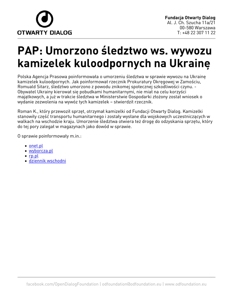 Fundacja Otwarty Dialog Al. J. Ch. Szucha 11a/21 00-580 Warszawa T: +48 22 307 11 22 PAP: Umorzono śledztwo ws. wywozu kamizelek kuloodpornych na Ukrainę Polska Agencja Prasowa poinformowała o umorzeniu śledztwa w sprawie wywozu na Ukrainę kamizelek kuloodpornych. Jak poinformował rzecznik Prokuratury Okręgowej w Zamościu, Romuald Sitarz, śledztwo umorzono z powodu znikomej społecznej szkodliwości czynu. Obywatel Ukrainy kierował się pobudkami humanitarnymi, nie miał na celu korzyści majątkowych, a już w trakcie śledztwa w Ministerstwie Gospodarki złożony został wniosek o wydanie zezwolenia na wywóz tych kamizelek – stwierdził rzecznik. Roman K., który przewoził sprzęt, otrzymał kamizelki od Fundacji Otwarty Dialog. Kamizelki stanowiły część transportu humanitarnego i zostały wysłane dla wojskowych uczestniczących w walkach na wschodzie kraju. Umorzenie śledztwa otwiera też drogę do odzyskania sprzętu, który do tej pory zalegał w magazynach jako dowód w sprawie. O sprawie poinformowały m.in.: onet.pl wyborcza.pl rp.pl dziennik wschodni facebook.com/OpenDialogFoundation | [email protected] | www.odfoundation.eu